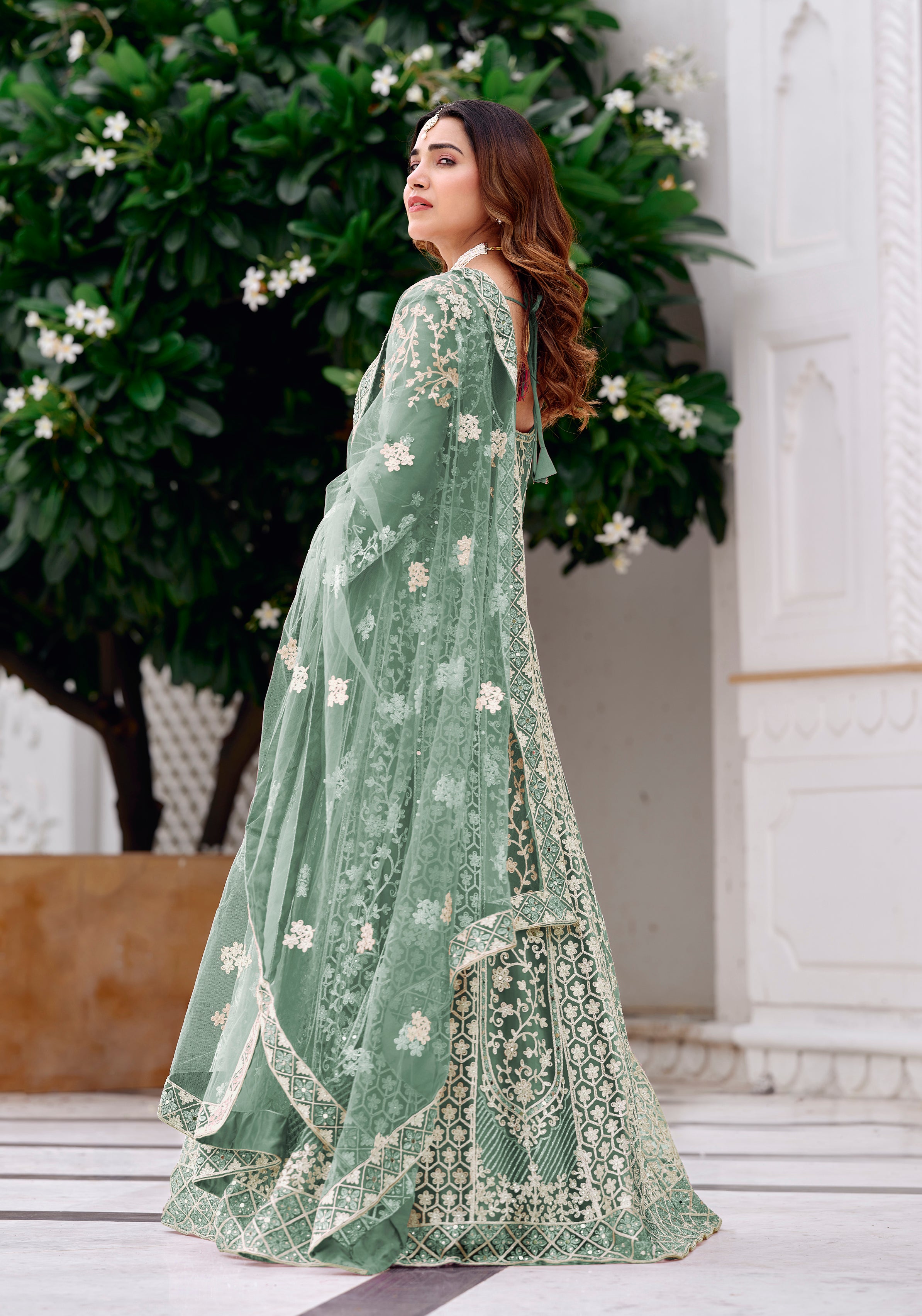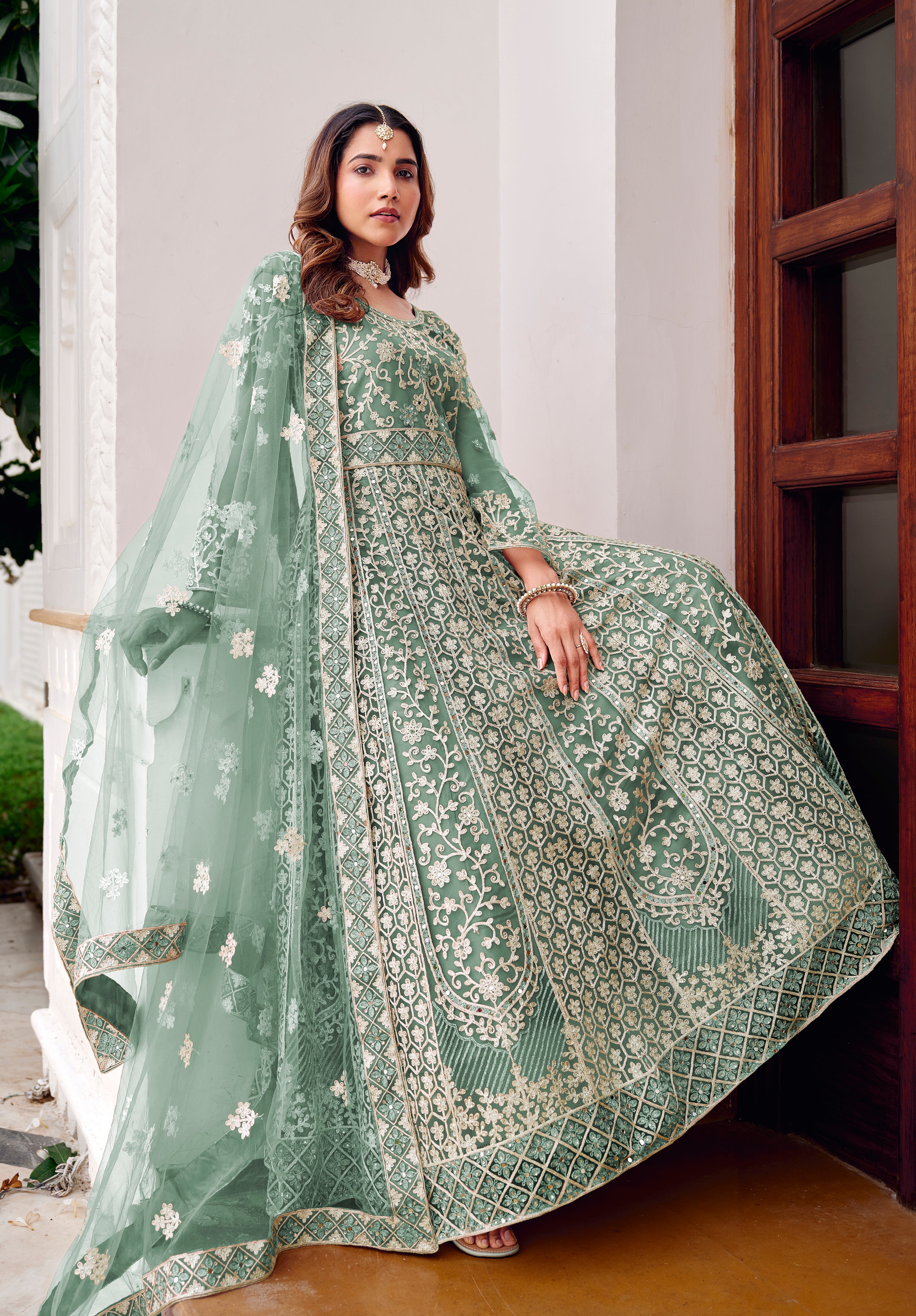 Vogue and pattern will be on the peak of your magnificence as soon as you attire this Light Teal net readymade trendy gown . Beautified with embroidered, mirror and stone work all synchronized nicely with the design and style of the attire. (Slight variation in color, fabric & work is possible. Model images are only representative.)