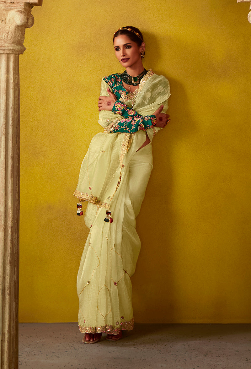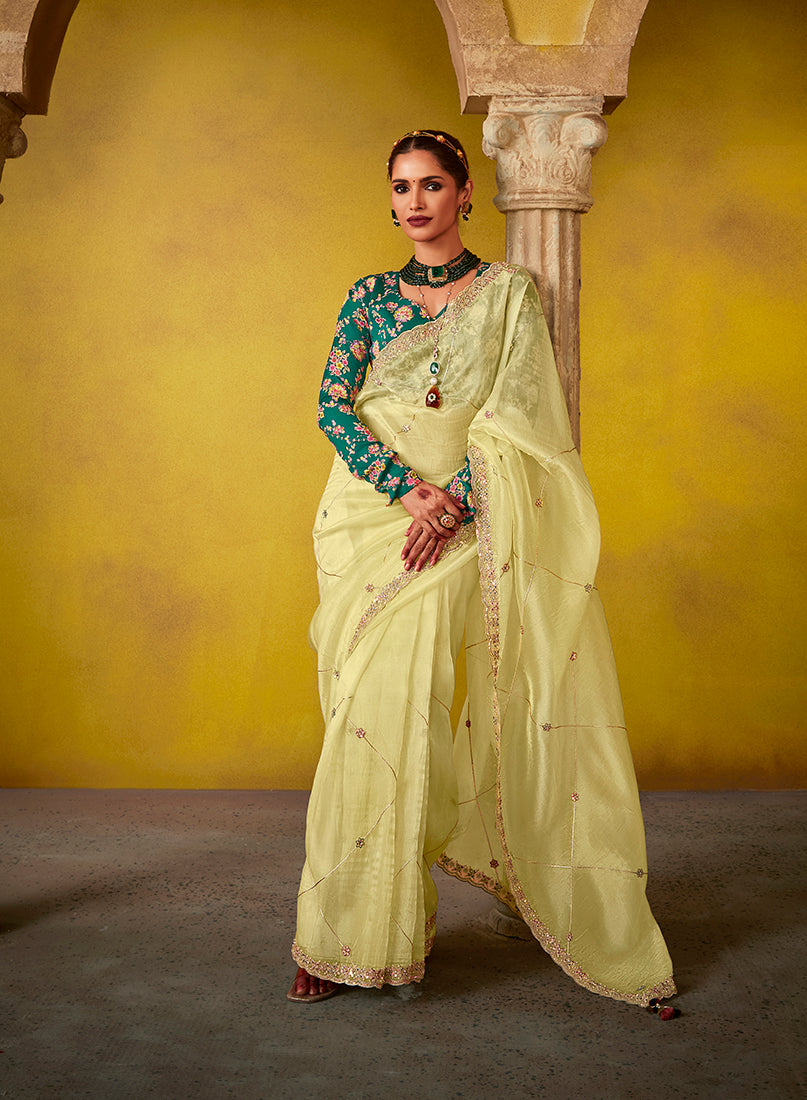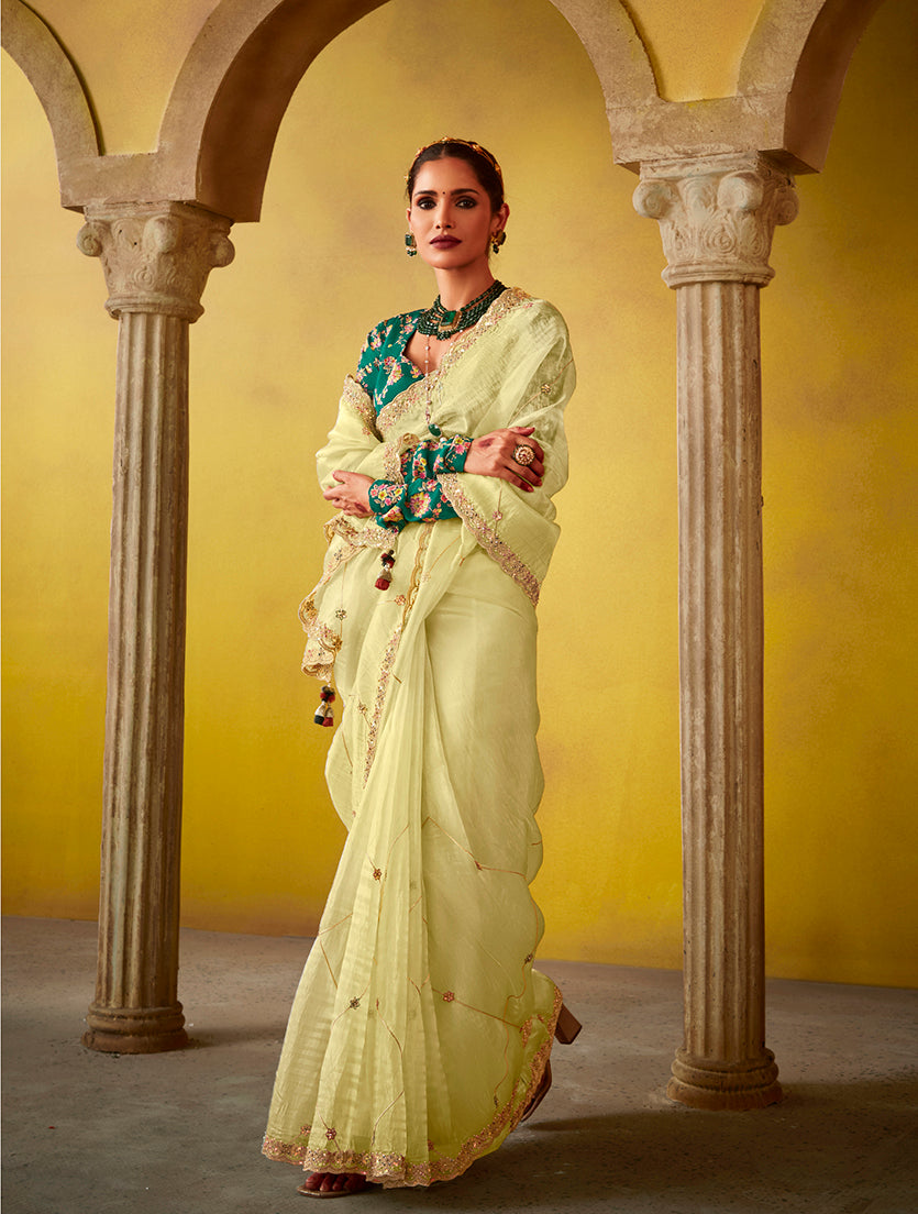 Saree Colour : Light Yellow || Blouse Colour : Teal