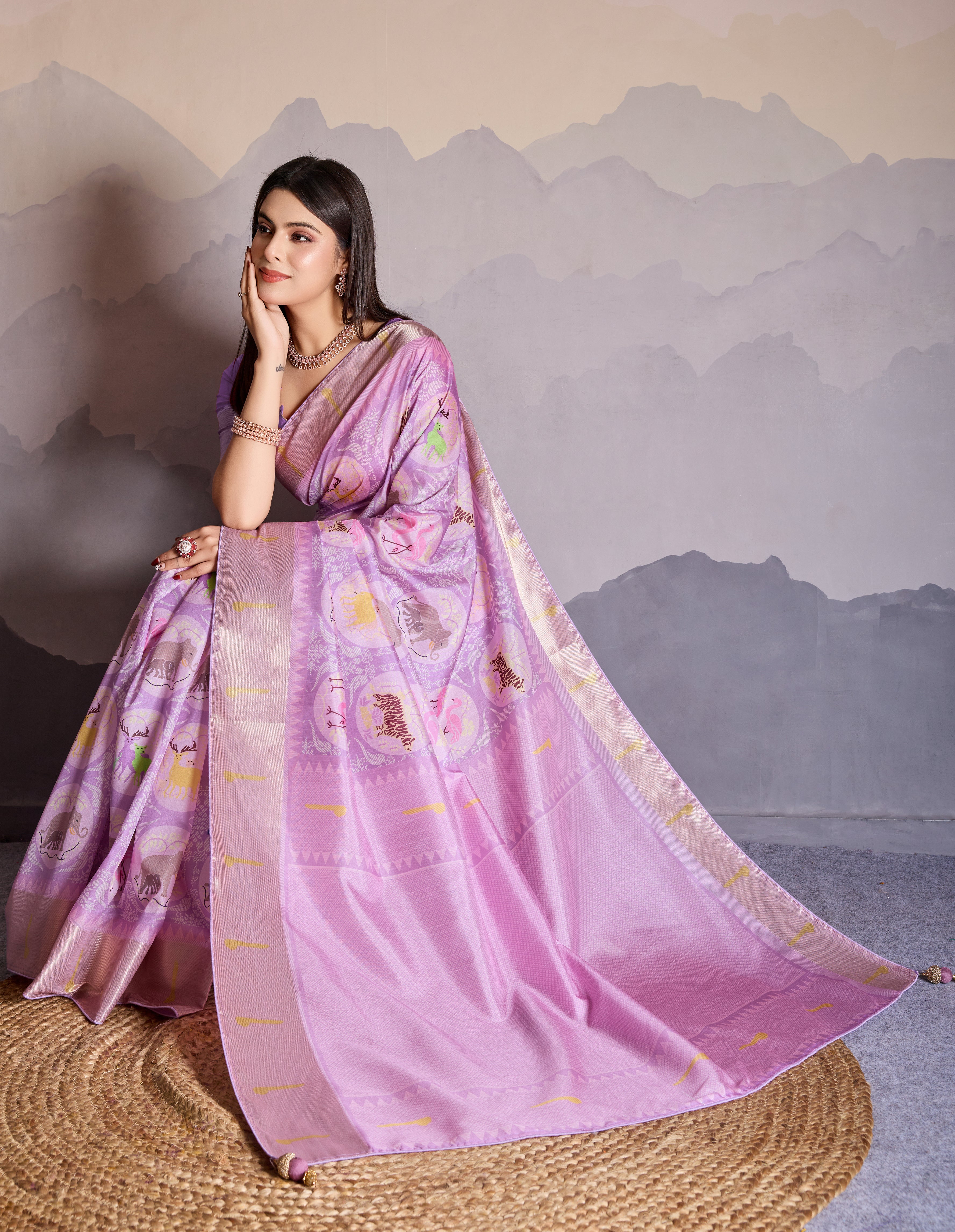 Make the heads turn whenever you costume up in such a stunning Lilac Dola Satin traditional saree.. The border and zari patta work digital printed seems chic and great for any party. Comes with matching blouse.