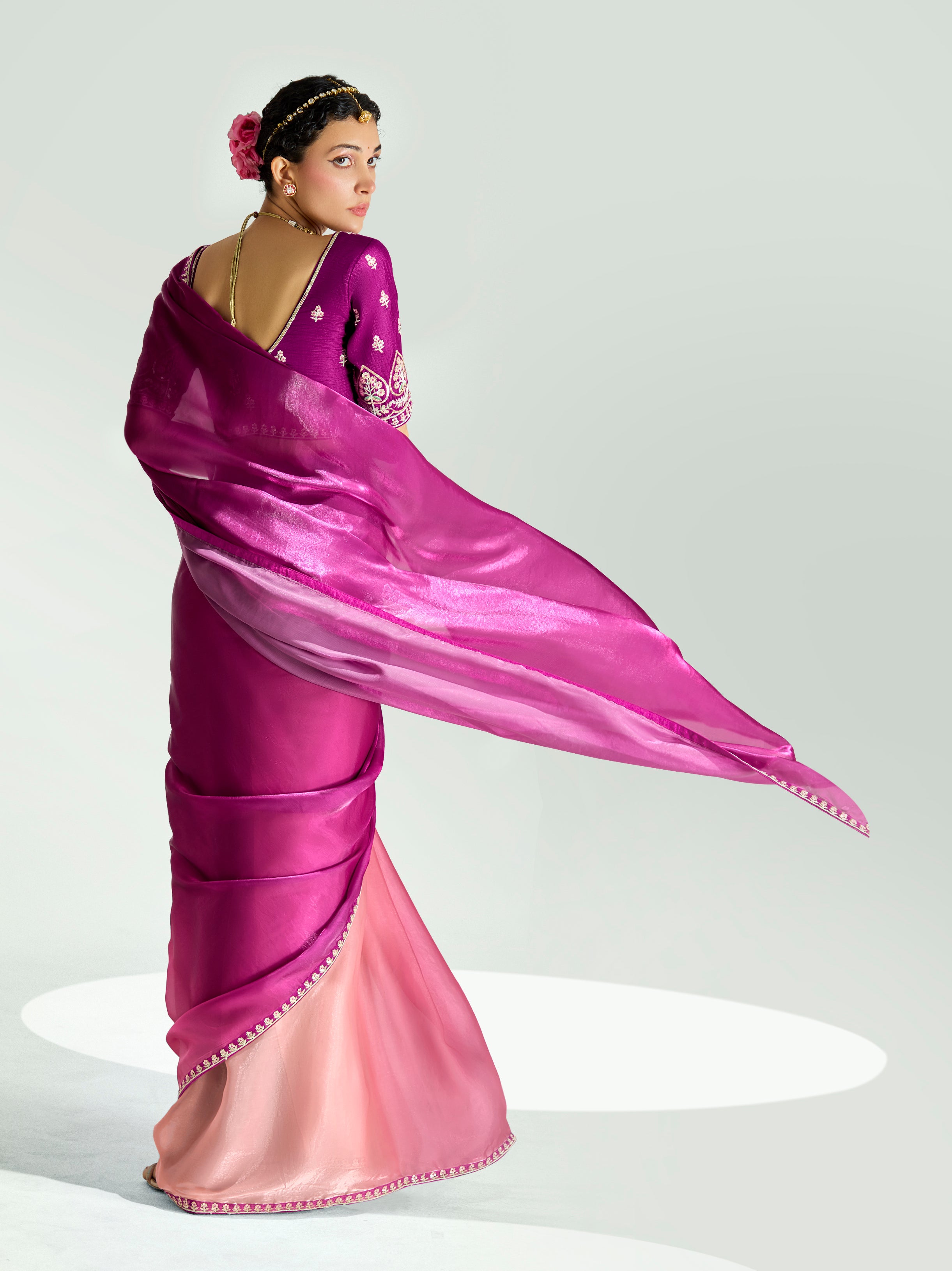 This Magenta And Peach Shaded Tissue Organza Saree is a delightful mix of soft charm and intricate craft, perfect for your festive and traditional moments. Made from lightweight tissue silk, it dazzles with hand-embroidered resham thread, sparkling sequins, and playful tassels along the border and pallu. The matching satin silk blouse is a showstopper too, featuring handwork embroidery with beads and sequins on the neckline, sleeves, and back.