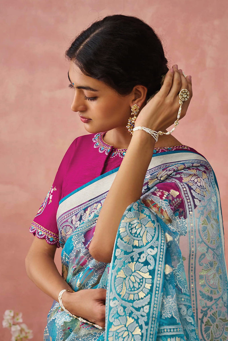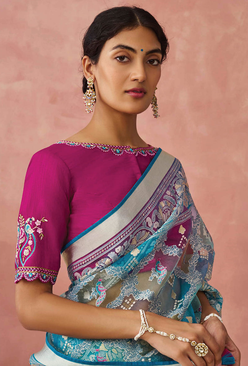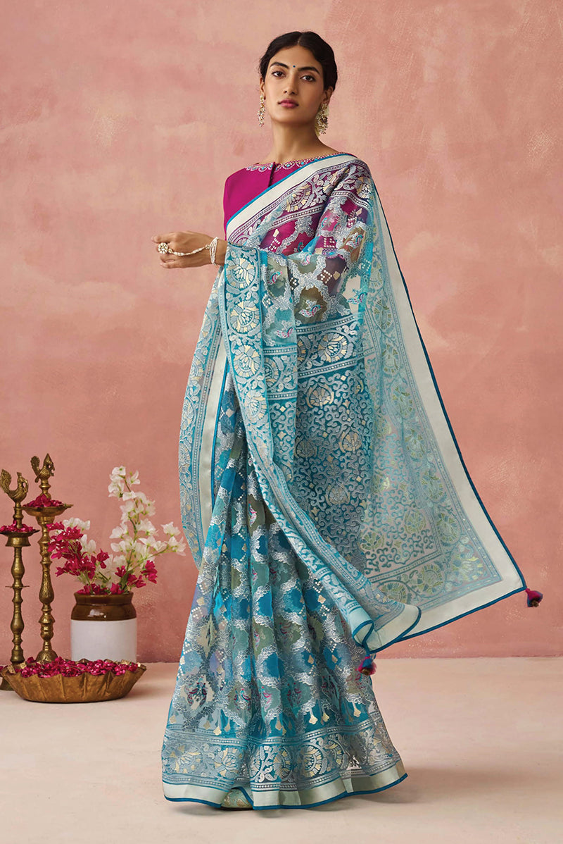 Saree Colour : Aqua Blue || Blouse Colour : Magenta
