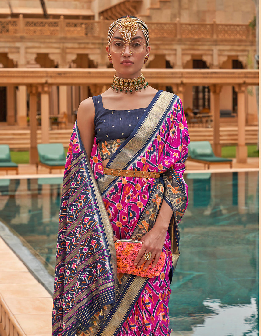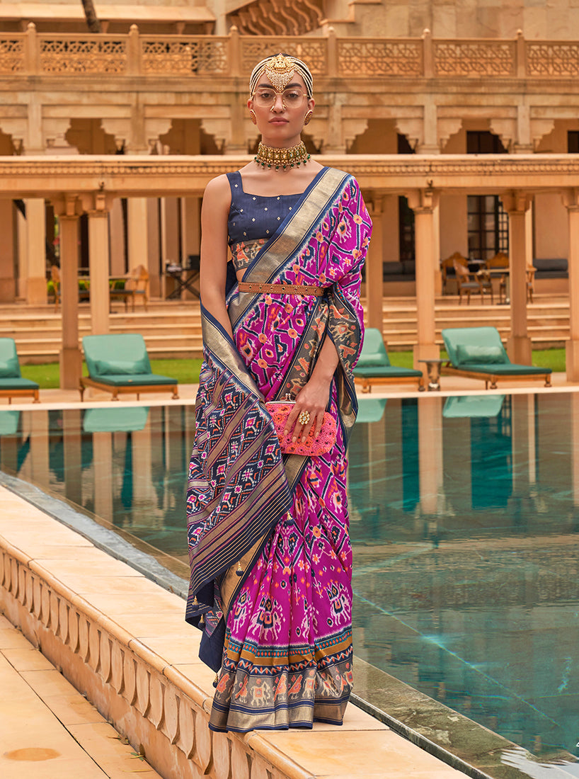 Monjolika Fashion and trend will be on the peak of your attractiveness as soon as you dresses this Magenta Colour Patola silk classic saree. Beautified with border and Patola silk work all synchronized effectively with all the trend and design of the dress. Comes with matching silk Navy Blue Colour blouse.