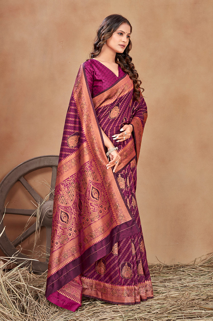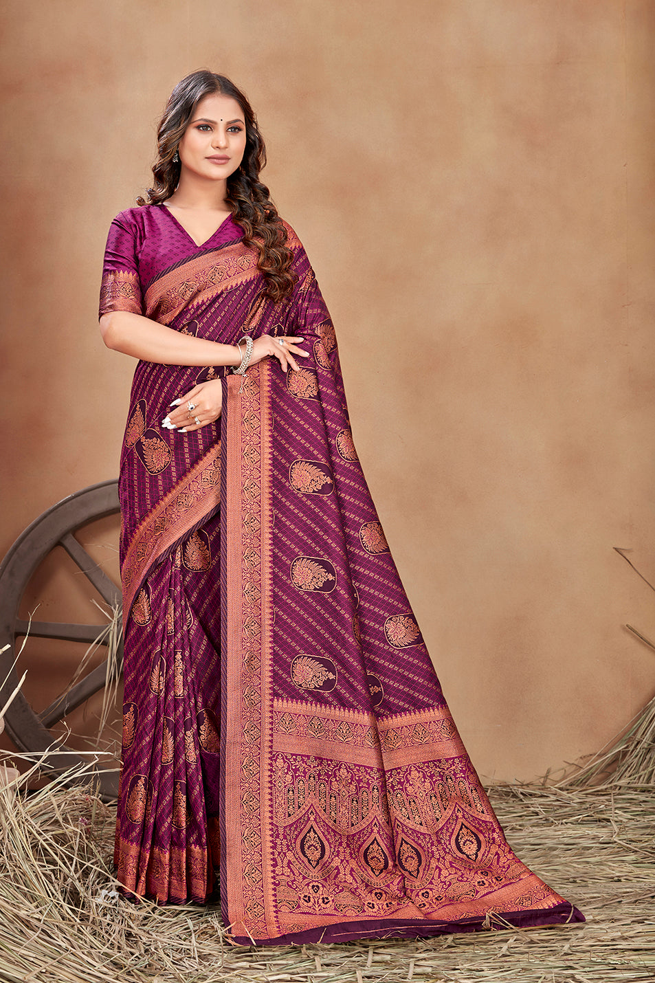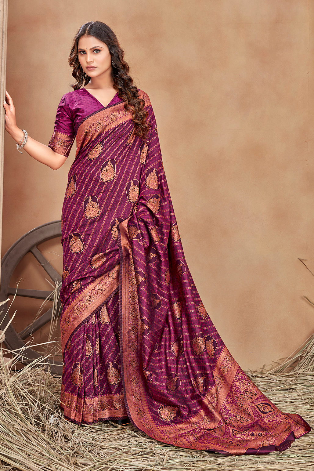 esigned With Simplicity With A Touch Of Soberness In Its Work Makes A Masterpiece. Add Richer Looks To Your Persona In This Majestic Magenta Color Satin Silk Saree. This Beautiful Attire Is Showing Some Amazing Woven And Zari Work. Comes With Matching Blouse.