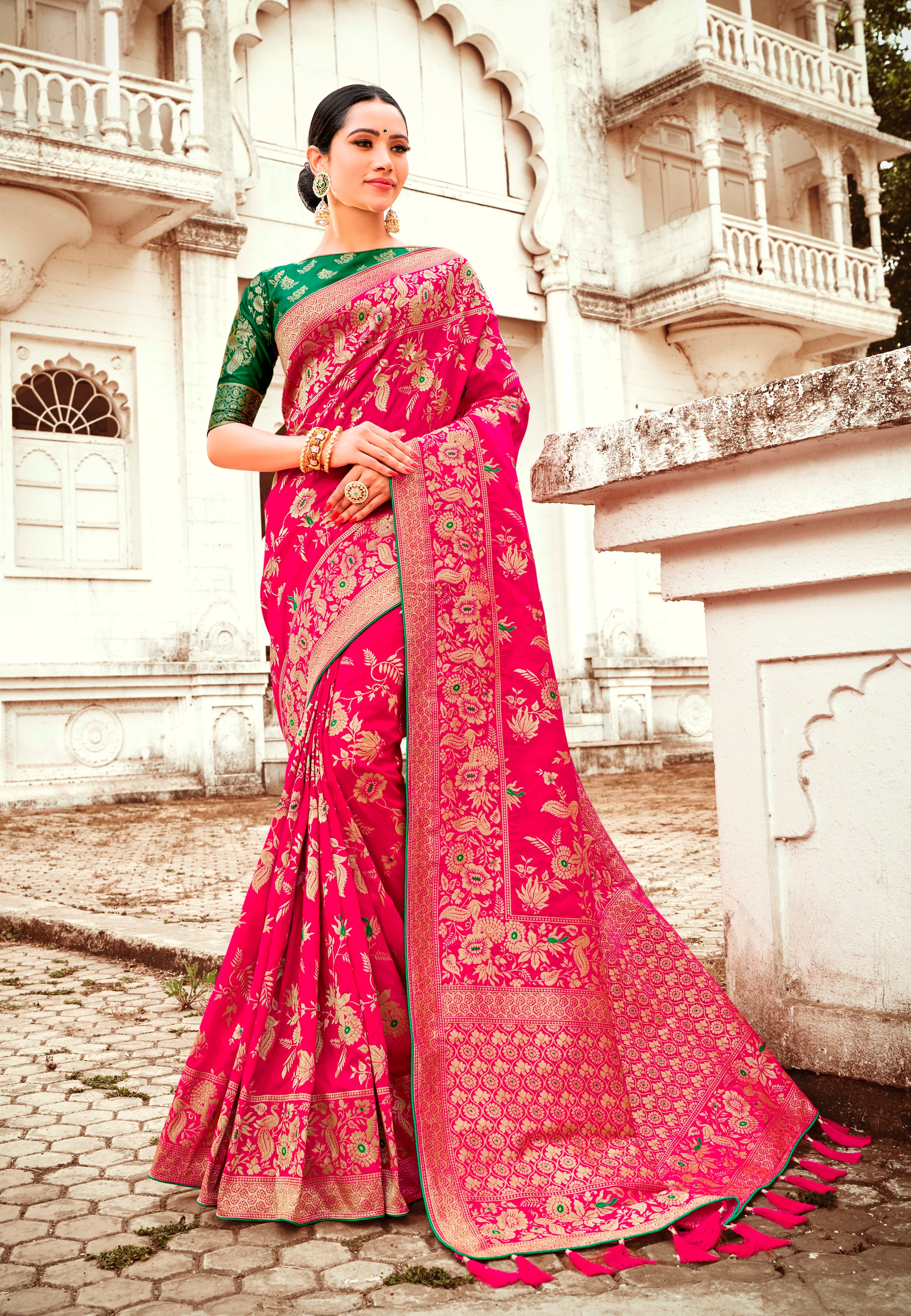 Be an angel and create and ascertain a smashing effect on every single person by carrying this Magenta silk classic saree. The brilliant attire creates a dramatic canvas with remarkable border, cutwork, embroidered, stone, weaving and zari work. Comes with matching blouse. (Slight variation in color, fabric & work is possible. Model images are only representative.)