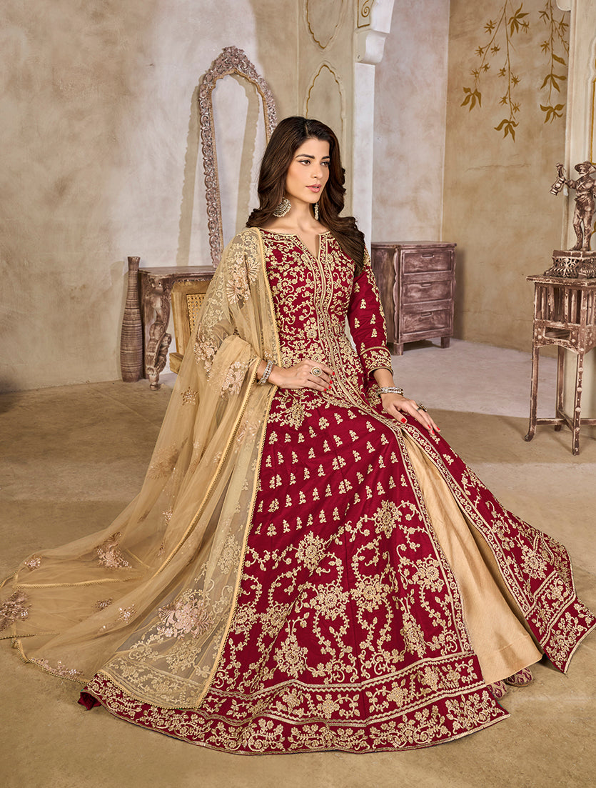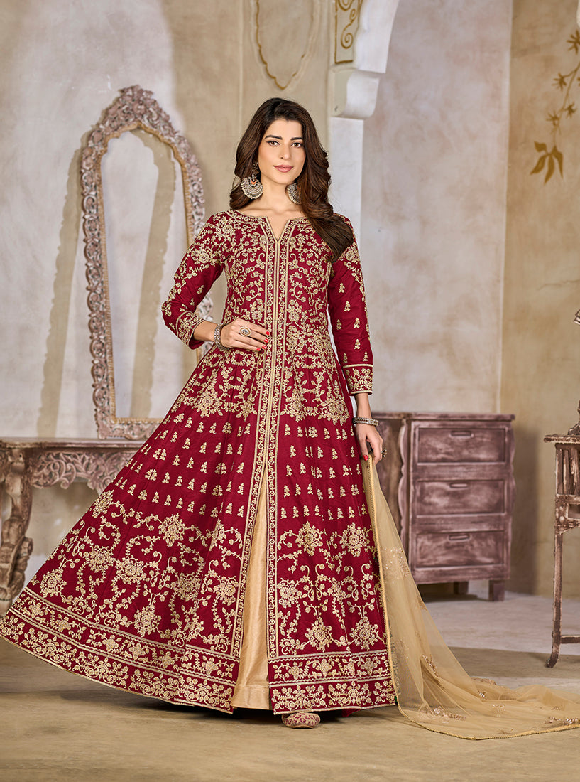 Look ethnic in this Maroon art silk anarkali salwar kameez. Look ravishing clad in this attire which is enhanced embroidered and zari work. Comes with matching bottom and dupatta. (Slight variation in color, fabric & work is possible. Model images are only representative.)