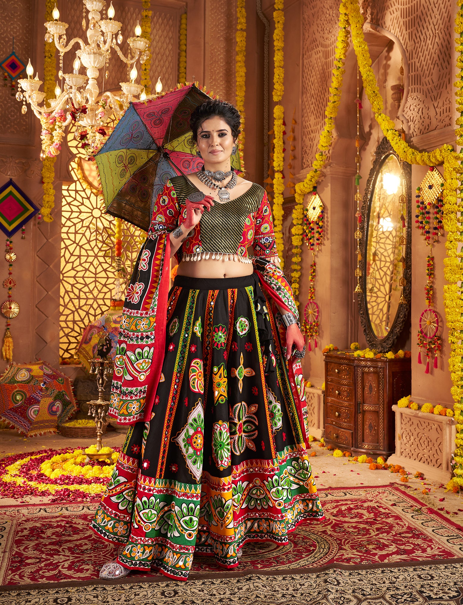 Black Cotton Navratri Lehenga Choli, designed to make every Garba twirl unforgettable. Crafted from breathable cotton fabric, the lehenga features intricate Aari and Foil Print Work, bringing a vibrant traditional touch perfect for the 9 nights of celebration. The cotton choli showcases beautiful Jacquard Patch Detailing and Embroidered Lace, adding depth and texture to your festive ensemble. Complete with a printed cotton dupatta enhanced with coordinating Aari and Foil accents, this set offers style, comfort, and cultural elegance all in one.