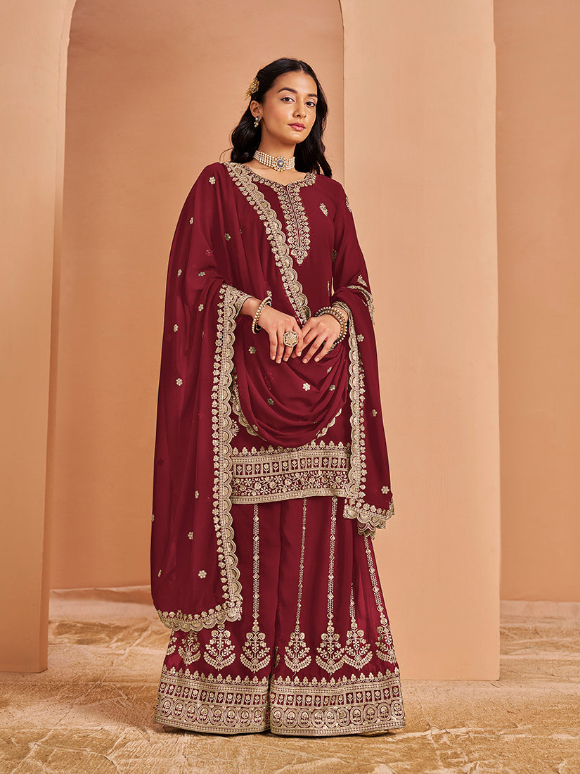 This Maroon Faux georgette designer salwar suit add the sense of elegant and glamorous. The brilliant attire creates a dramatic canvas with amazing work. Comes with matching bottom and dupatta.