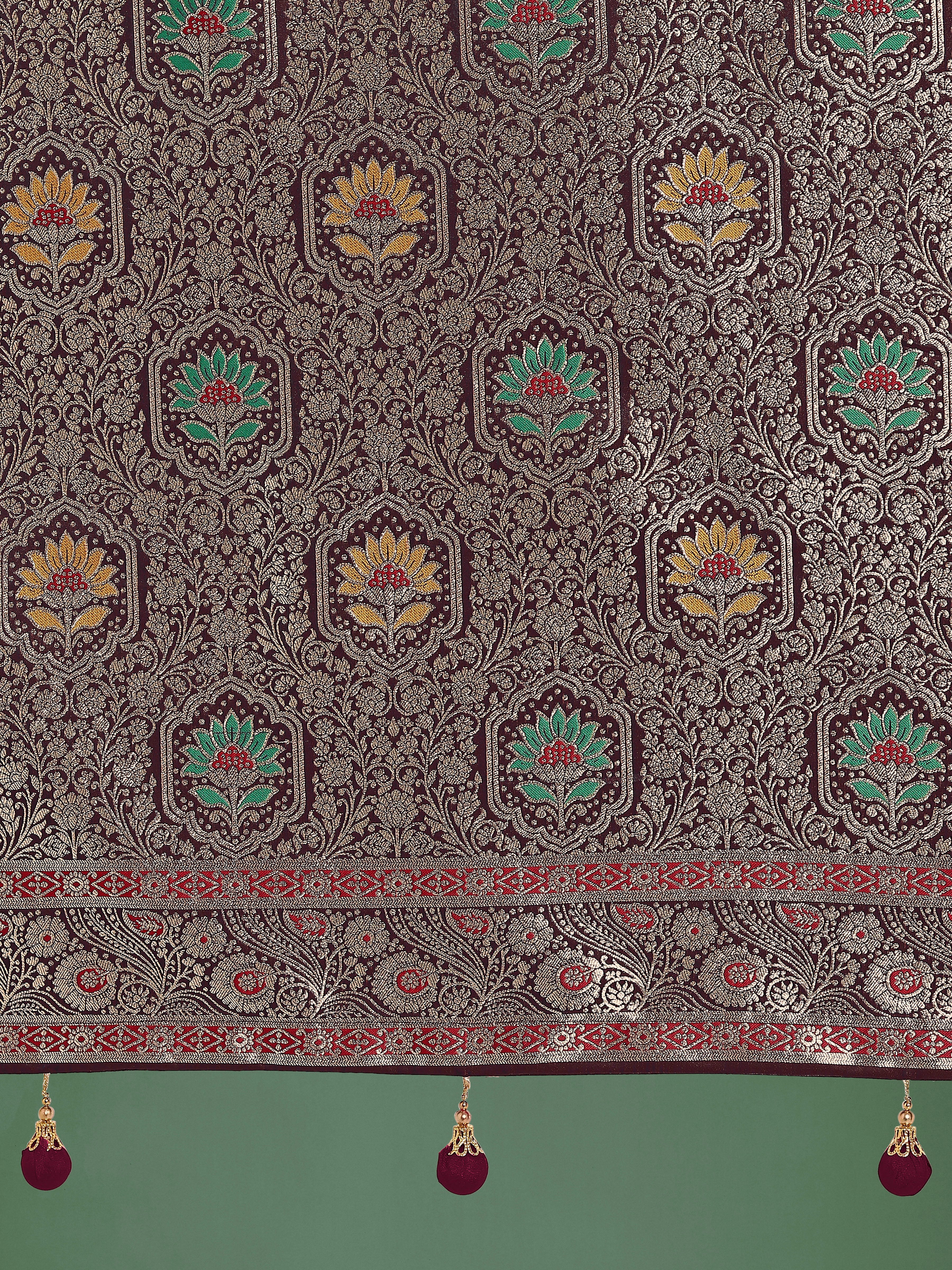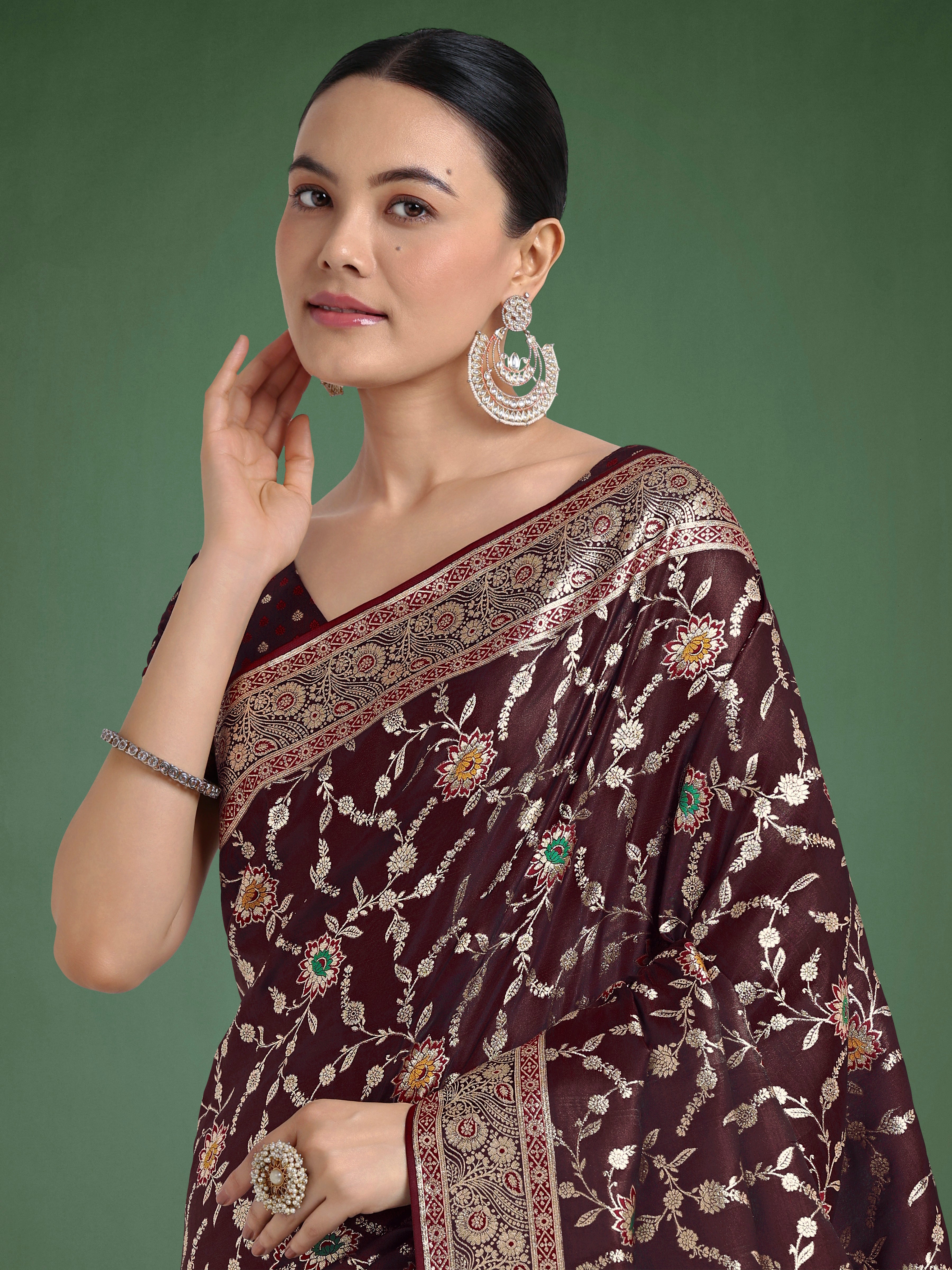 This brilliant array will make you the ultimate classic beauty at the next event you attend. Look ethnic in this affluent Maroon Banarasi satin silktraditional saree. Beautified and stylized with border, fancy, weaving work and lace work to give you an attractive look. Comes with matching blouse. (Slight variation in color, fabric & work is possible. Model images are only representative.)
