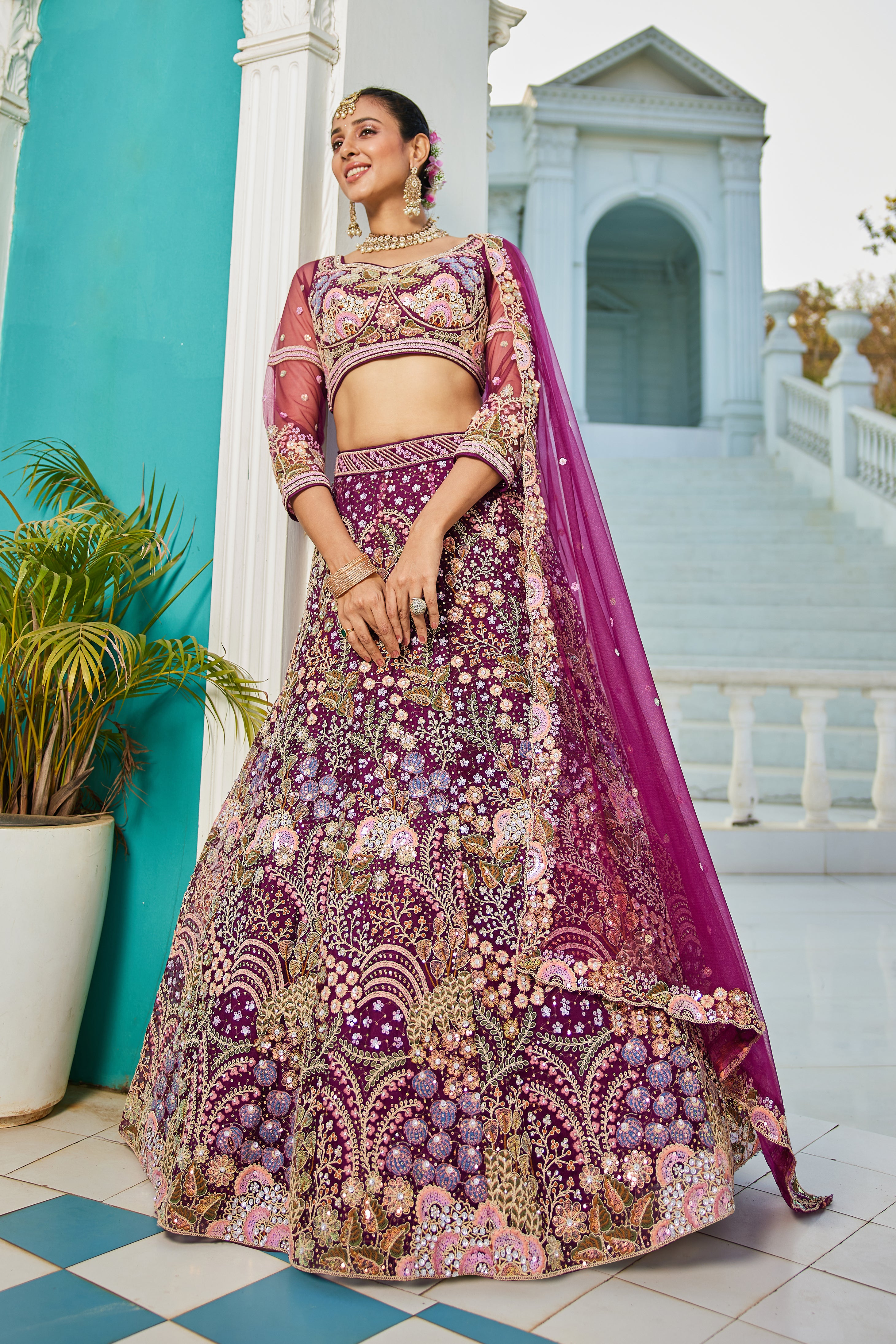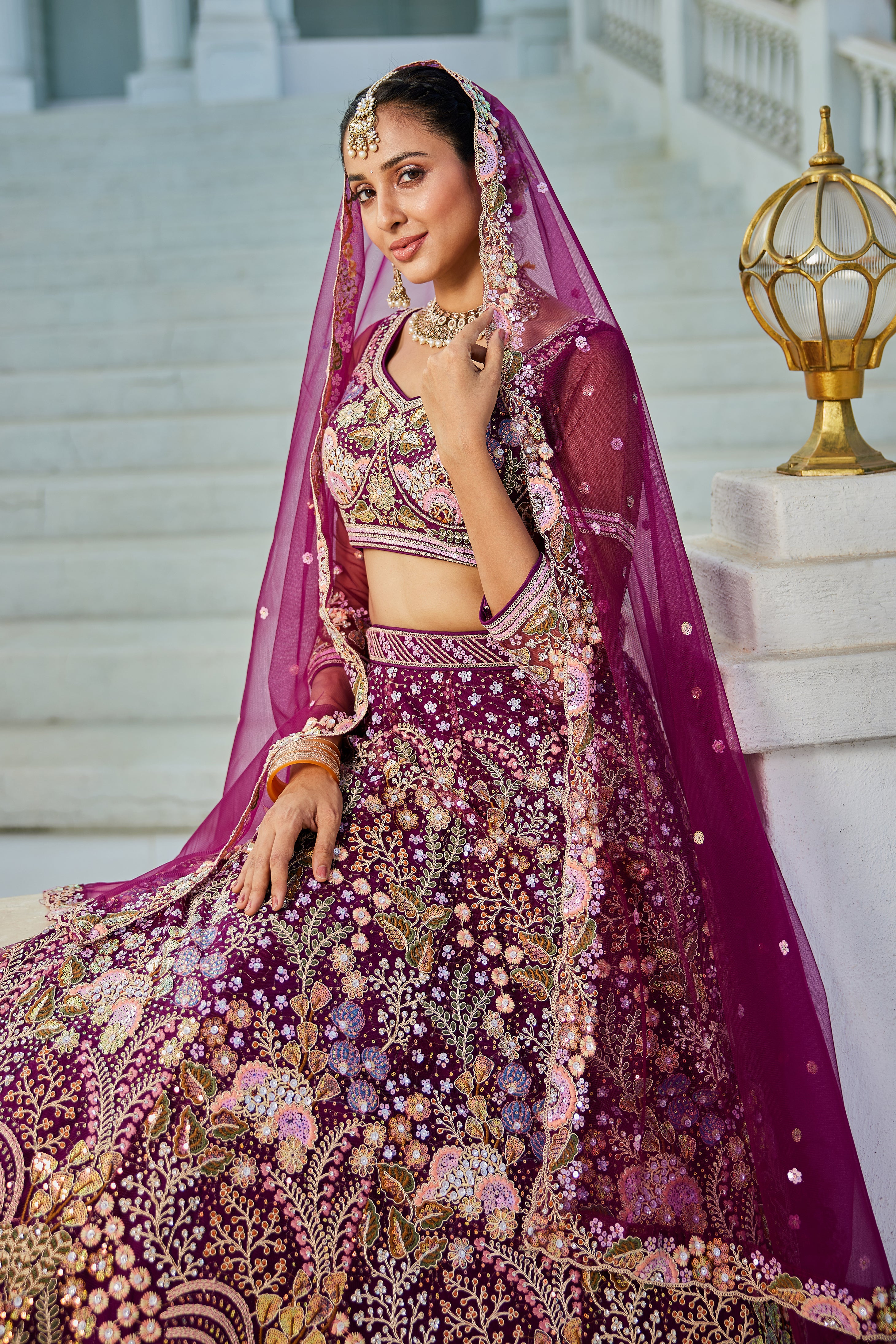 Monjolika Fashion Capture the exuberance of womanhood in its full glory that will bring out your fragility and femininity. This Burgundy colour net a line lehenga choli add the sense of elegant and glamorous. This beautiful attire is showing some amazing embroidery done with embroidered, sequins, stone and thread work. Comes with matching choli and dupatta