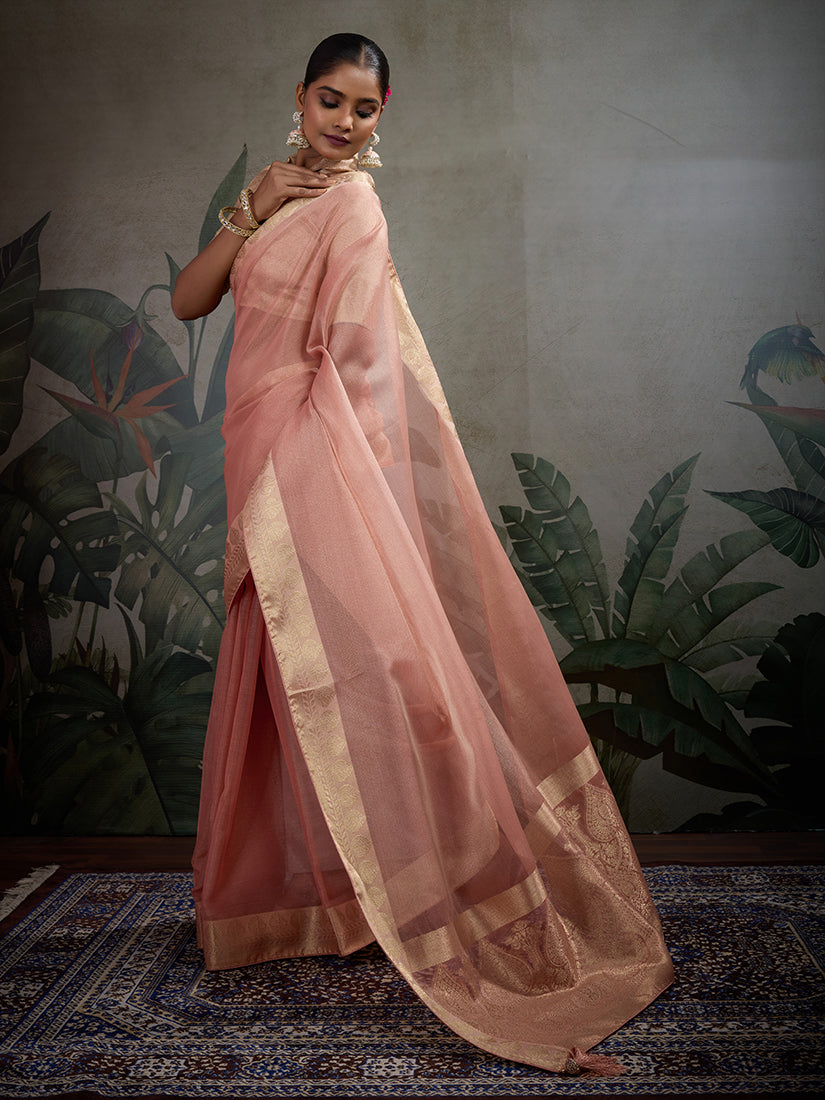 Vogue and pattern will be on the peak of your magnificence as soon as you attire this Light Peach tissue classic saree. The ethnic border,Woven patta palu nd brocade and work to your clothing adds a sign of magnificence statement with your look. Comes with matching blouse. (Slight variation in color, fabric & work is possible. Model images are only representative.)