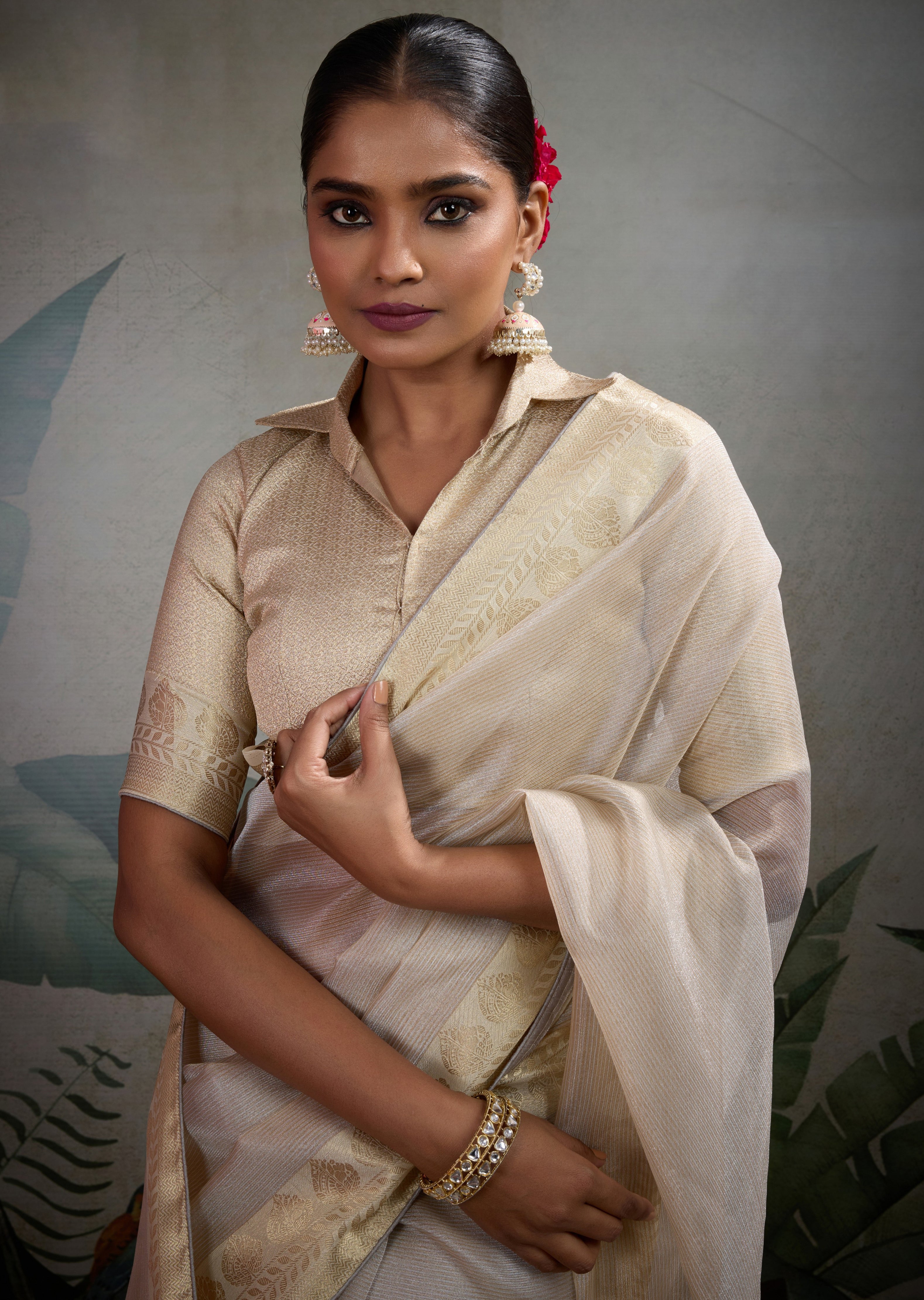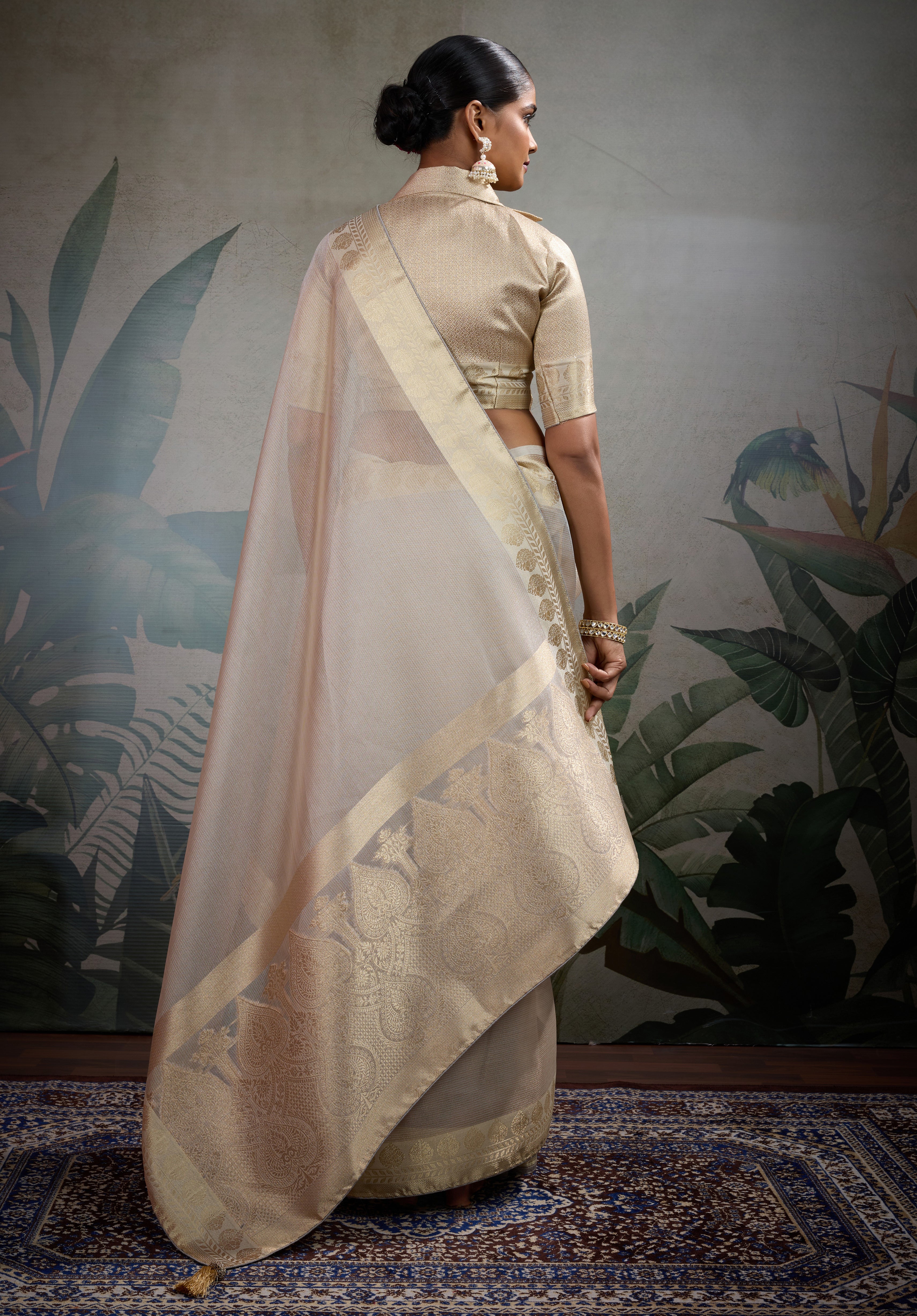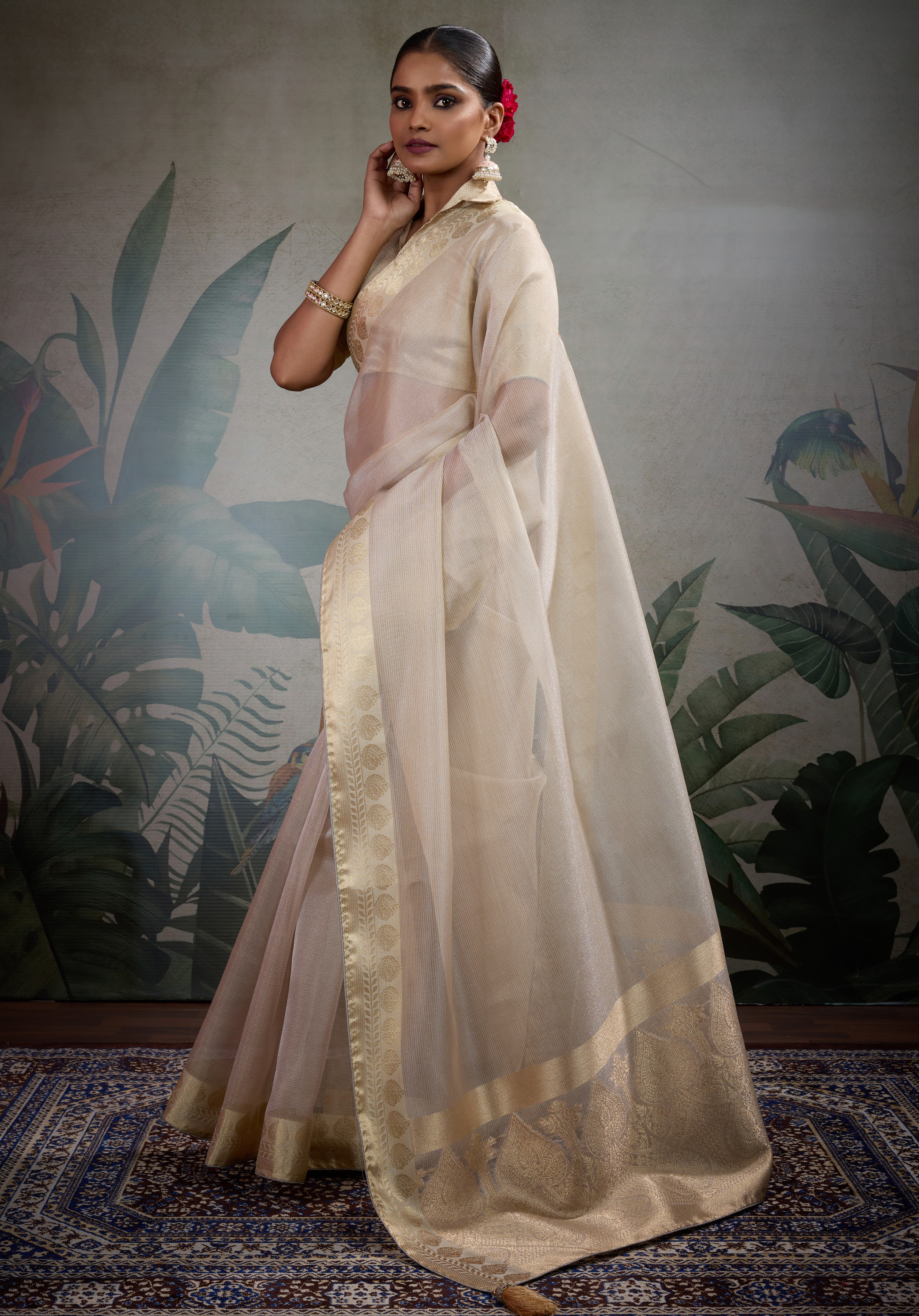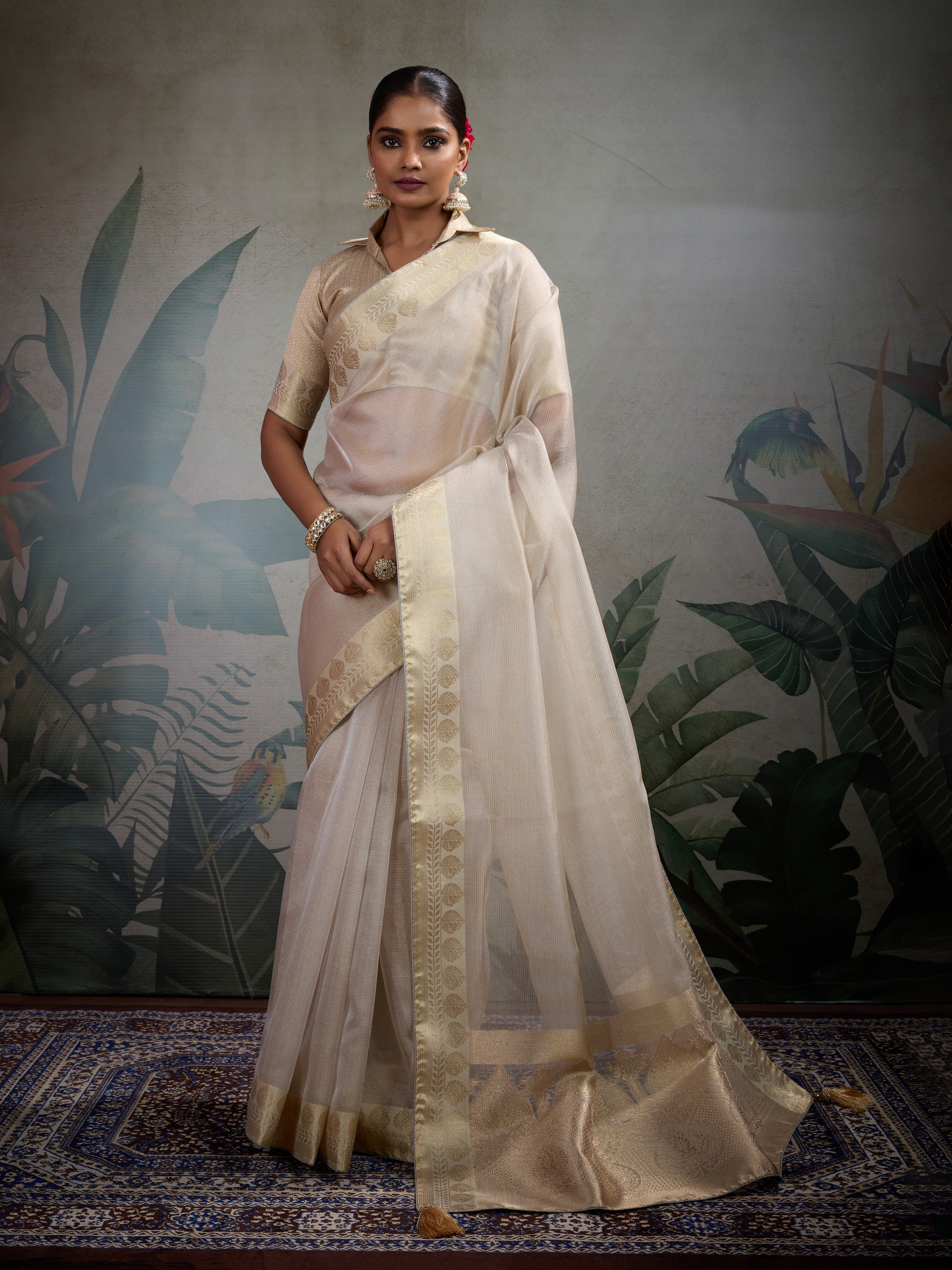 Vogue and pattern will be on the peak of your magnificence as soon as you attire this Off White tissue classic saree. The ethnic border,Woven patta palu nd brocade and work to your clothing adds a sign of magnificence statement with your look. Comes with matching blouse. (Slight variation in color, fabric & work is possible. Model images are only representative.)