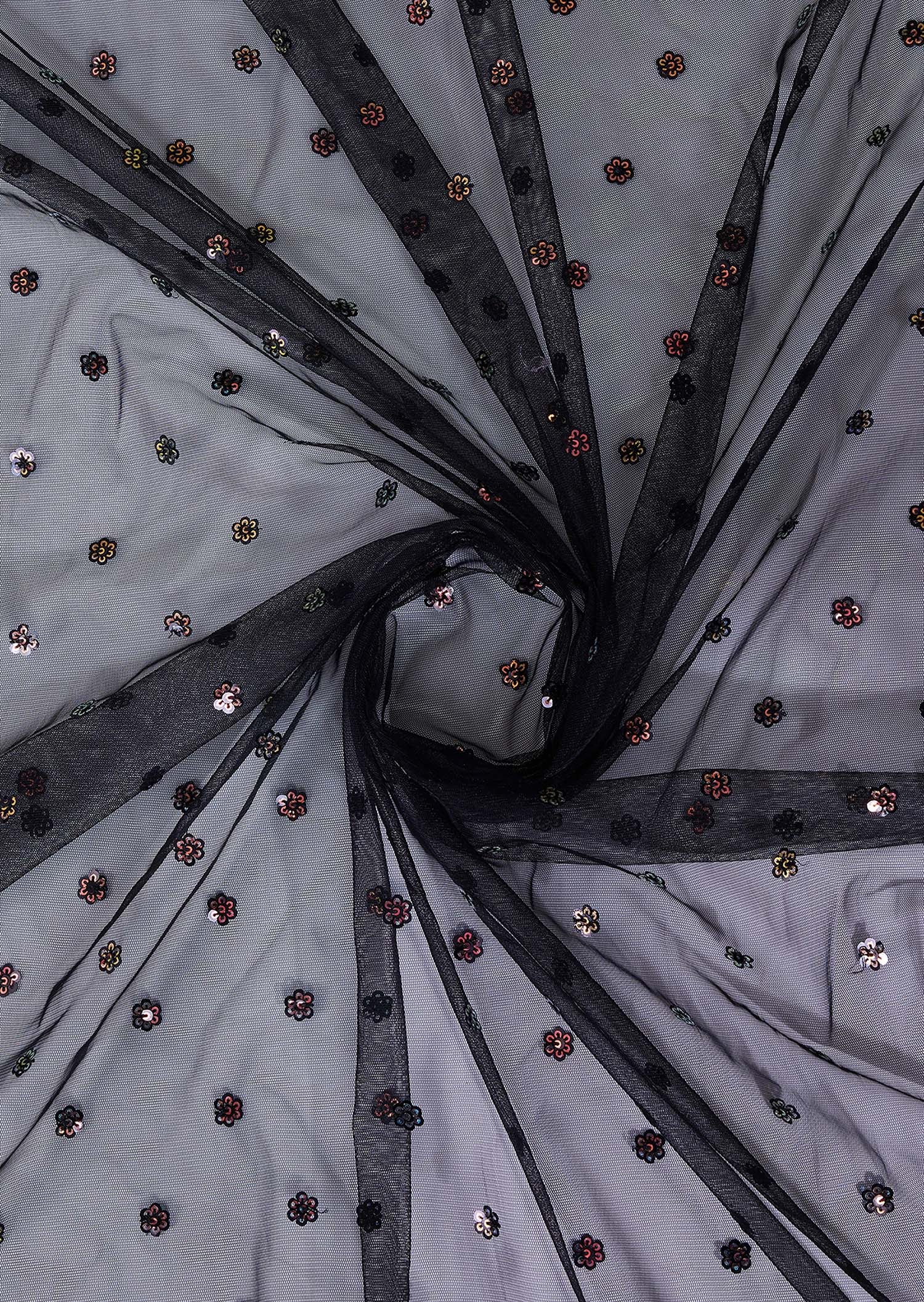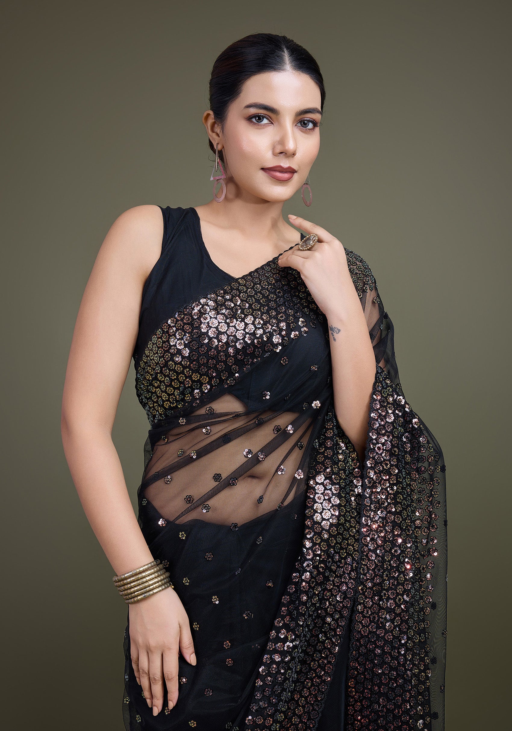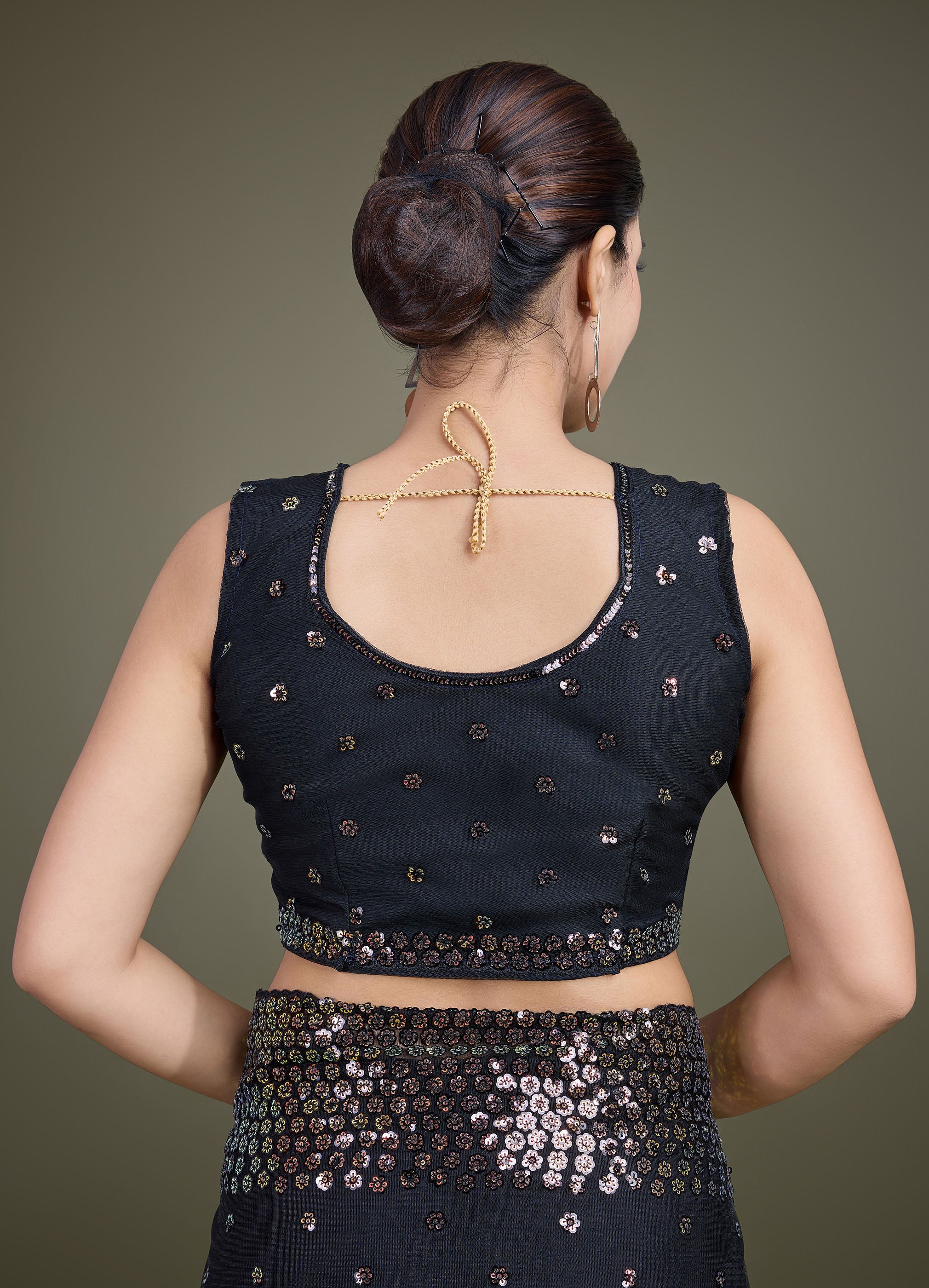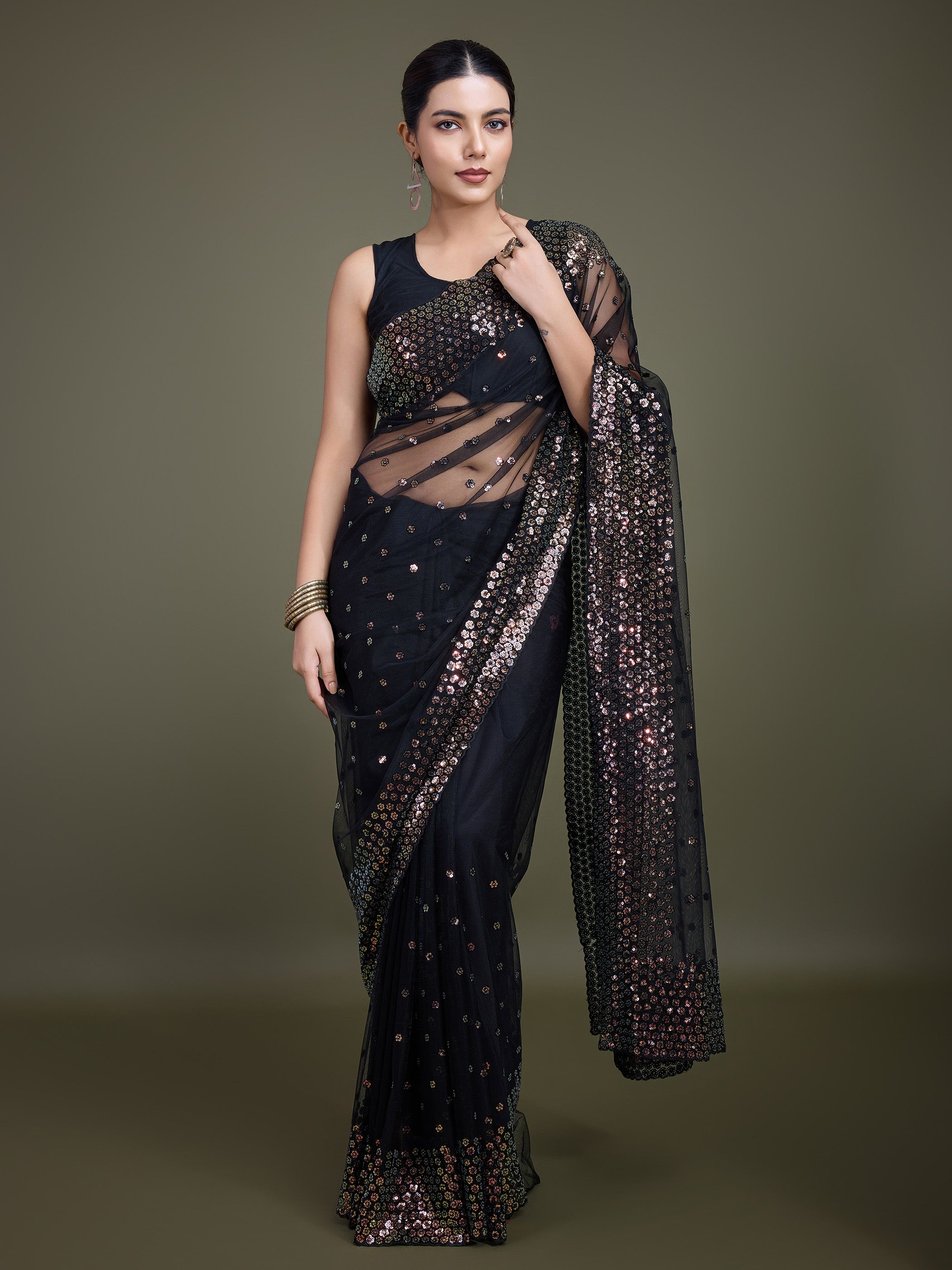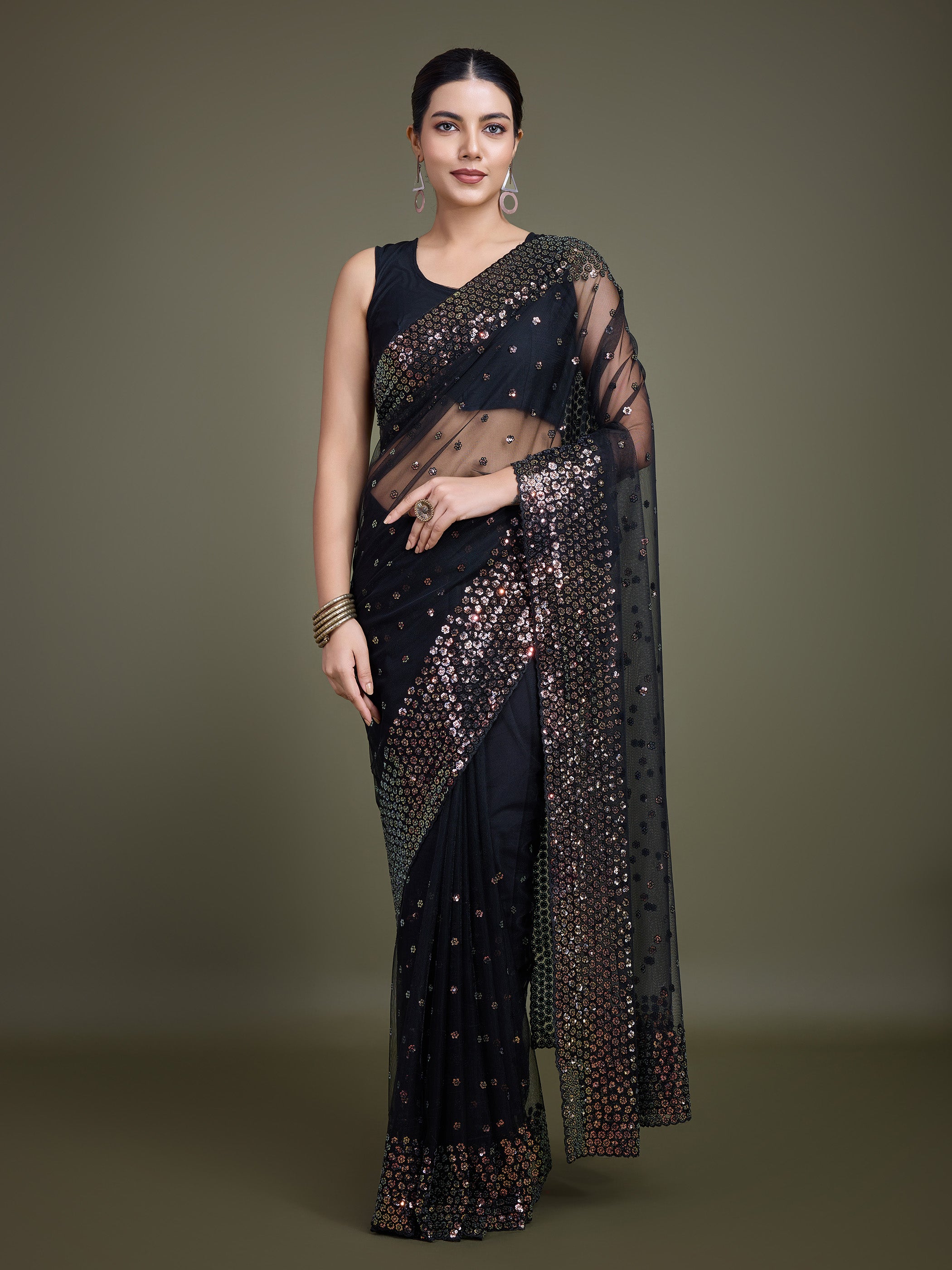 Elevate your ethnic wardrobe with the Monjolika Fashion Exclusive Black Soft Net Saree, a perfect blend of tradition and contemporary elegance. This saree is meticulously crafted from premium soft net fabric, ensuring a lightweight and comfortable drape that exudes grace with every movement. The saree features an intricately designed pallu and border, beautifully embellished with sequins and other decorative elements that enhance its overall aesthetic appeal. The saree comes with a matching unstitched blouse piece.