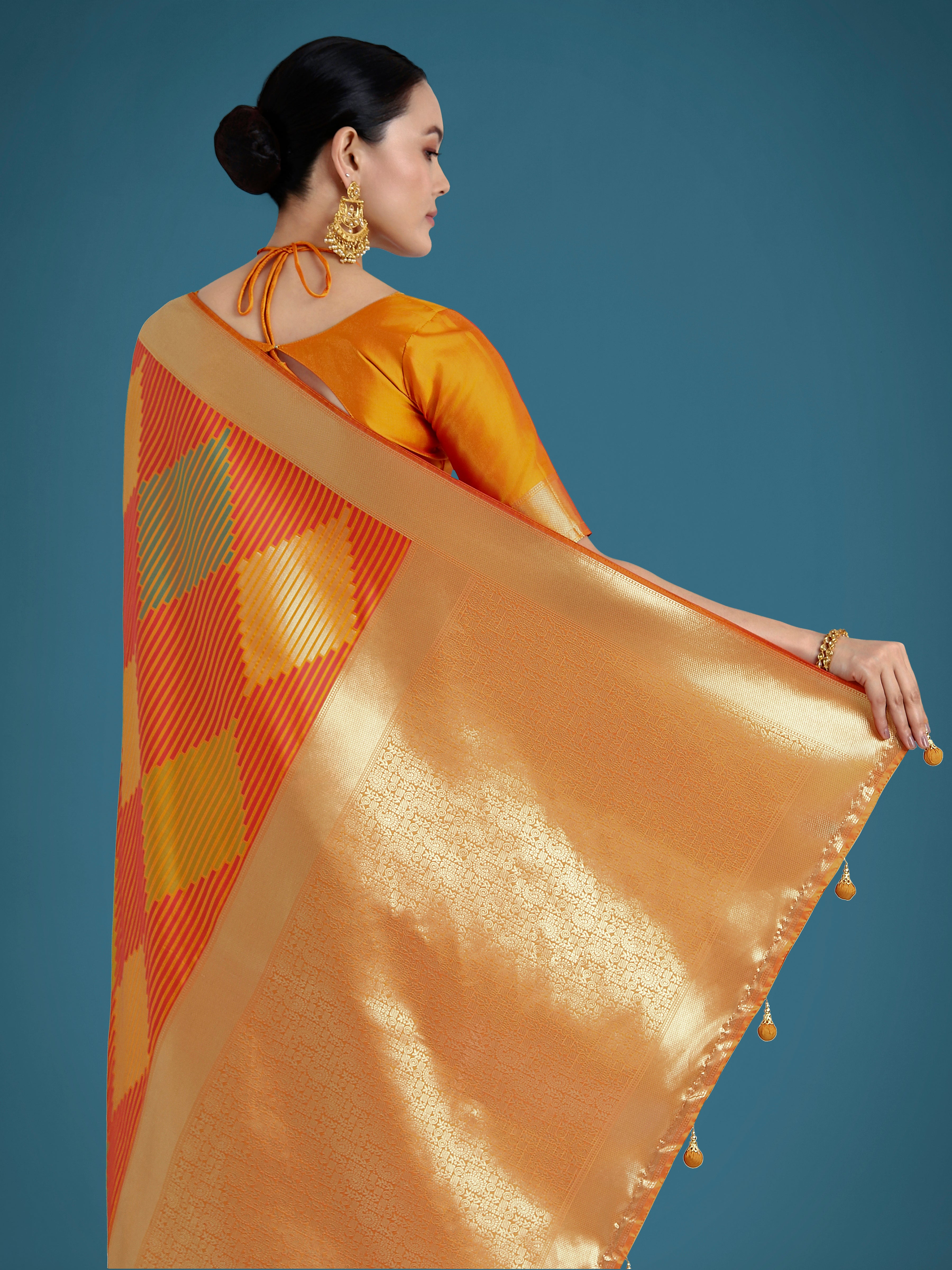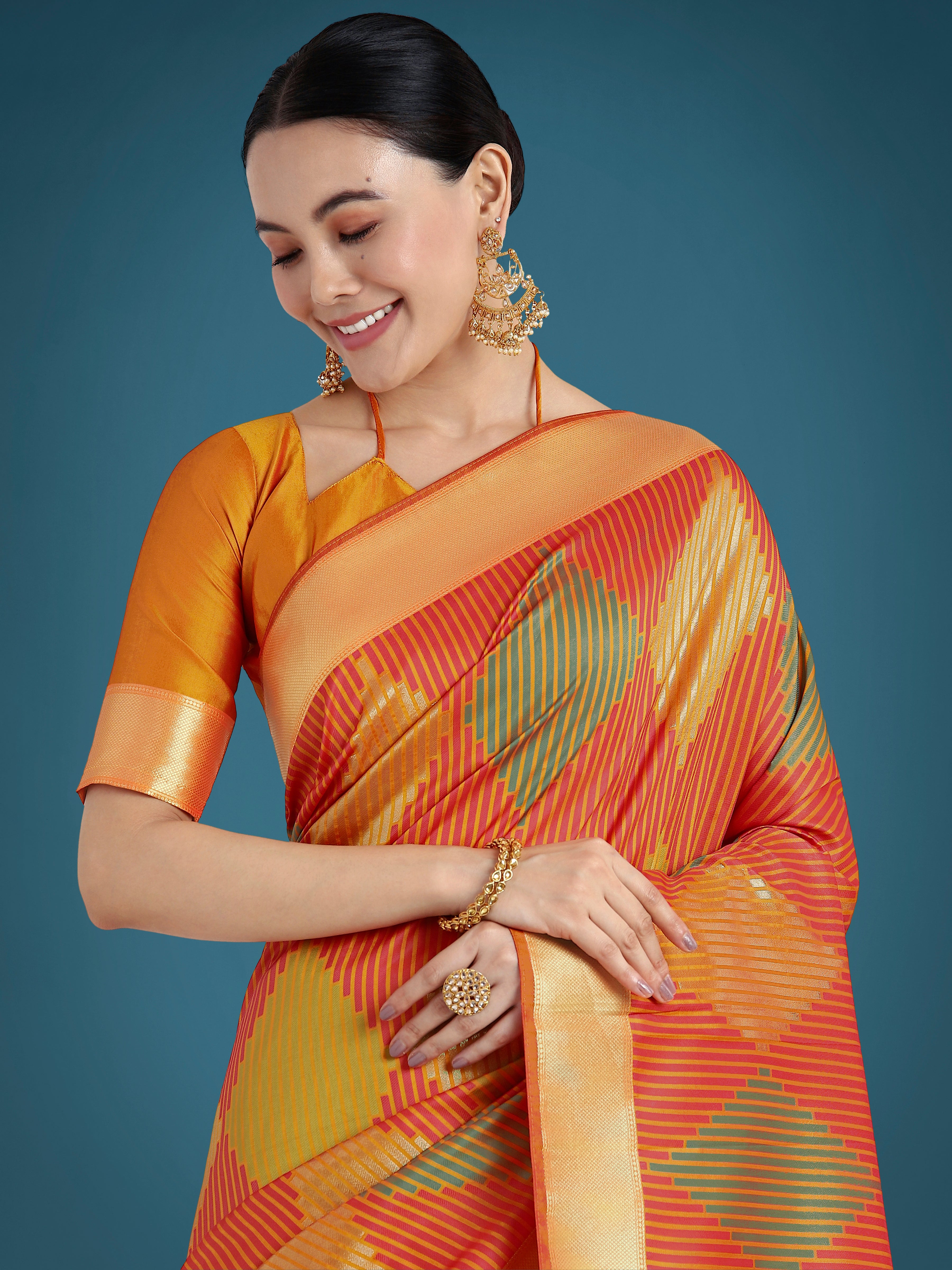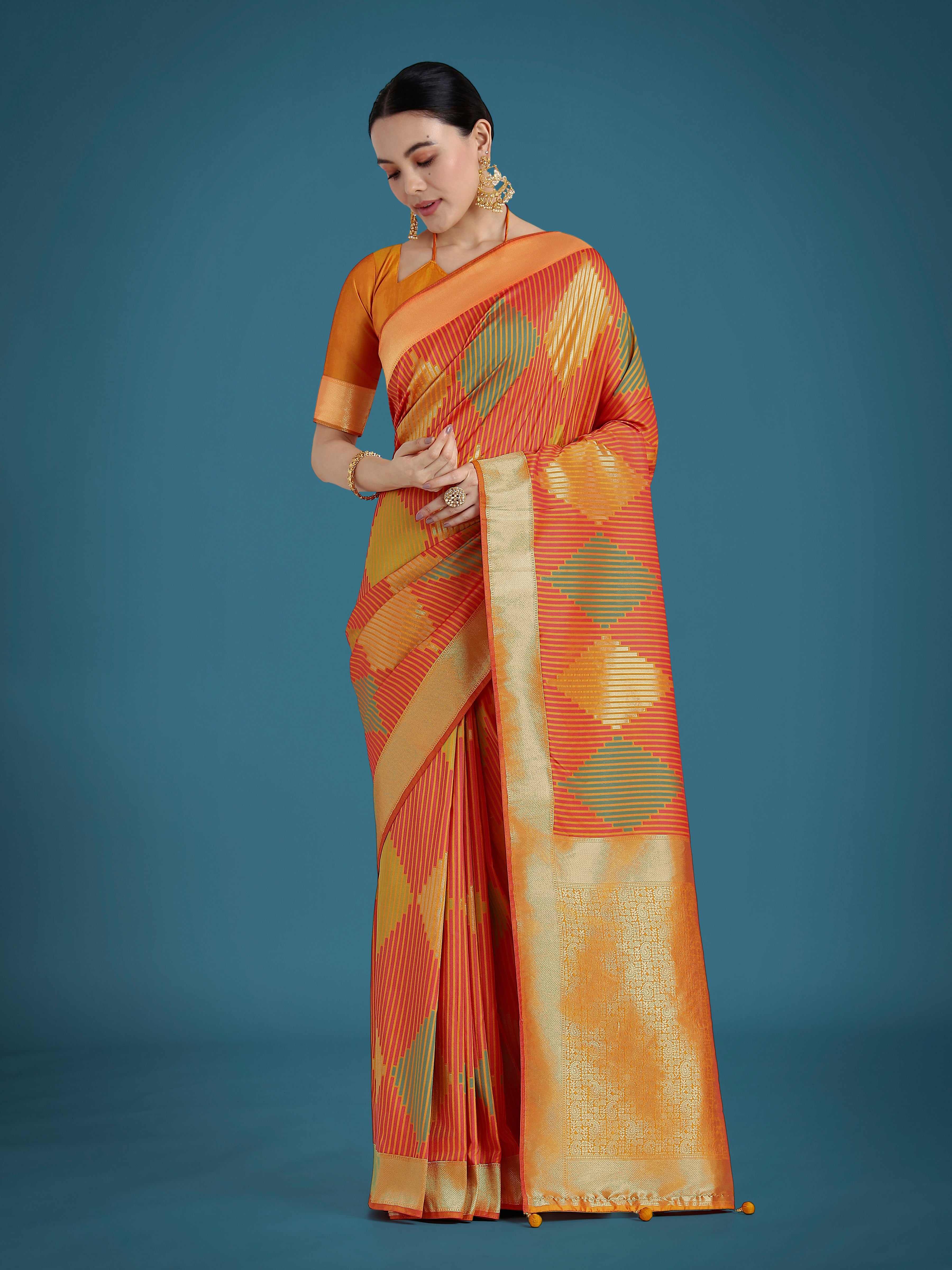 An outstanding Orange colour Banarasi satin silk classic saree will make you look extremely stylish and graceful. The interesting geomatric print and woven work in the course of the dress is awe inspiring. Comes with matching blouse. (Slight variation in color, fabric & work is possible. Model images are only representative.)