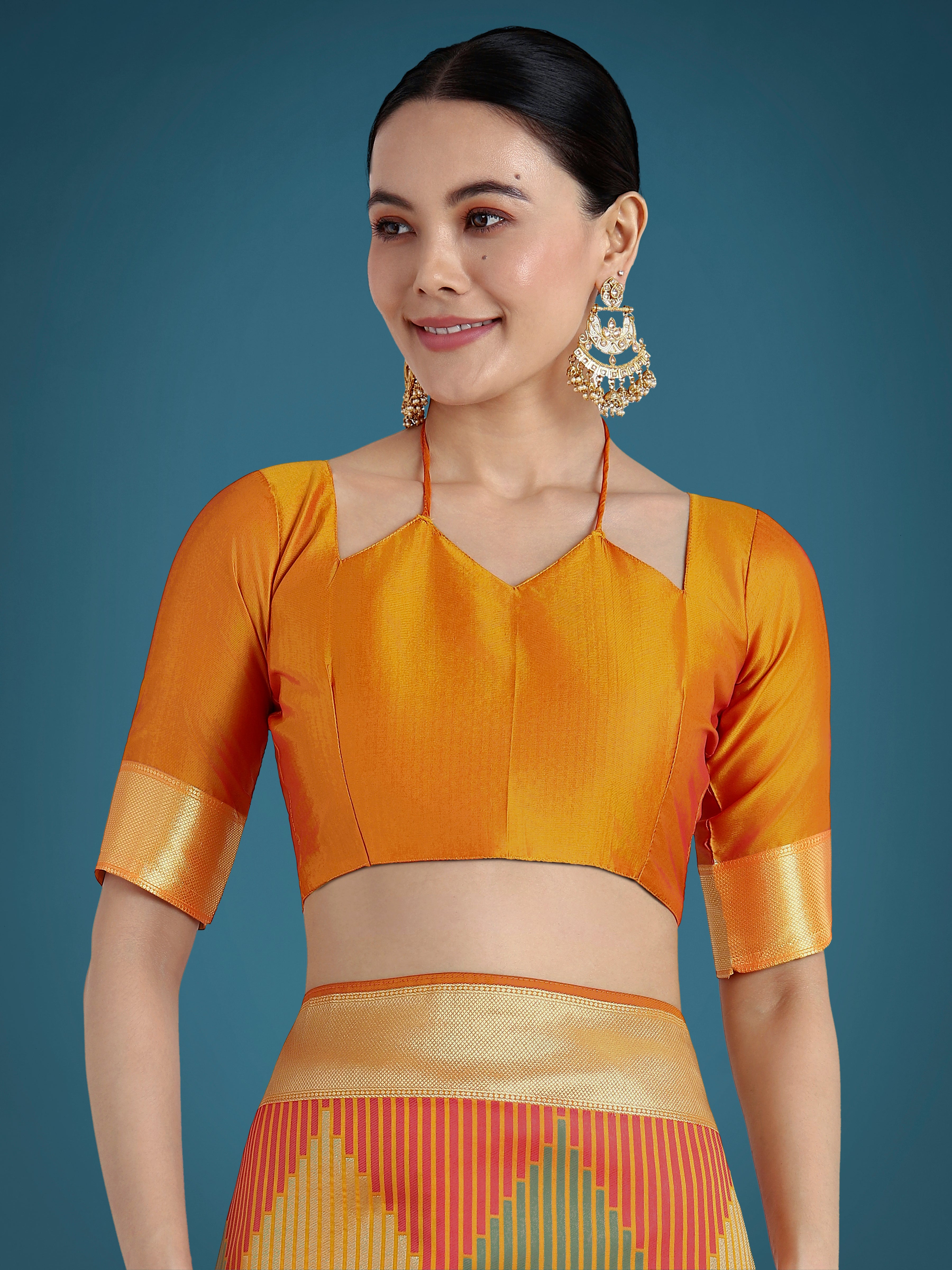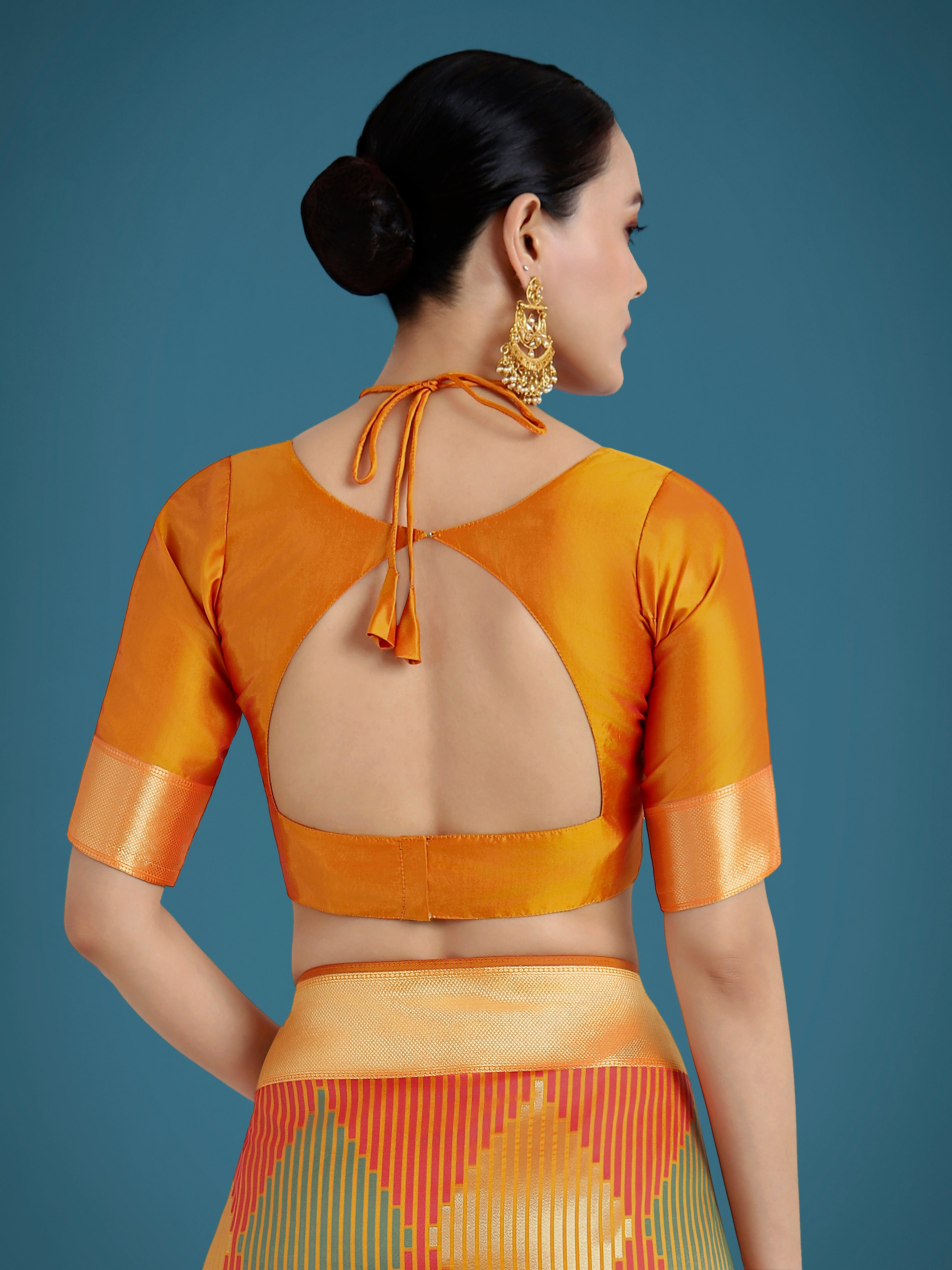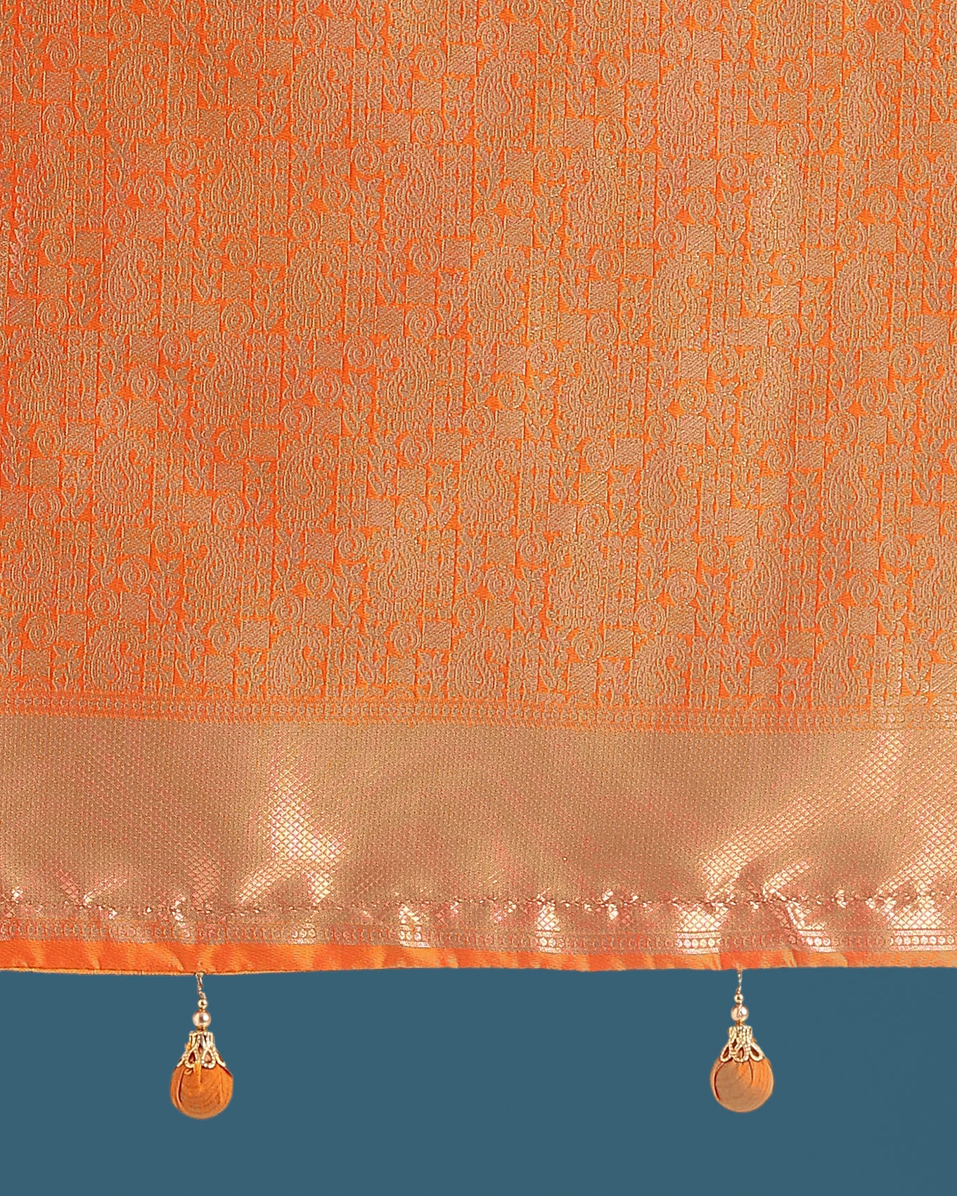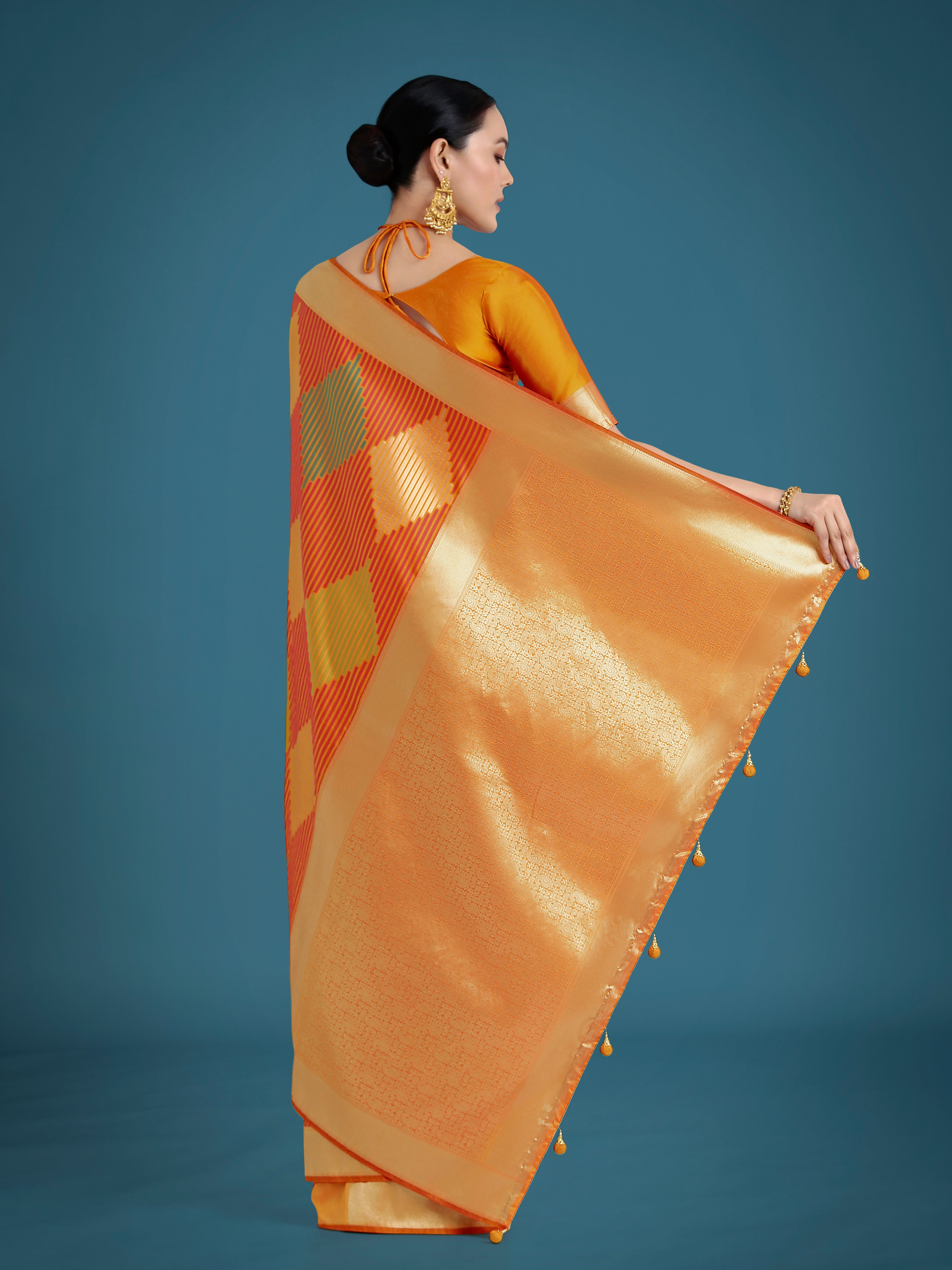 An outstanding Orange colour Banarasi satin silk classic saree will make you look extremely stylish and graceful. The interesting geomatric print and woven work in the course of the dress is awe inspiring. Comes with matching blouse. (Slight variation in color, fabric & work is possible. Model images are only representative.)