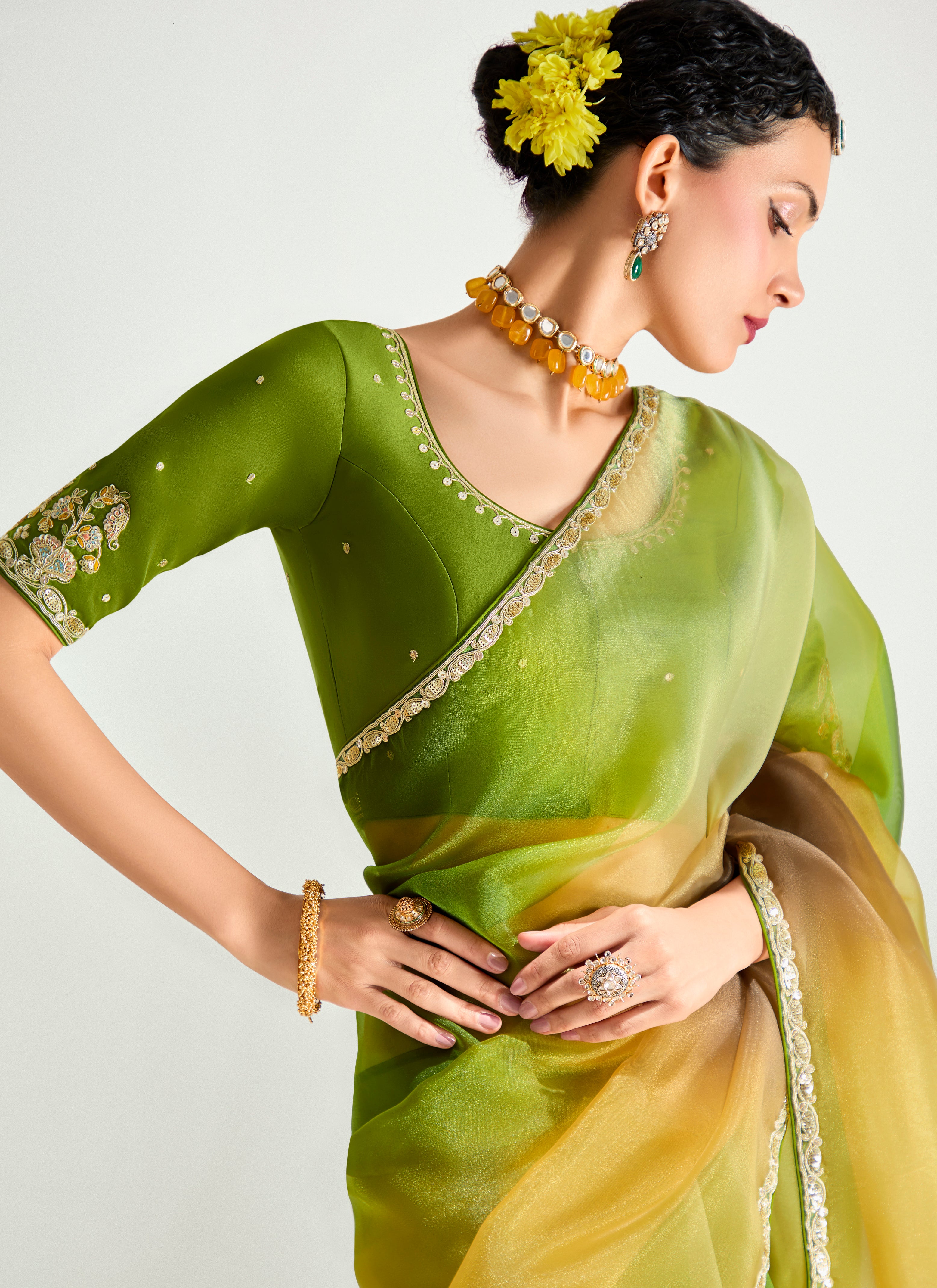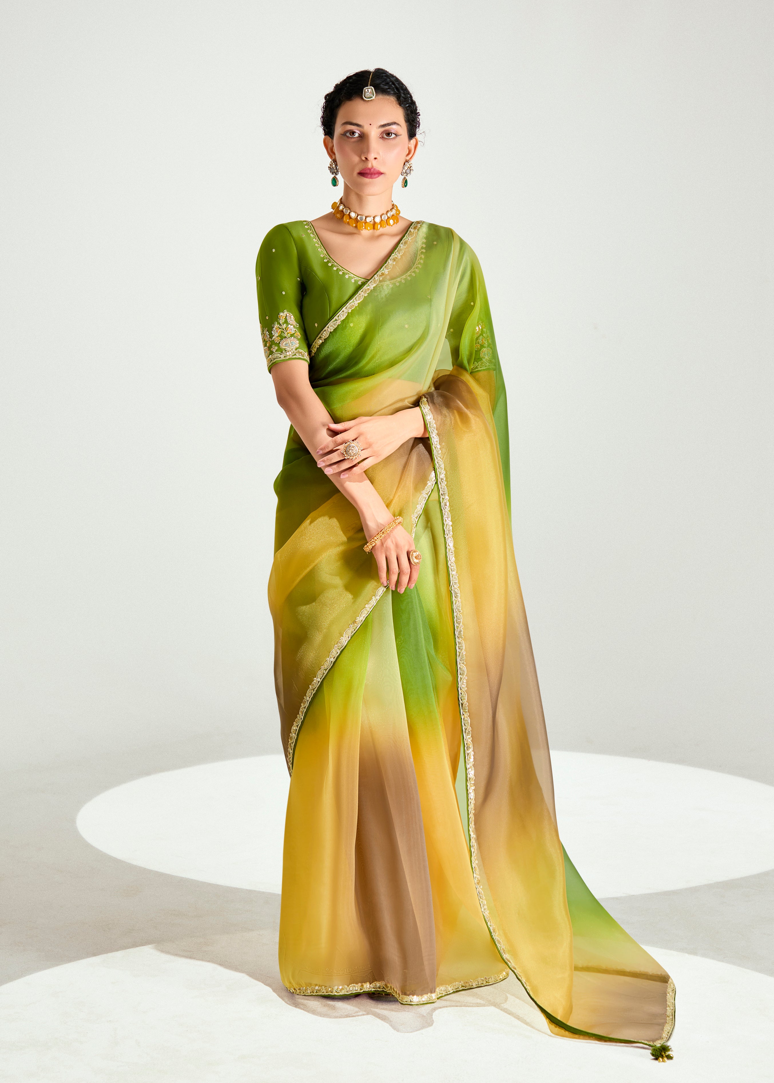 This Multi Colour Shaded Tissue Organza Saree is a delightful mix of soft charm and intricate craft, perfect for your festive and traditional moments. Made from lightweight tissue silk, it dazzles with hand-embroidered resham thread, sparkling sequins, and playful tassels along the border and pallu. The matching satin silk blouse is a showstopper too, featuring handwork embroidery with beads and sequins on the neckline, sleeves, and back.