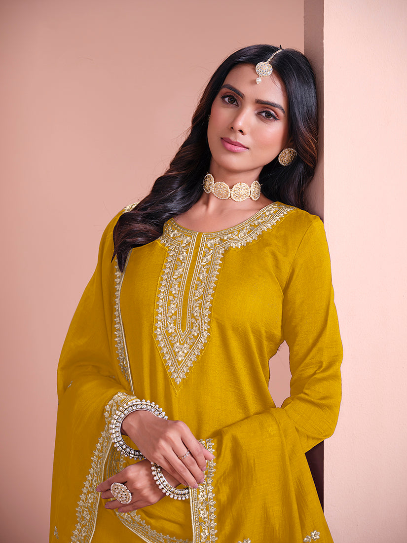 Design and pattern will be at the peak of your magnificence once you dresses this mustard art silk designer salwar kameez. You can see some fascinating patterns done with embroidered work. Comes with matching bottom and dupatta.