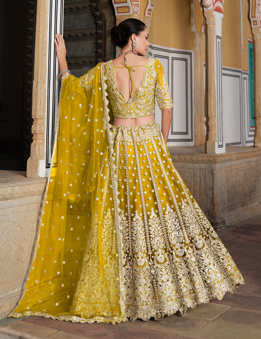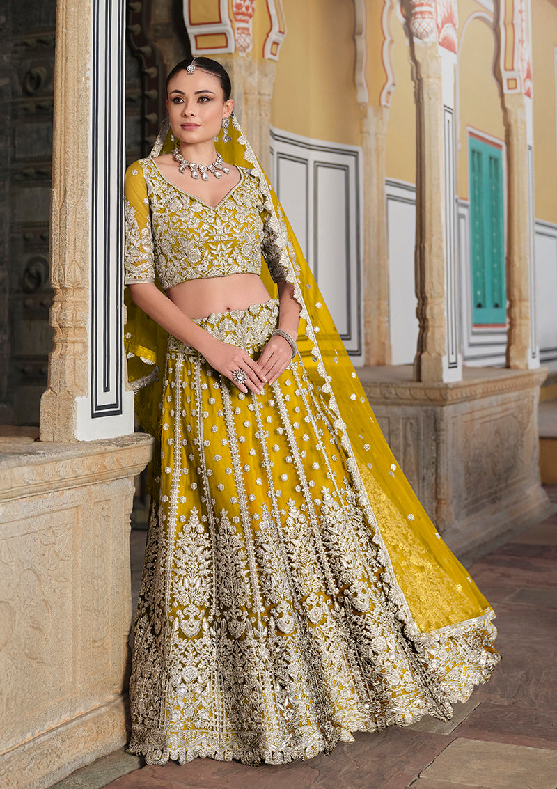 Monjolika Fashion Presents this eye catching elegant drape is perfect for any occasion. Add richer looks to your persona in this majestic Mustard butterfly net designer lehenga choli. The brilliant attire creates a dramatic canvas with amazing dimond, embroidered and sequins work. Comes with matching choli and dupatta. Please note:- Lehenga Comes Semi Stitched and blouse come unstitched.