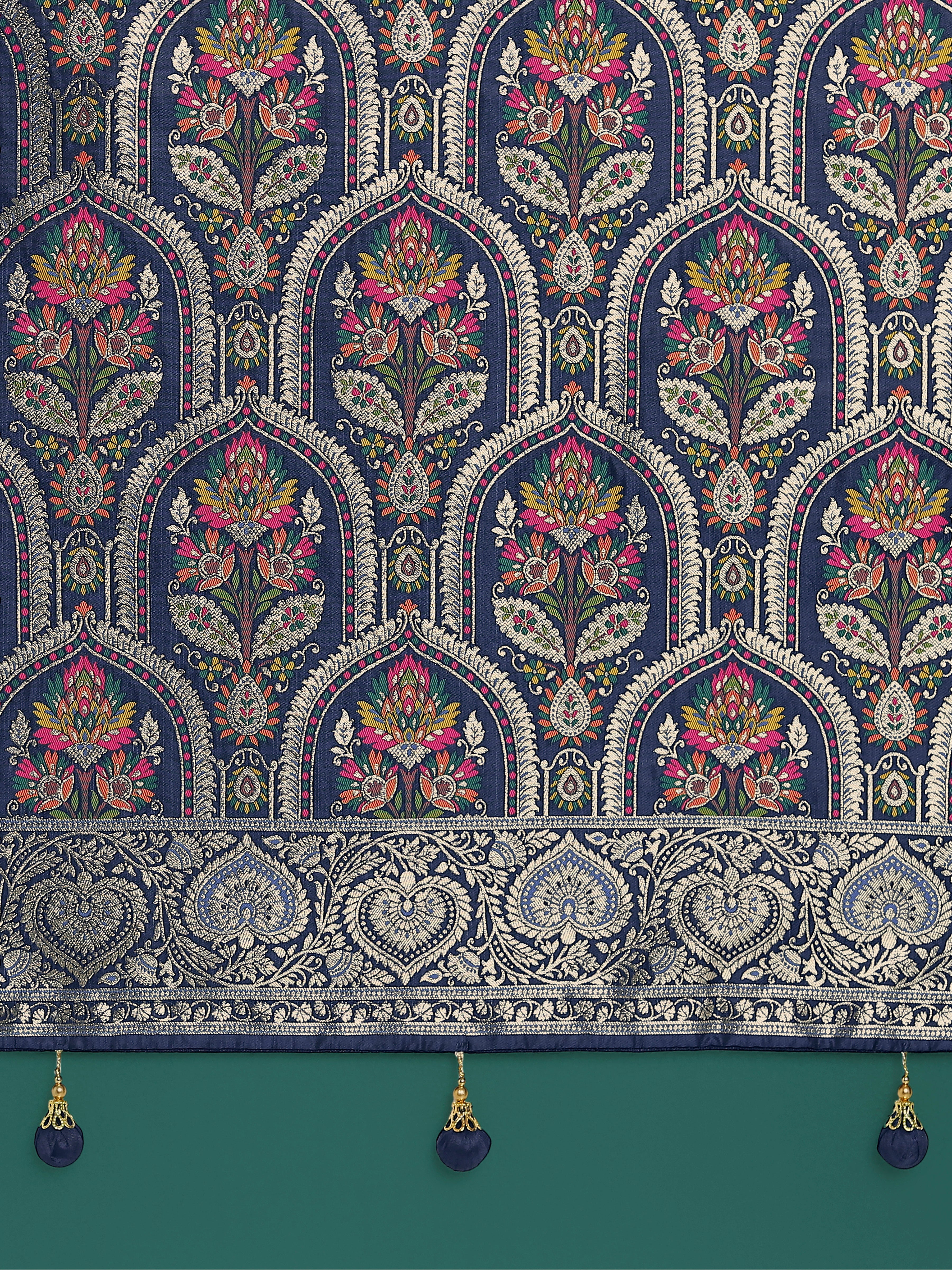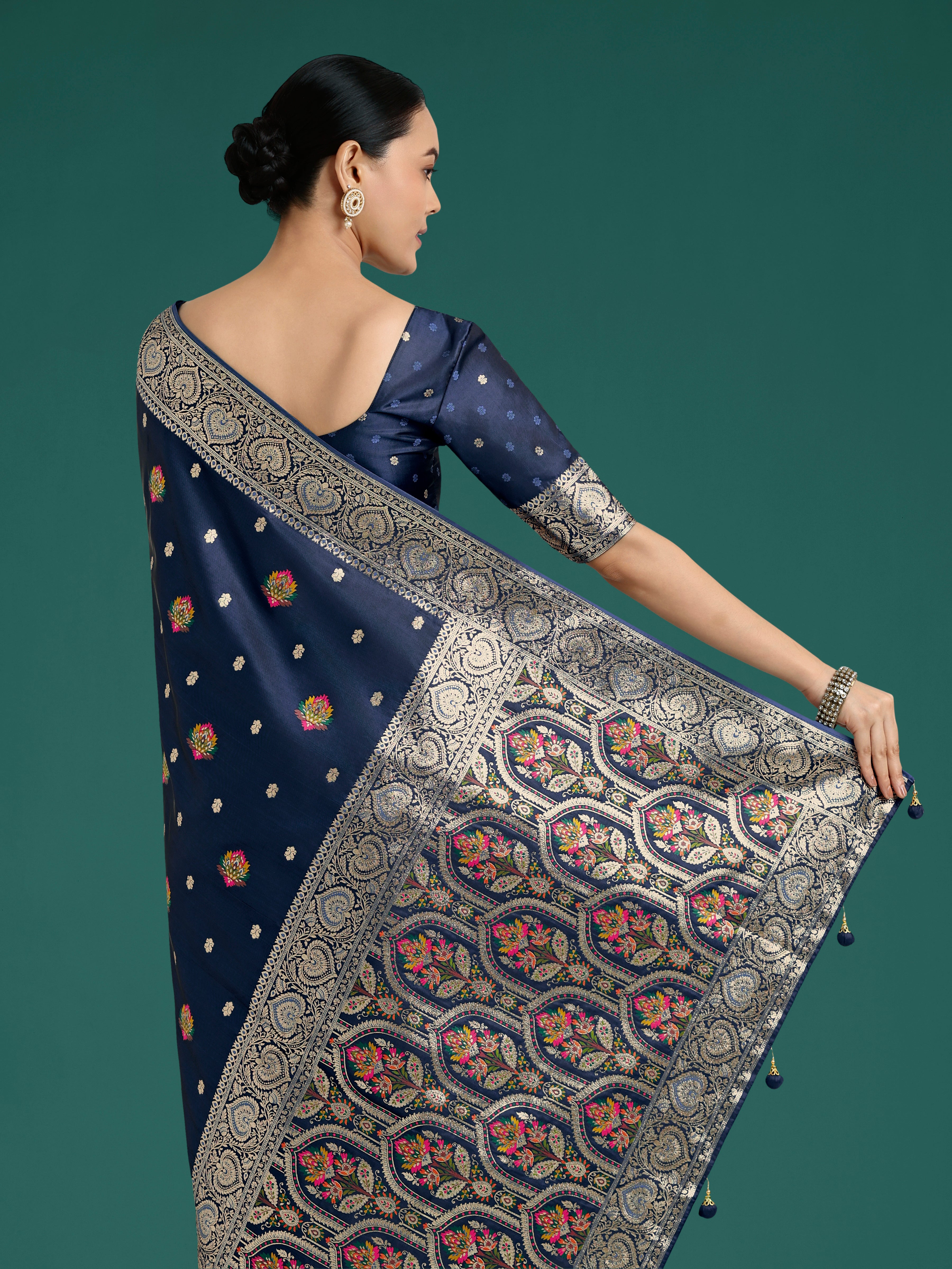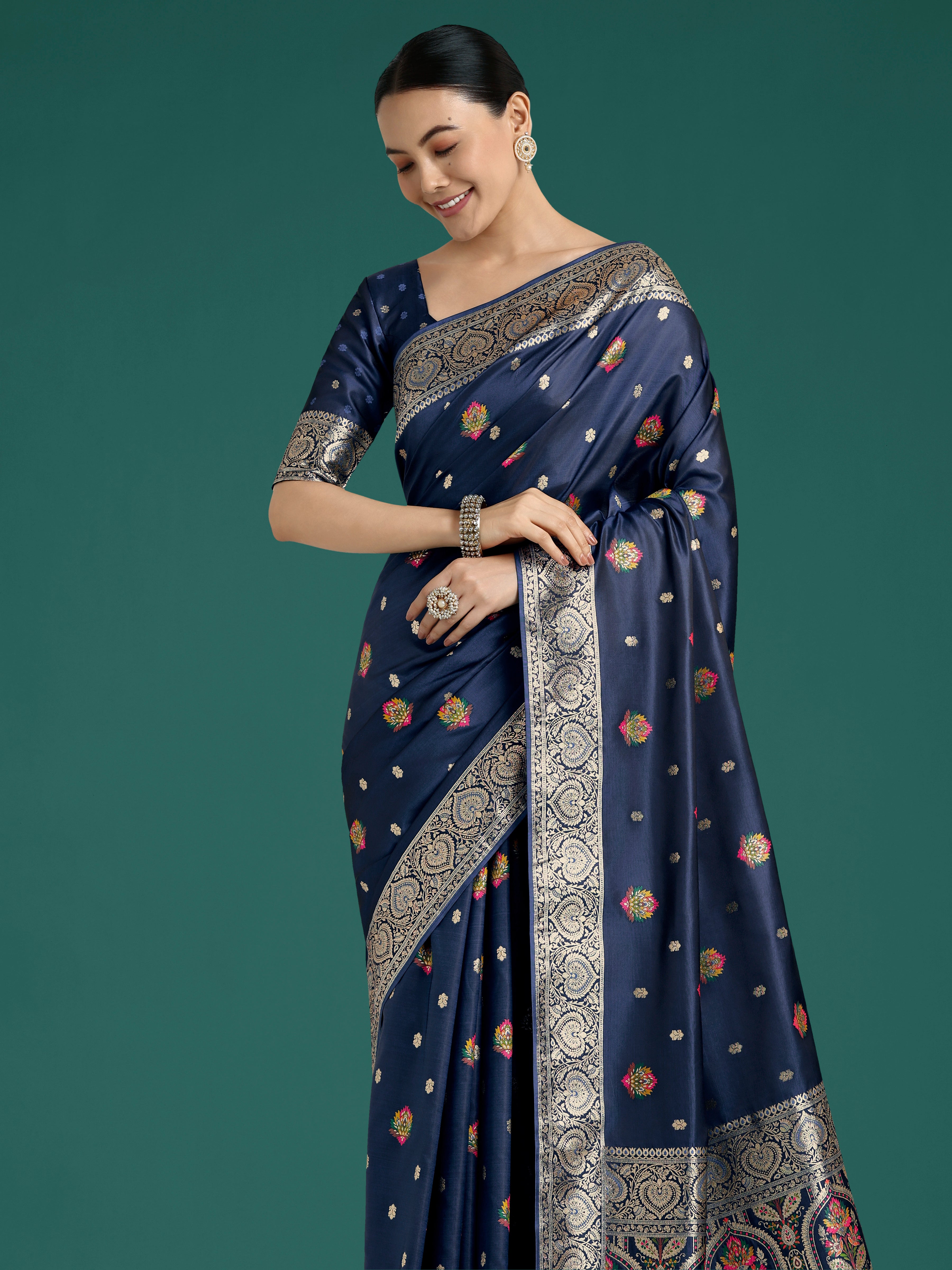 This pretty piece is a fairy tale that begins to unfold as you reveal your beauty in it. We unfurl our the intricacy and exclusivity of our creations highlighted in this lovely Navy blue banarasi satin silk contemporary saree. The brilliant attire creates a dramatic canvas with amazing zari woven work. Comes with matching blouse. (Slight variation in color, fabric & work is possible. Model images are only representative.)