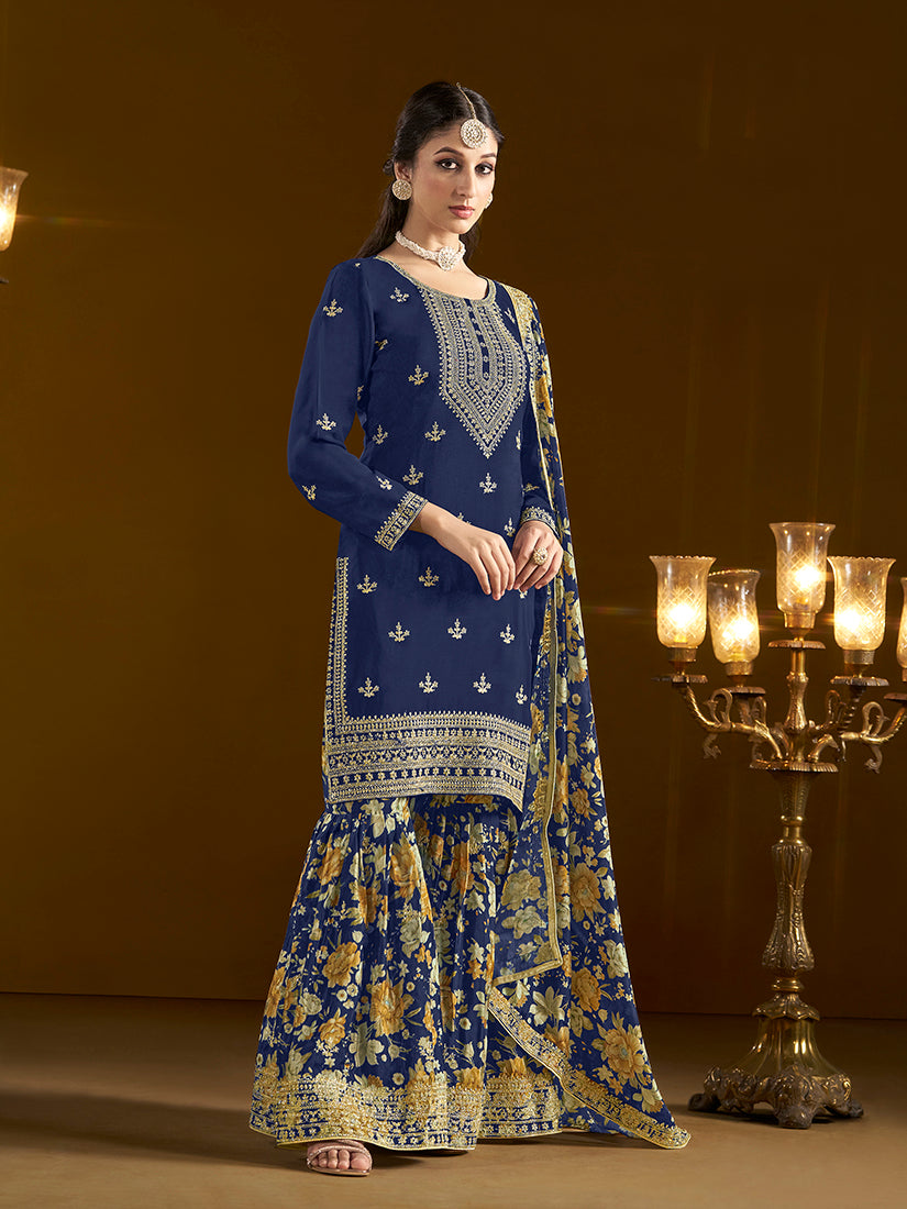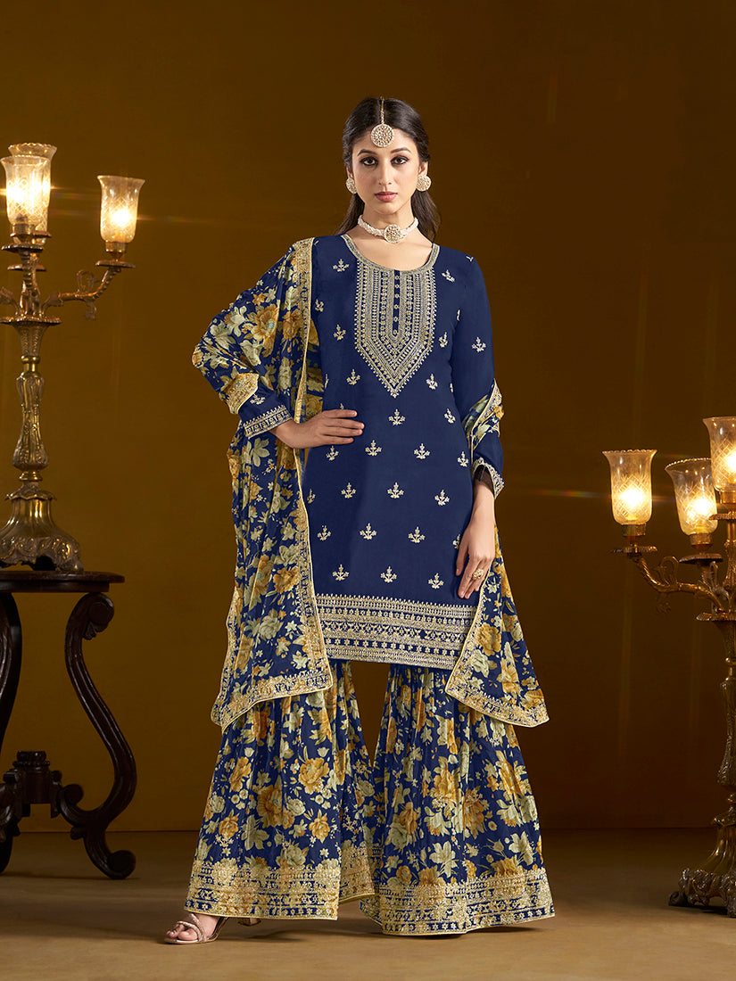 Looking amazing with attachment of Navy blue chinon trendy salwar kameez. This pretty attire is displaying some fantastic embroidery done with embroidered work. Comes with matching bottom and dupatta.