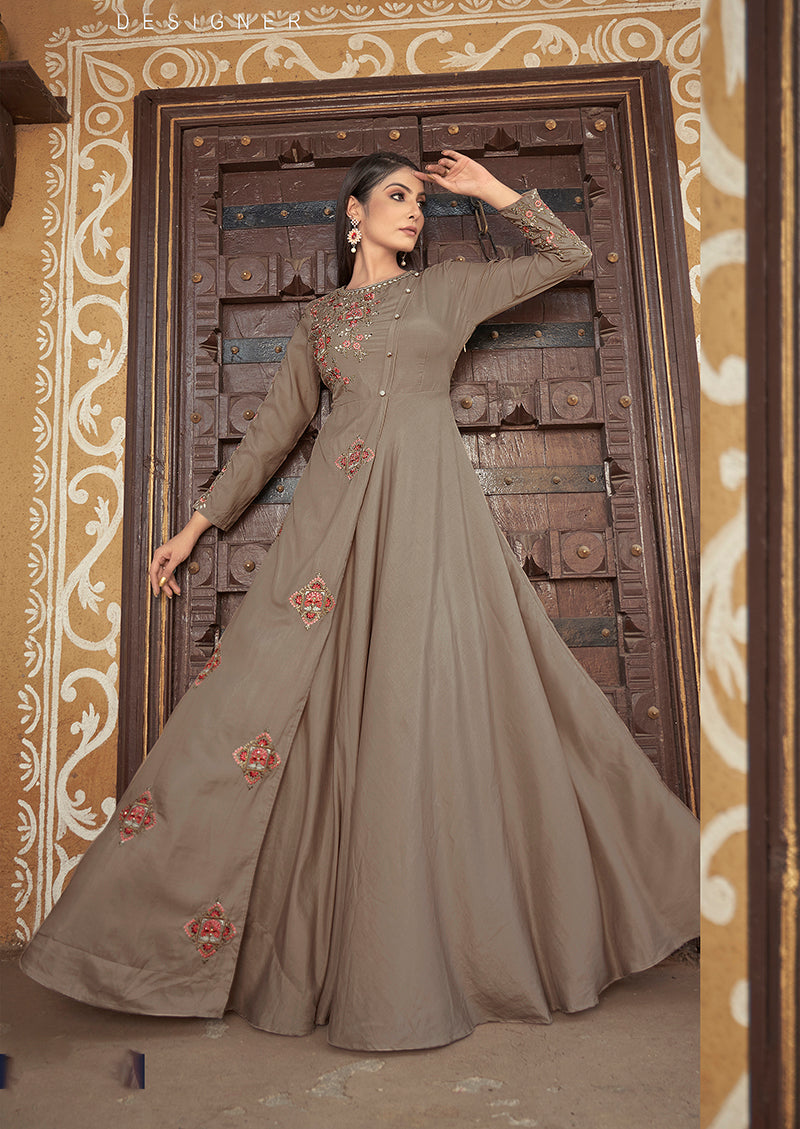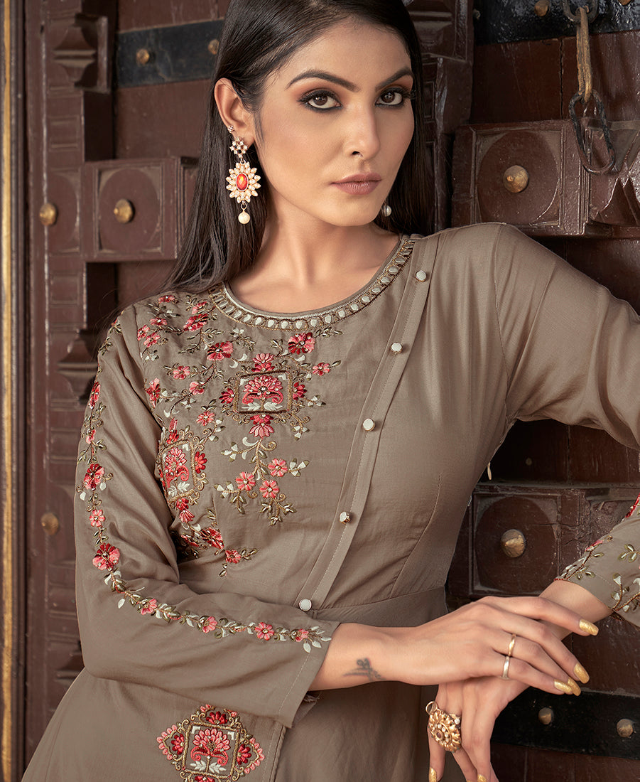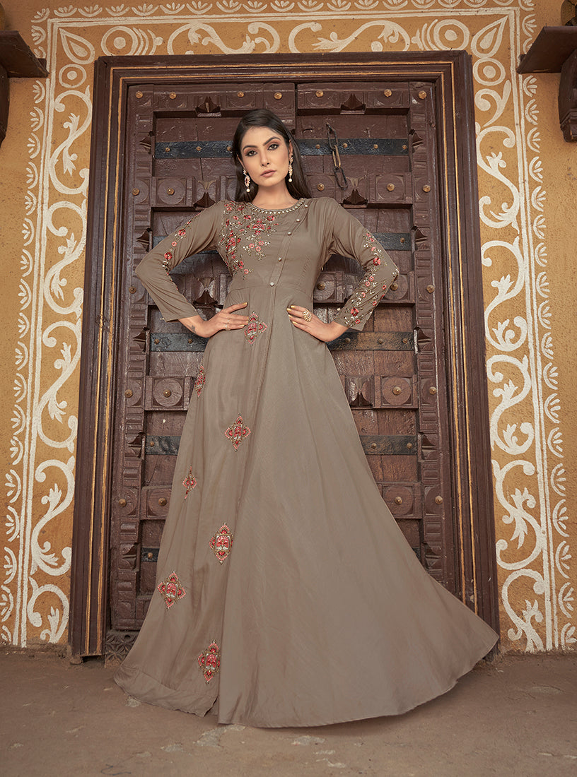 Women's beauty is magnified tenfold in this sort of a Beige Color Maslin anarkali embroidered gown. The interesting embroidered work a considerable attribute of this attire.
