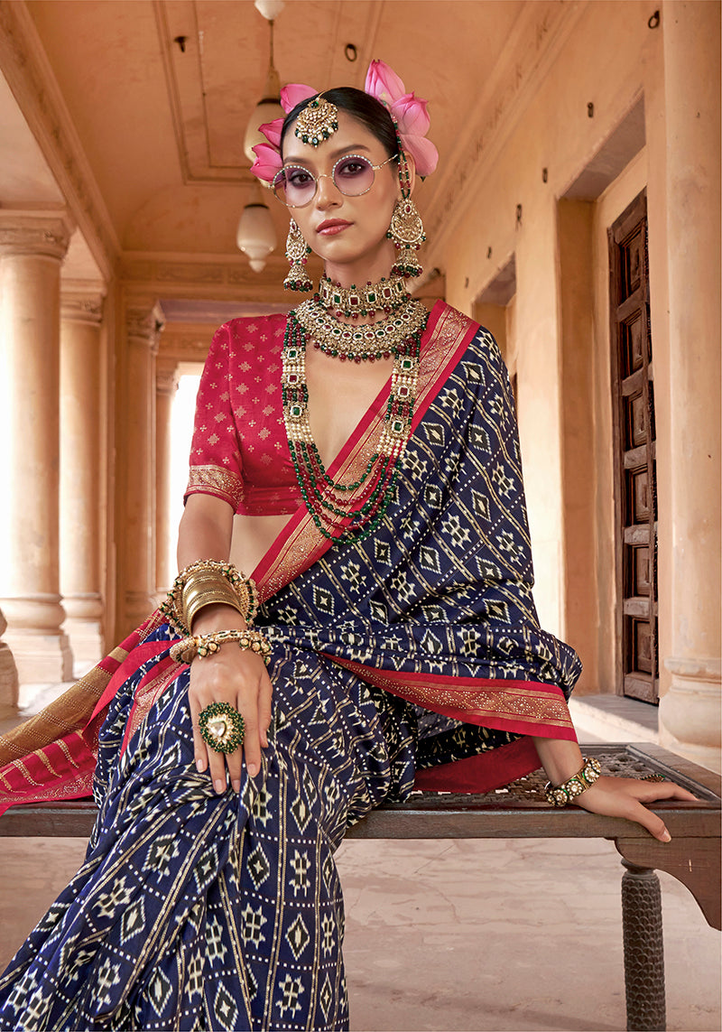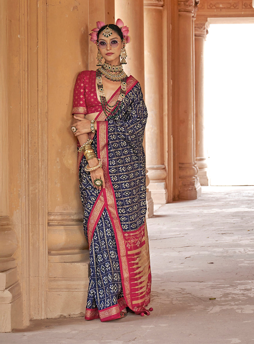 Grab the second look in this elegant attire for this season. Add grace and charm to your appearance in this beautiful navy blue silk blend classic saree. Look ravishing clad with this attire which is enhanced patola print work. Comes with unstiched blouse. (Slight variation in color, fabric & work is possible. Model images are only representative.)
