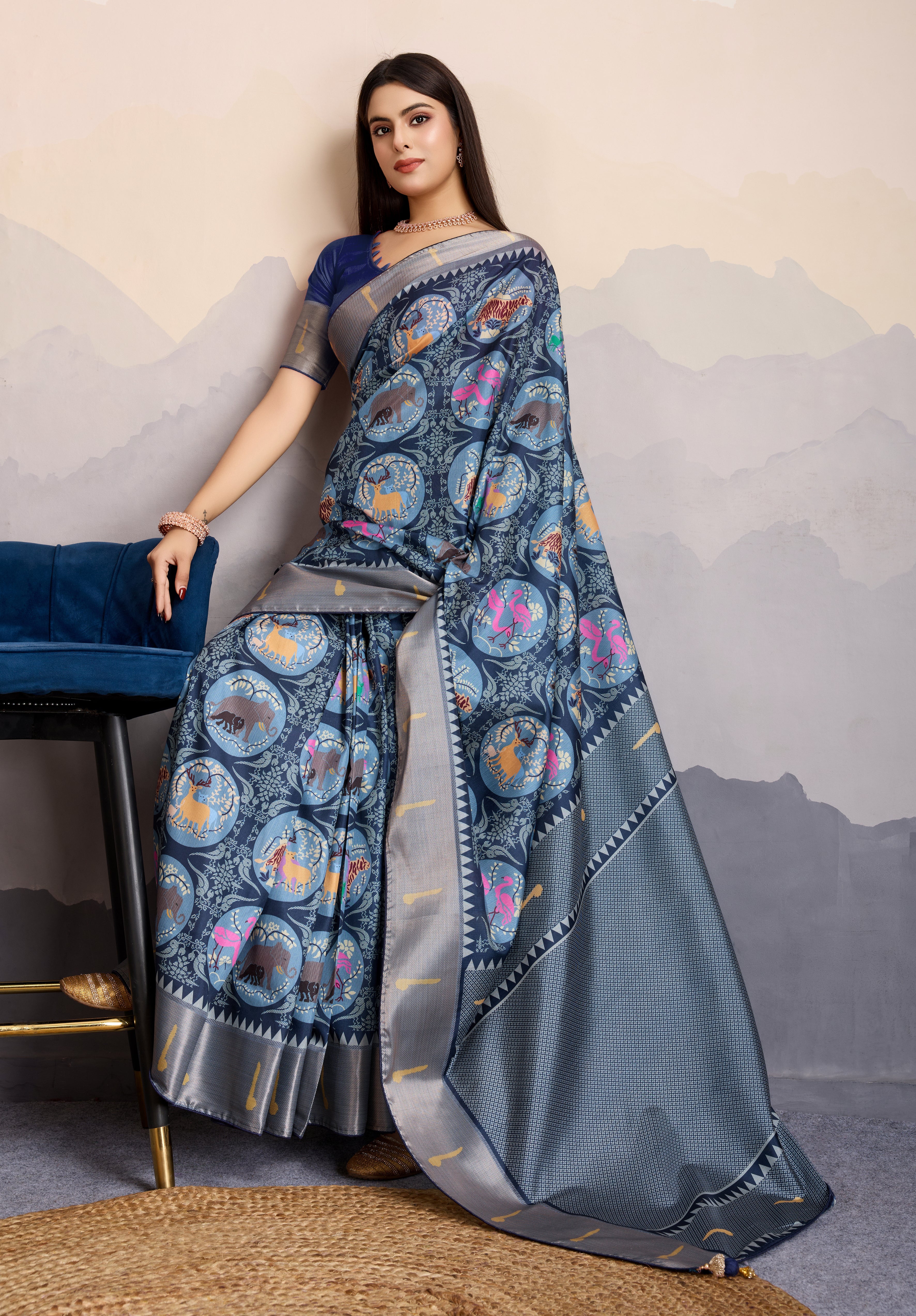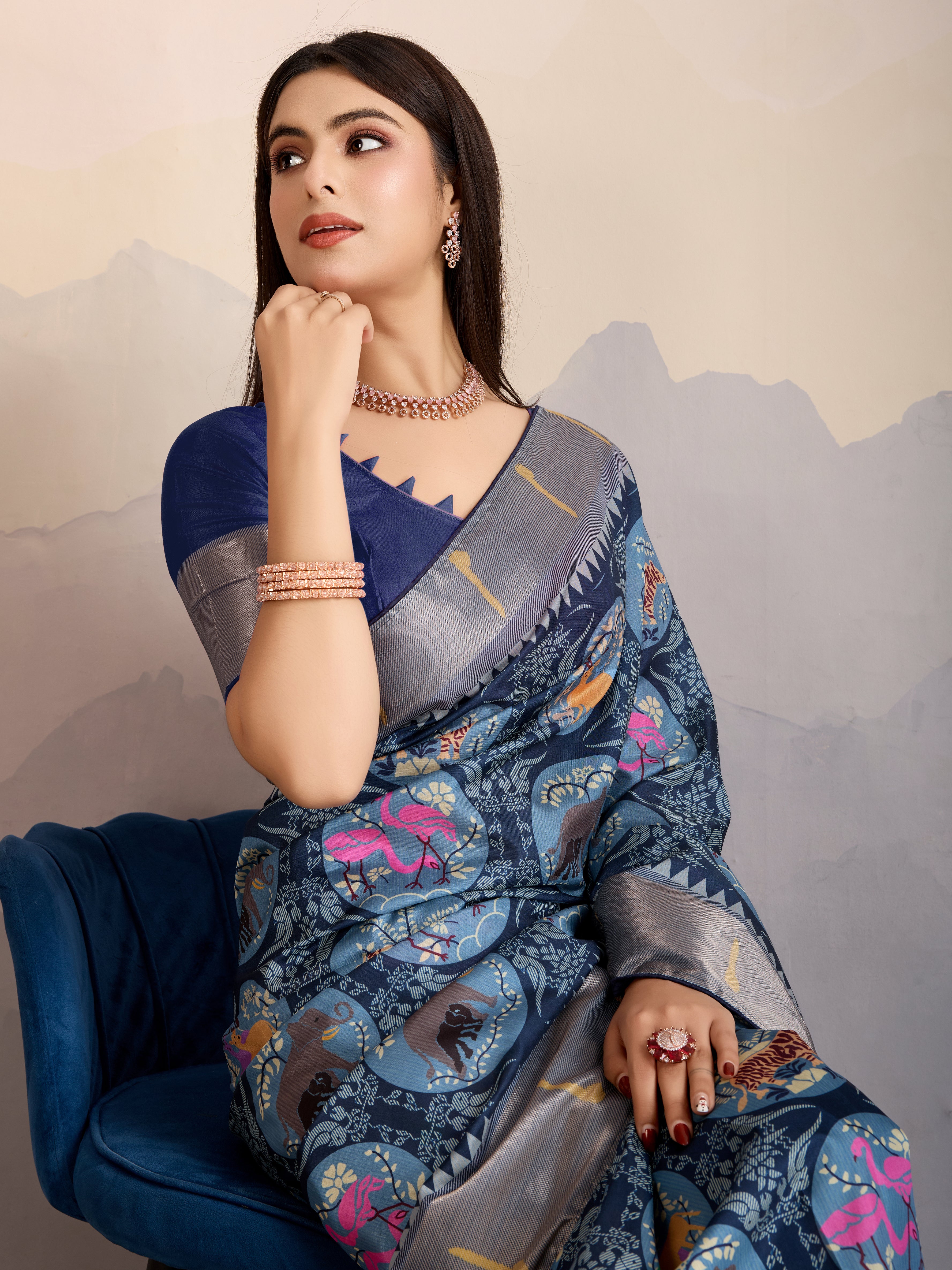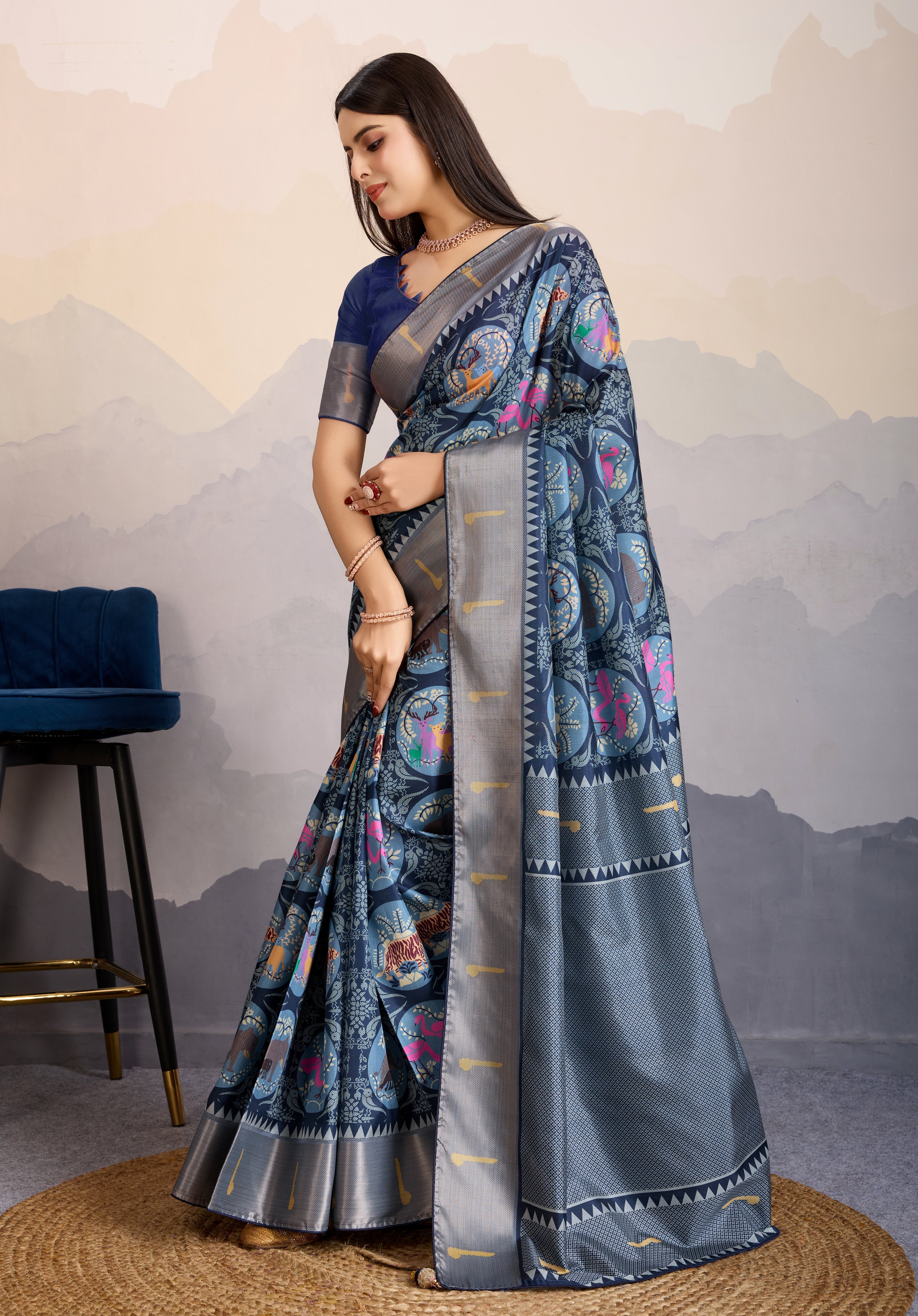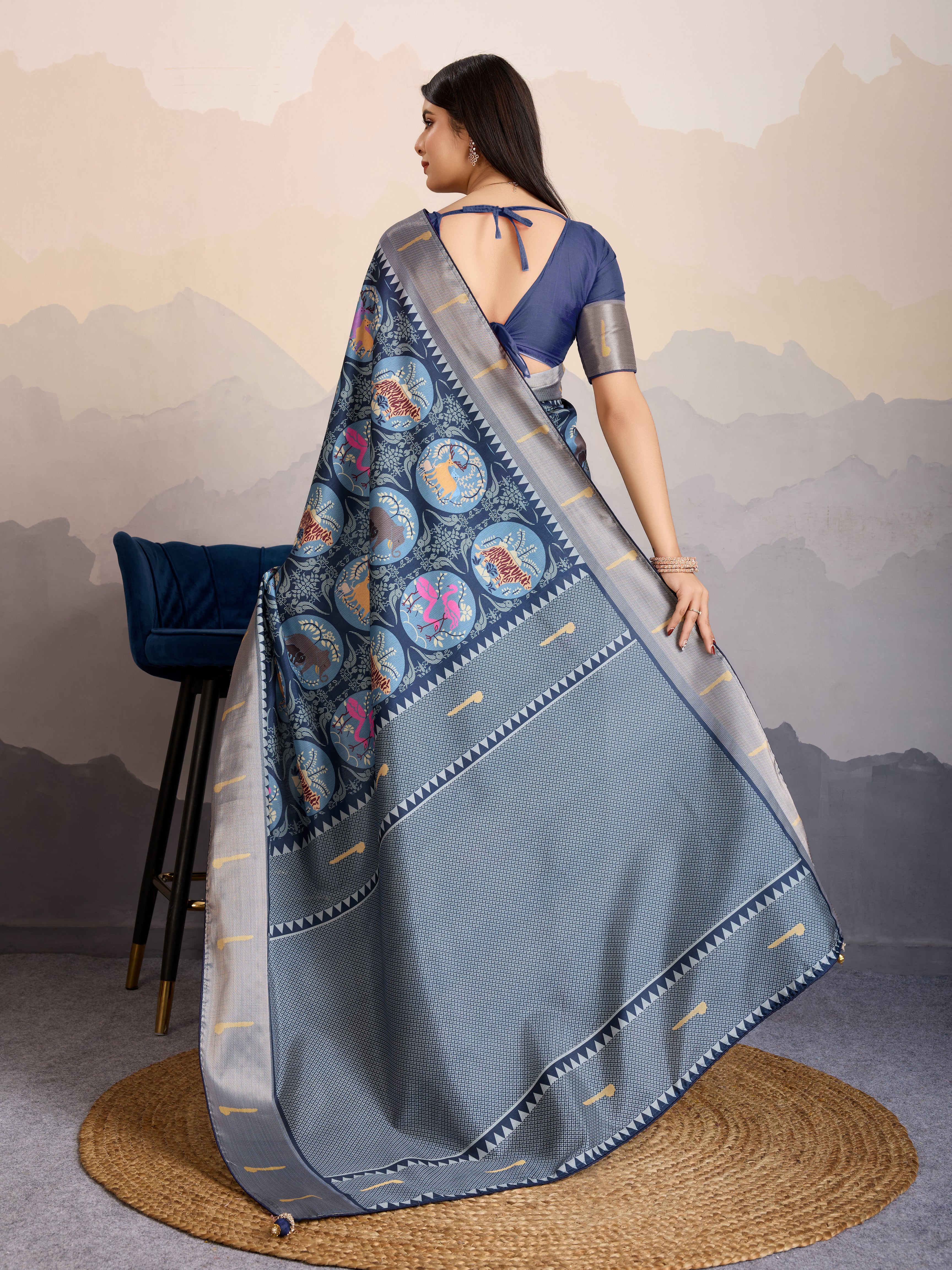 Make the heads turn whenever you costume up in such a stunning Navy blue Dola Satin traditional saree.. The border and zari patta work digital printed seems chic and great for any party. Comes with matching blouse.