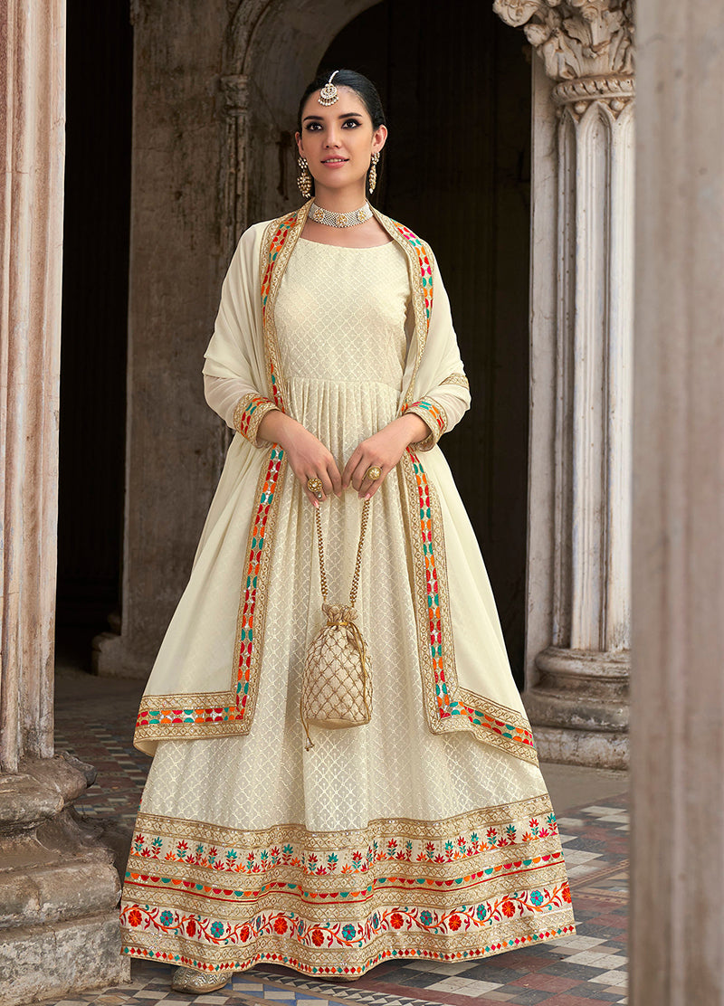 Stay Ahead In Style With This Off White Color Real Georgette Trendy Anarkali Salwar Suit. The Ethnic Sequince Embroidered Work At The Apparel Adds A Sign Of Splendor Statement For Your Look. Comes With Matching Bottom And Georgette Dupatta.