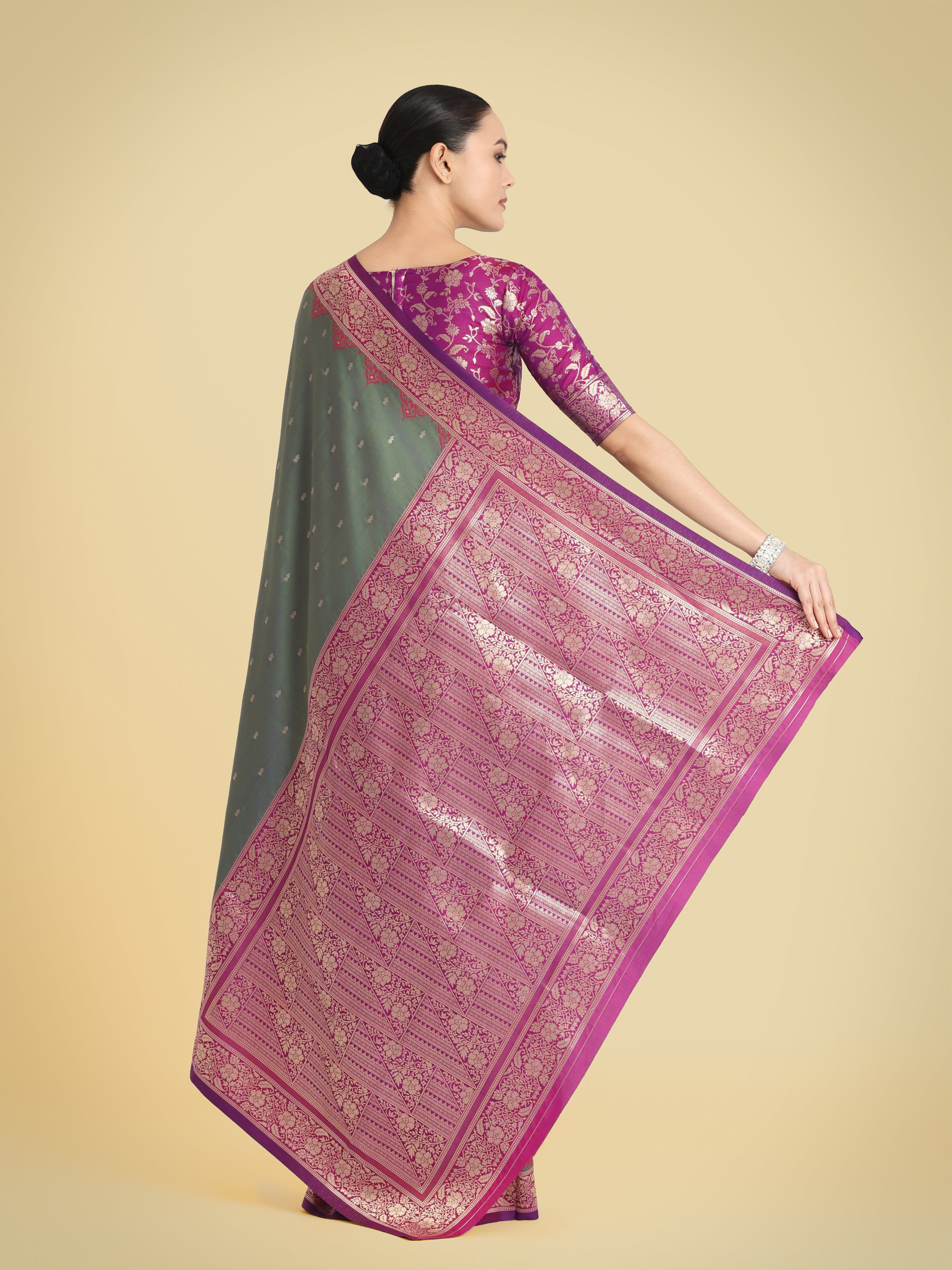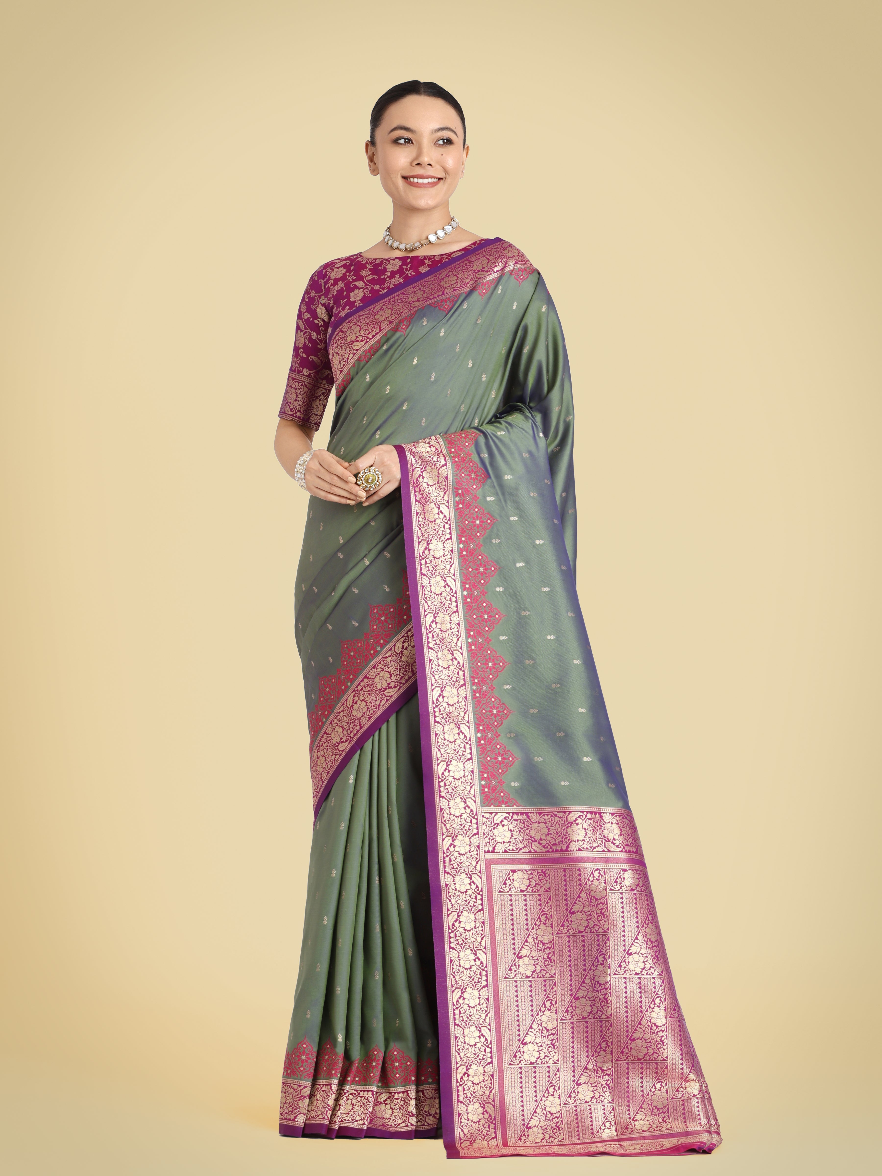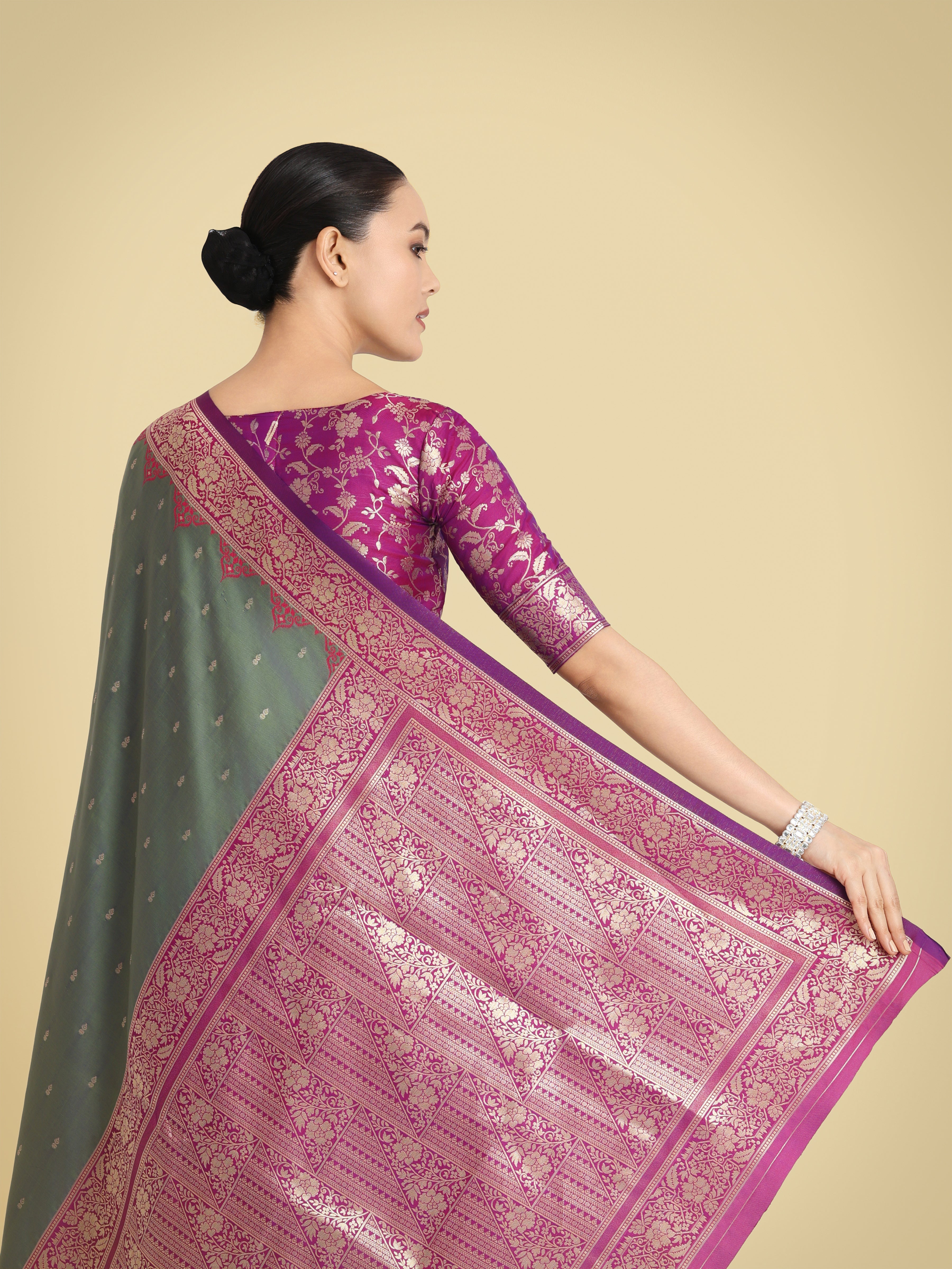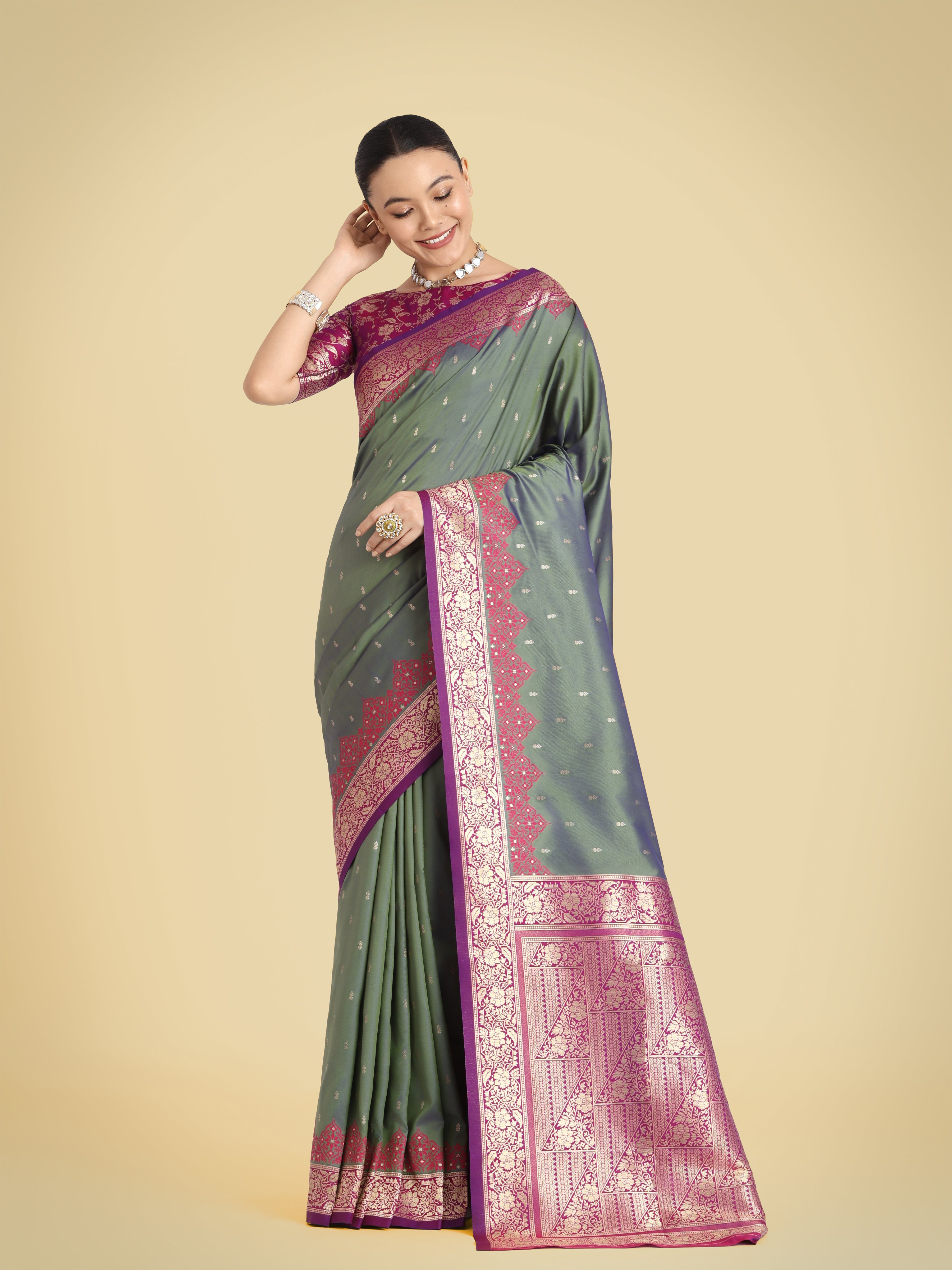 Monjolika Fashion Presents Embrace the perfect blend of tradition and style with this Olive green banarasi soft silk saree. Featuring an intricate butti design across the body and rich zari woven borders, this saree is a must-have for your ethnic wardrobe. Its luxurious texture and vibrant hues make it an ideal choice for festive gatherings and celebrations. Pair it with statement jewelry to enhance its timeless beauty and make a lasting impression.