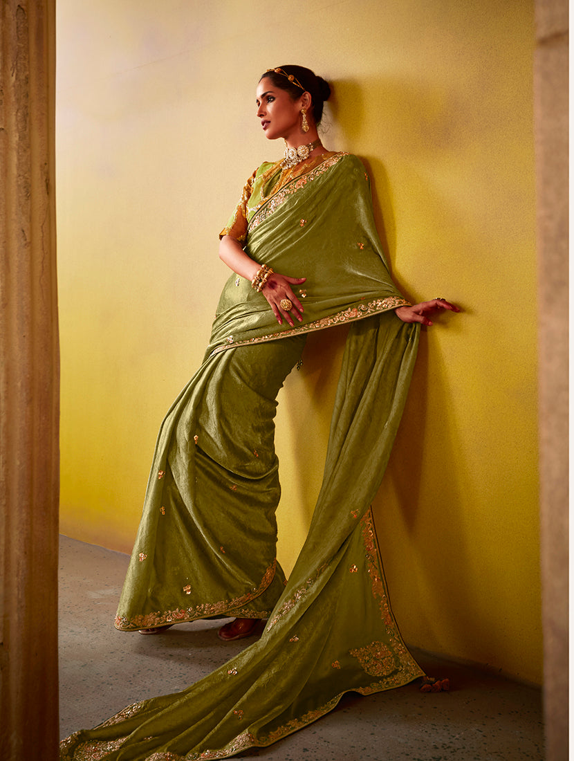 This exquisite olive saree is a timeless piece that radiates elegance and sophistication. Made from a rich, flowing fabric, it is adorned with delicate gold embroidery along the border, creating a refined and regal appeal. The saree drapes beautifully, making it perfect for festive occasions, weddings, and special gatherings.