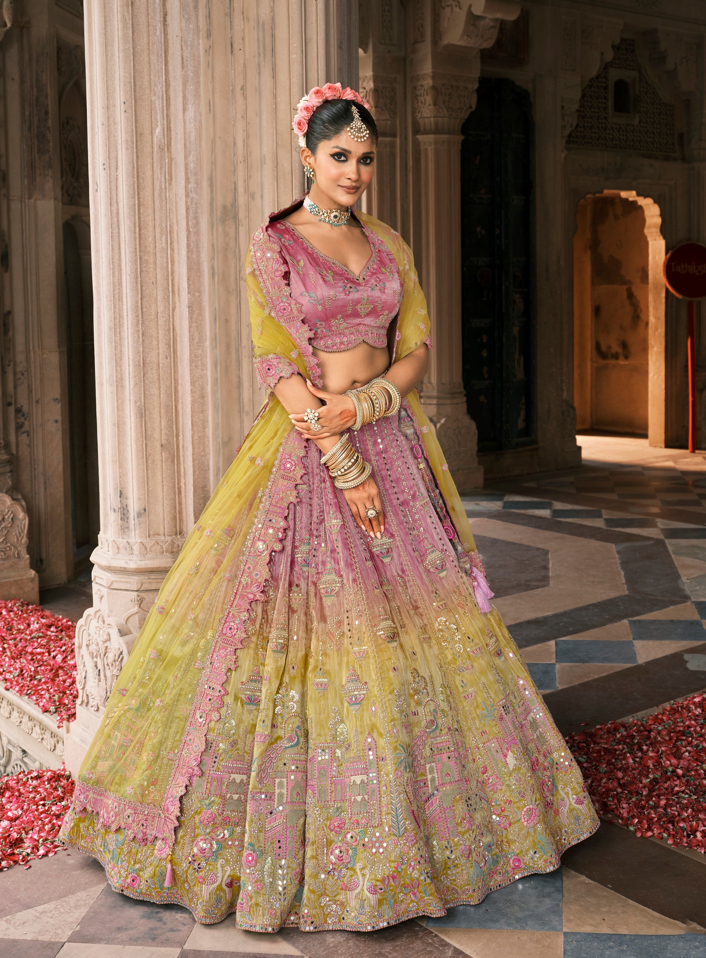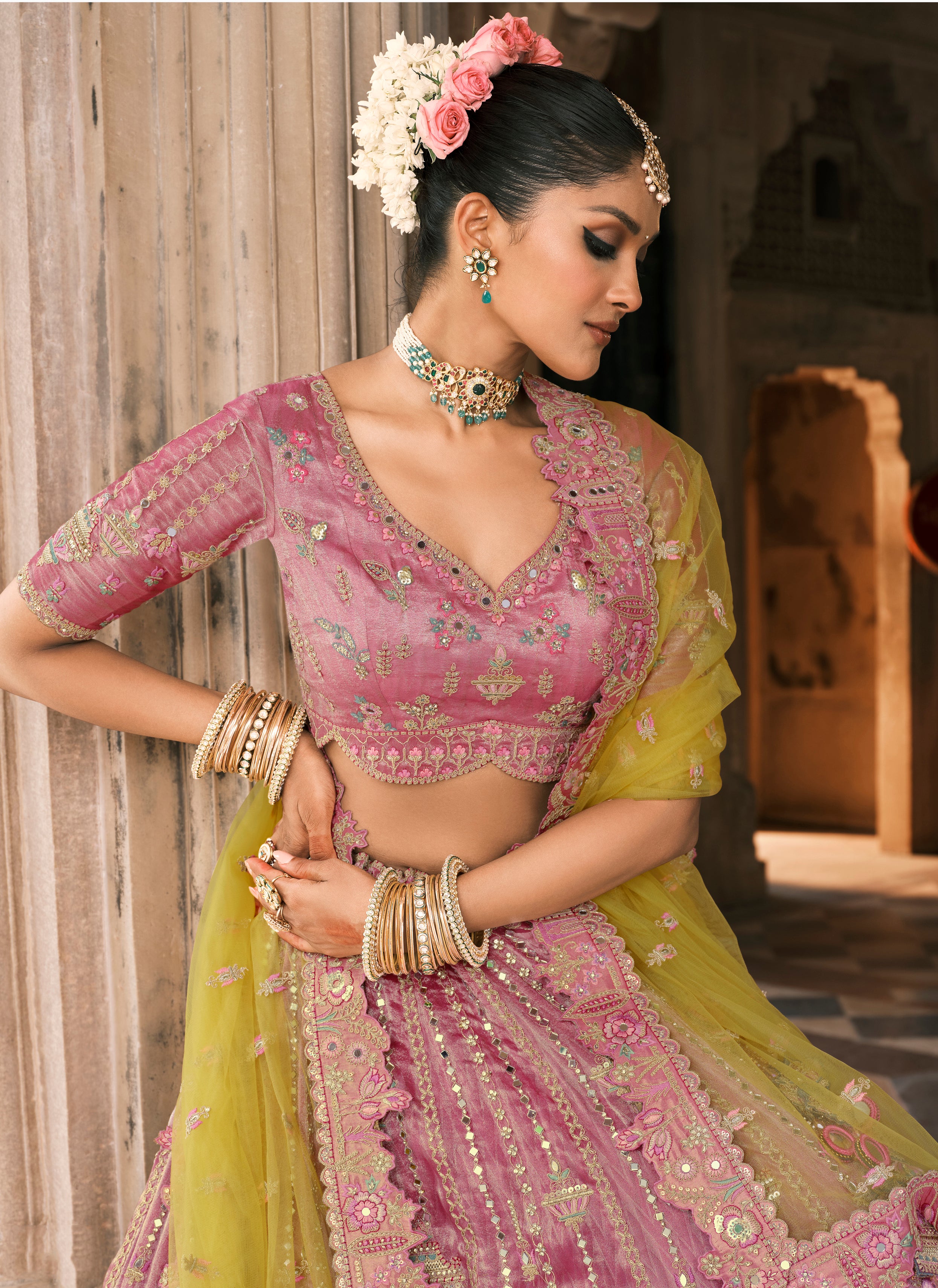 Product Code : 59786Colour : Lehenga :- Onion Pink | Blouse :-Pink | Dupatta:- Light Green