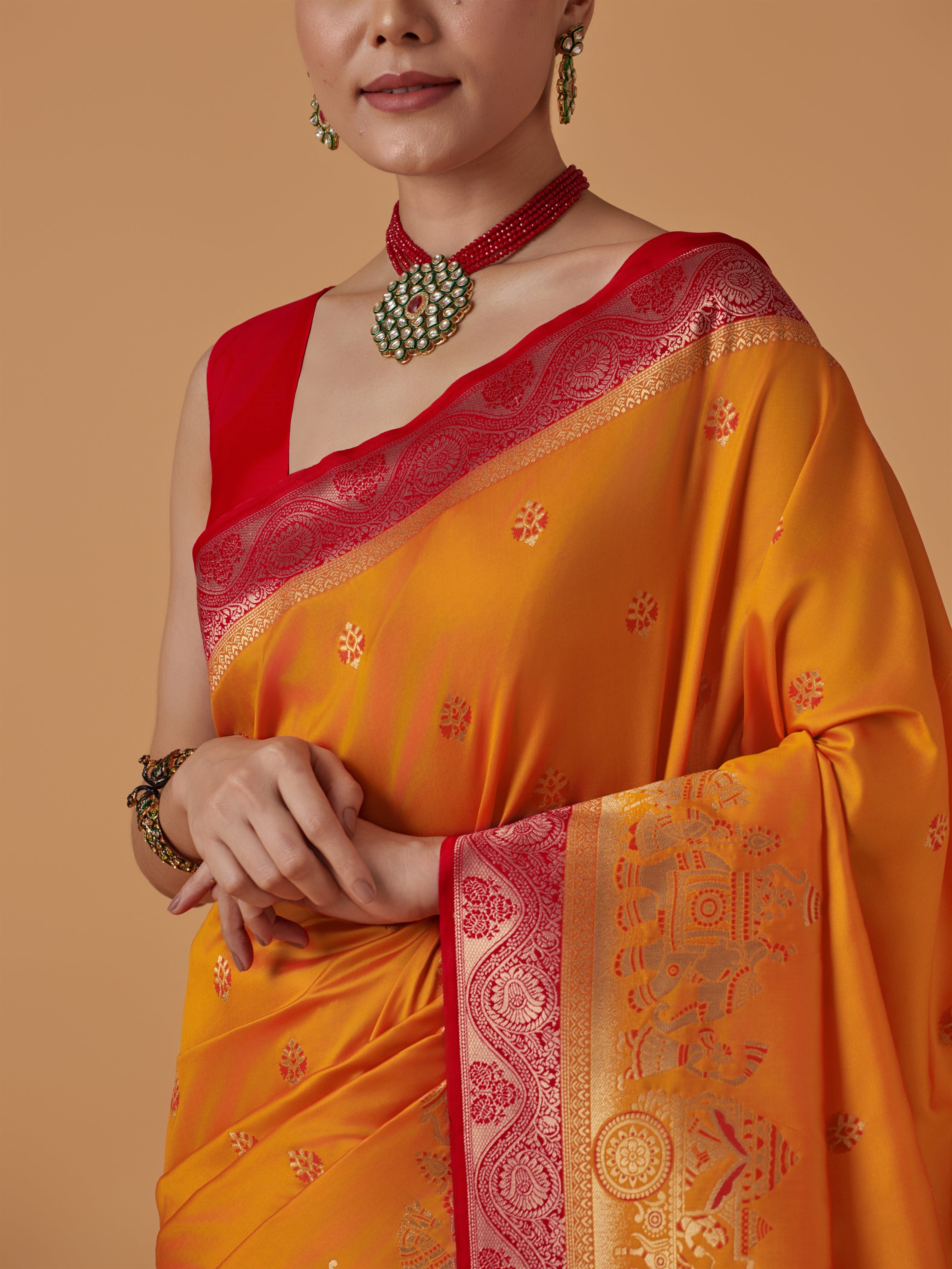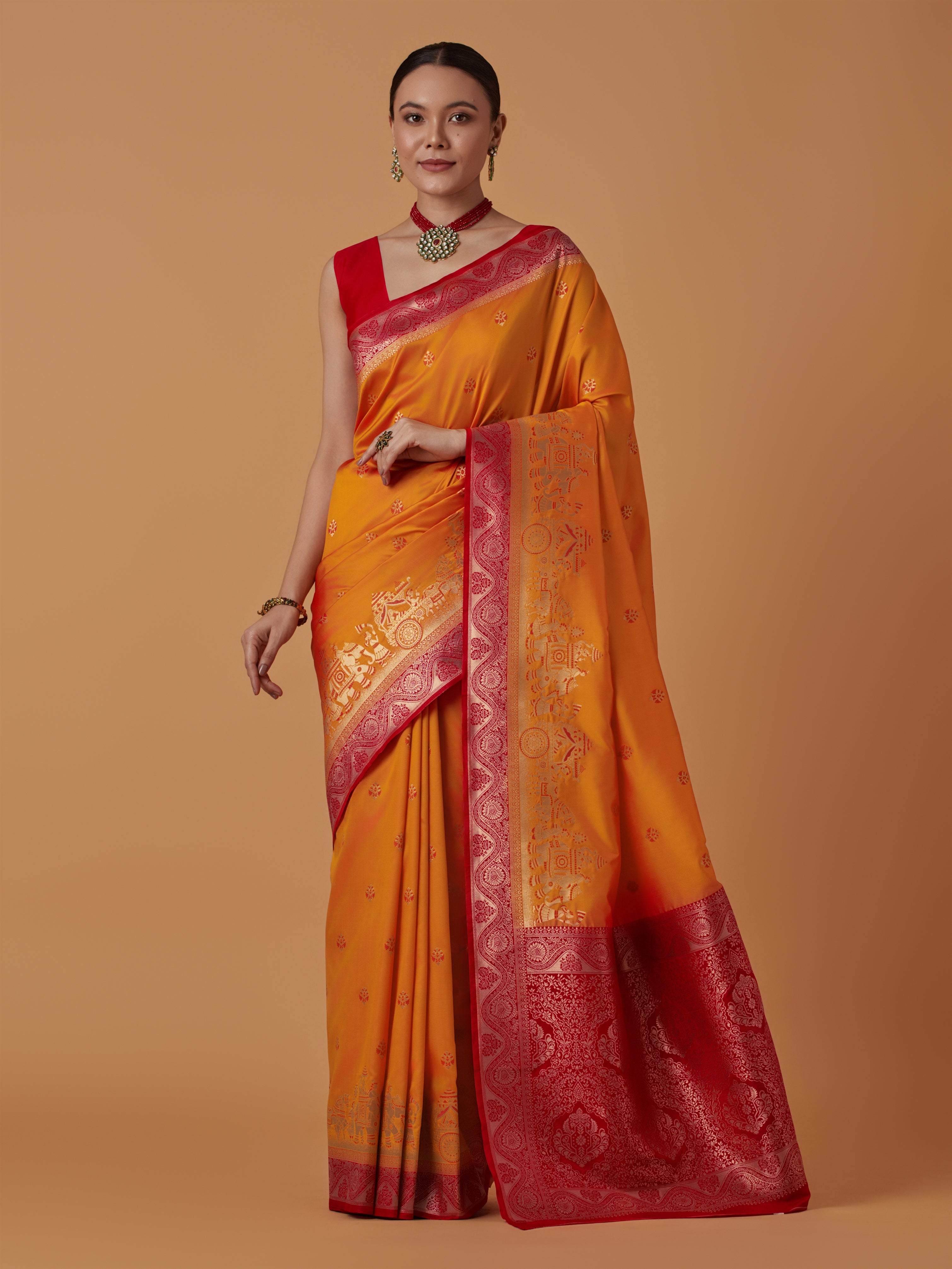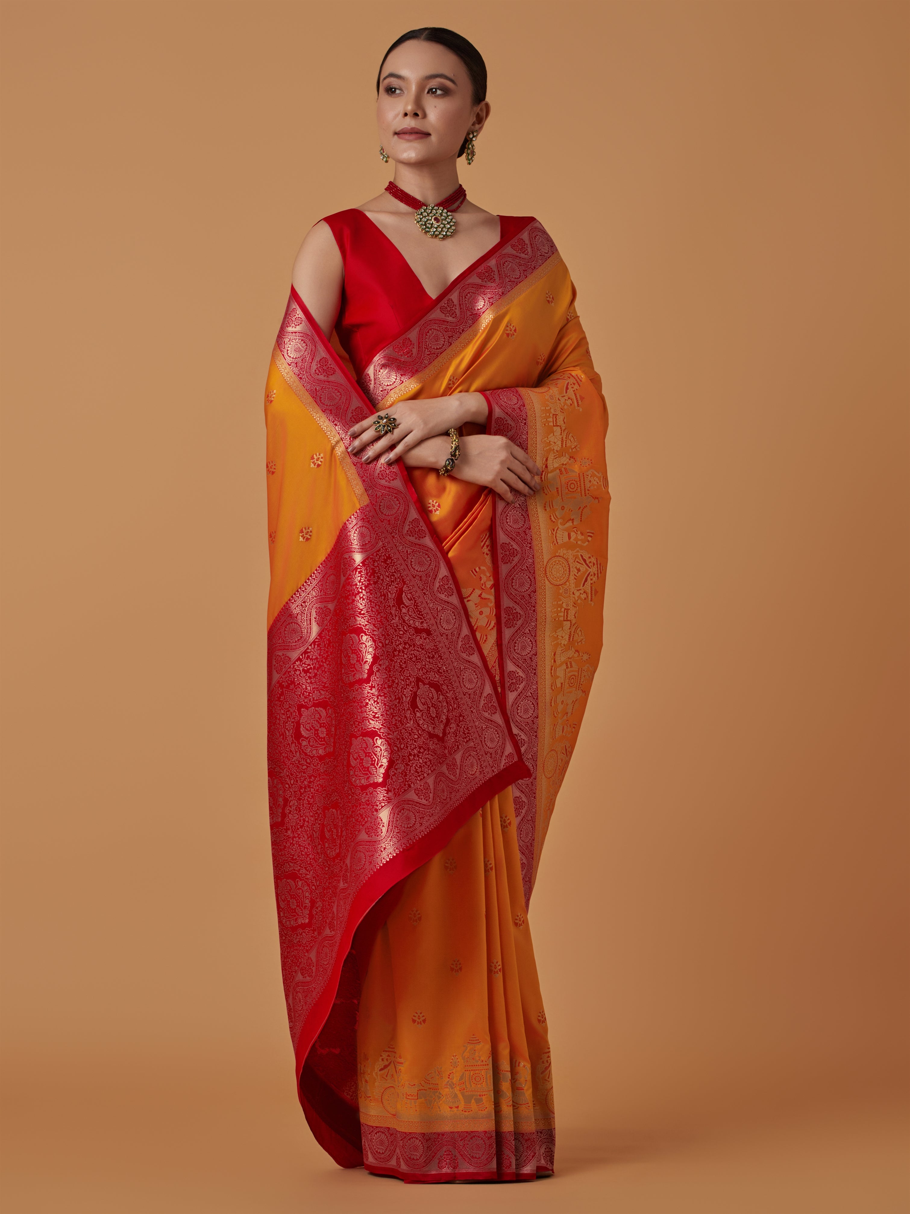 Orange Banarasi Silk Blend Saree, Featuring The Iconic Dulha Dulhan Design That Beautifully Symbolizes Love And Tradition. Adorned With Intricate Zari Weaving And A Vibrant Contrast Pallu, Pair It With Traditional Jewelry To Complete Your Look.