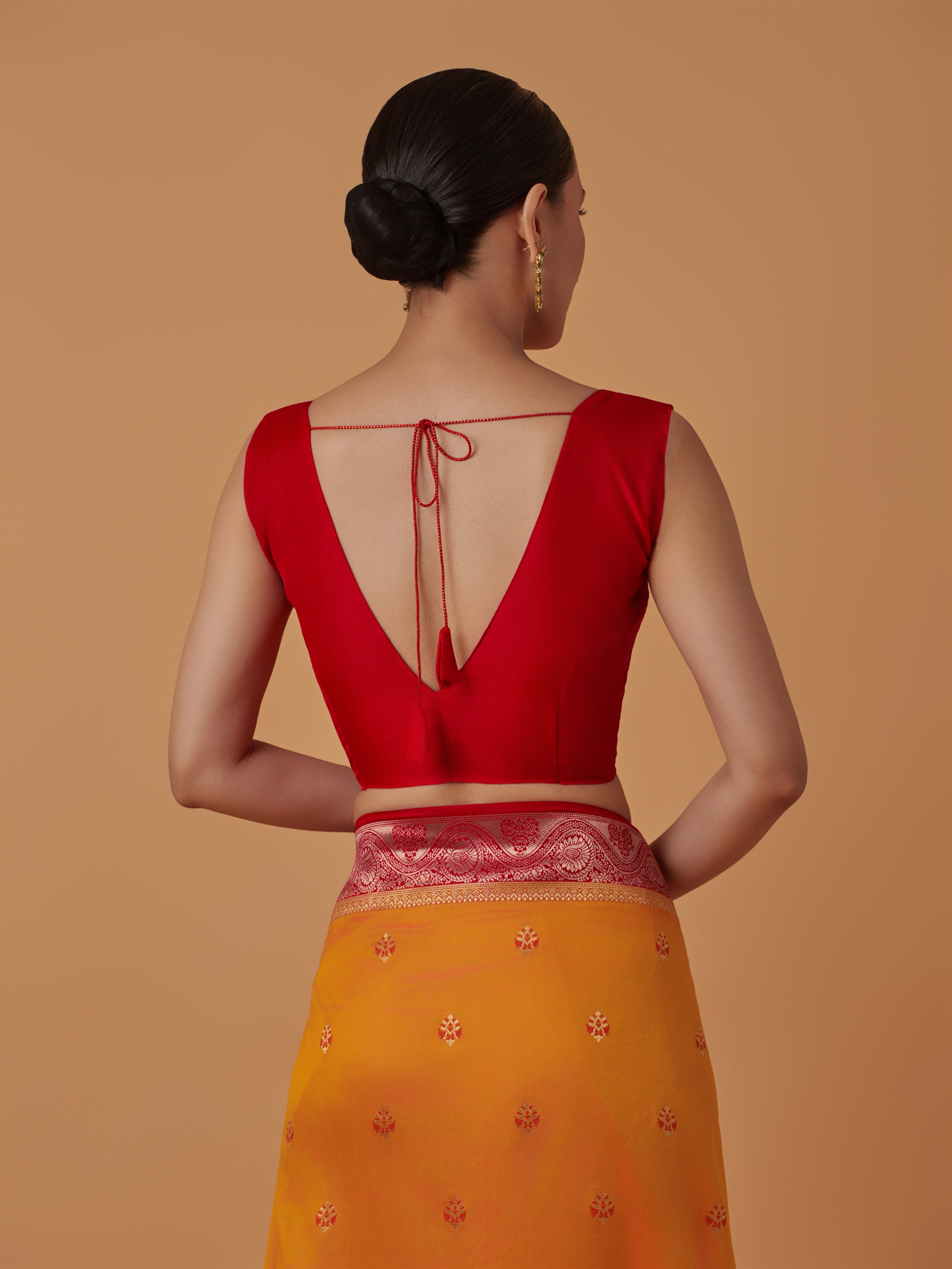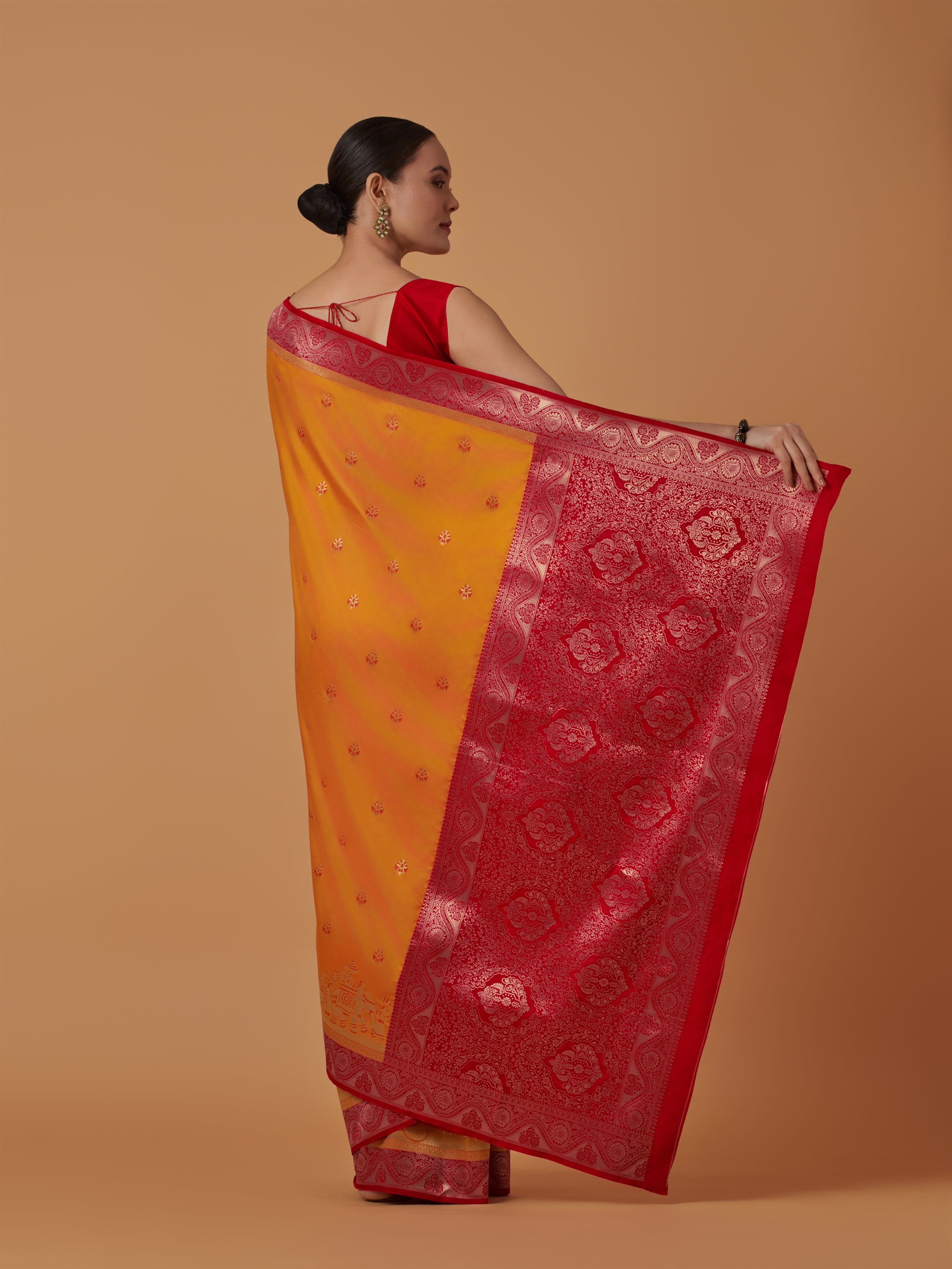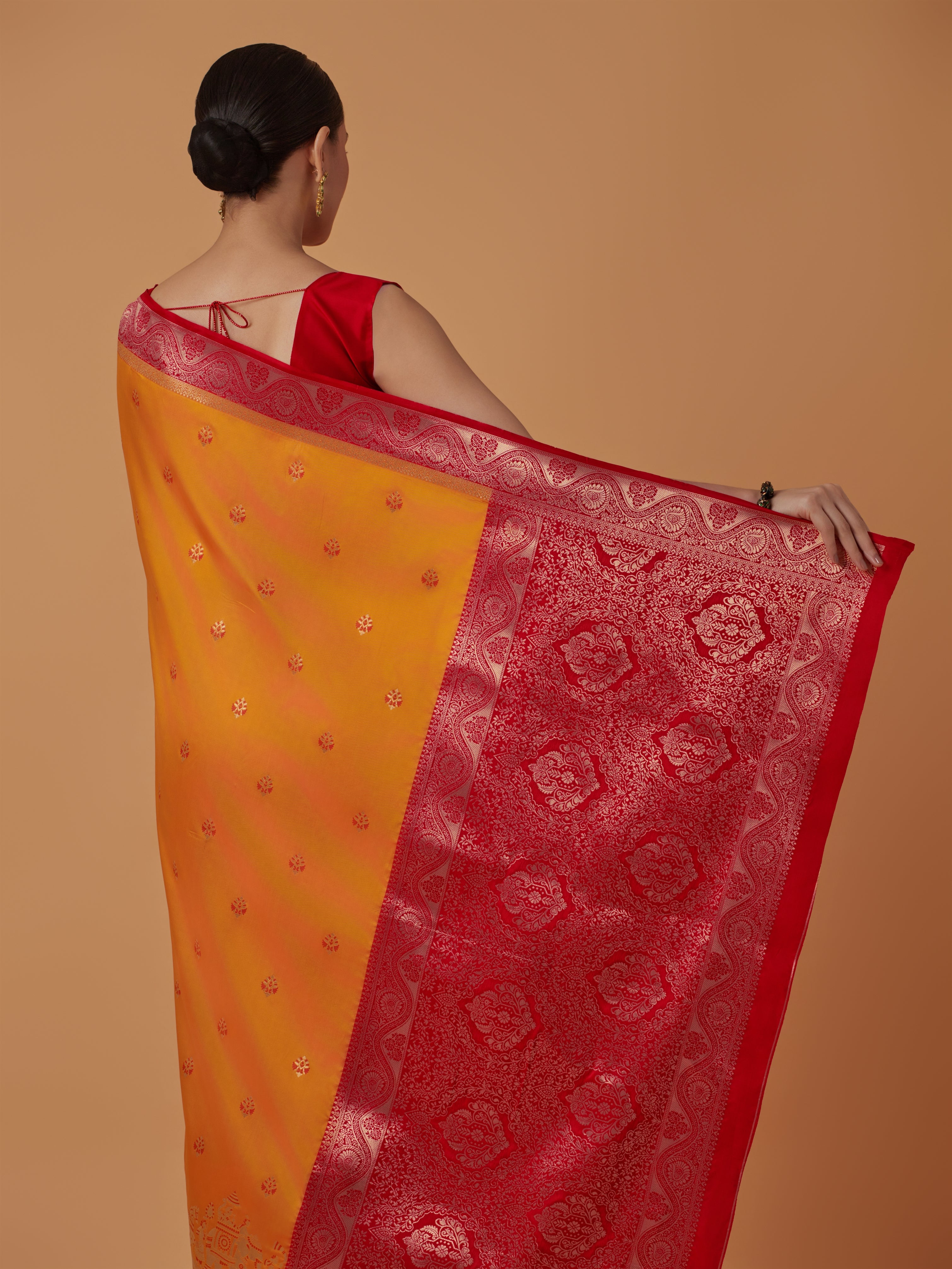 Orange Banarasi Silk Blend Saree, Featuring The Iconic Dulha Dulhan Design That Beautifully Symbolizes Love And Tradition. Adorned With Intricate Zari Weaving And A Vibrant Contrast Pallu, Pair It With Traditional Jewelry To Complete Your Look.