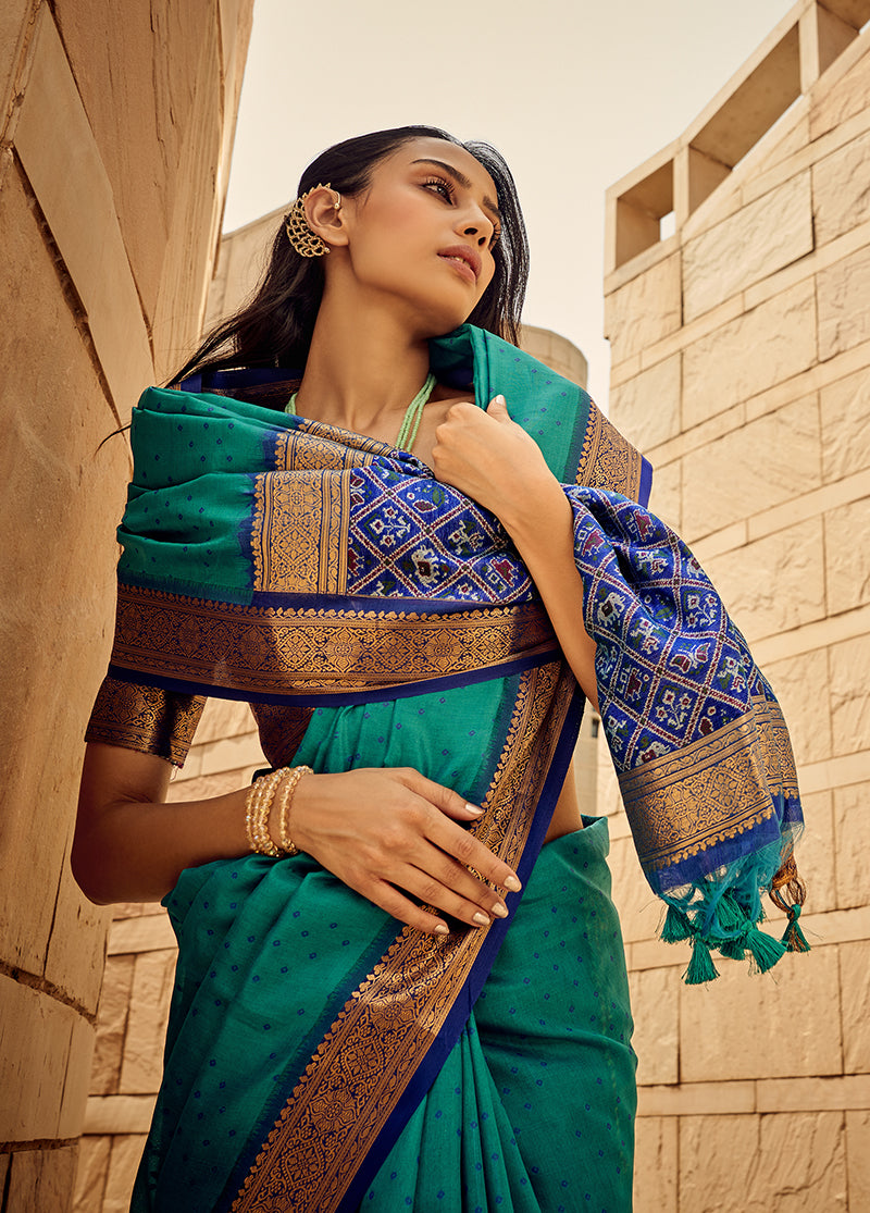 Monjolika Fashion Presents Step into cultural elegance with this Zari Woven Silk Saree with Patola Style Pallu, a true masterpiece that brings together two rich weaving traditions in one exquisite drape. The saree elegant zari weaving on the border and pallu with traditional Patola patterns. Lightweight yet rich in appearance, this saree is perfect for Diwali, Navratri, or any special occasion.