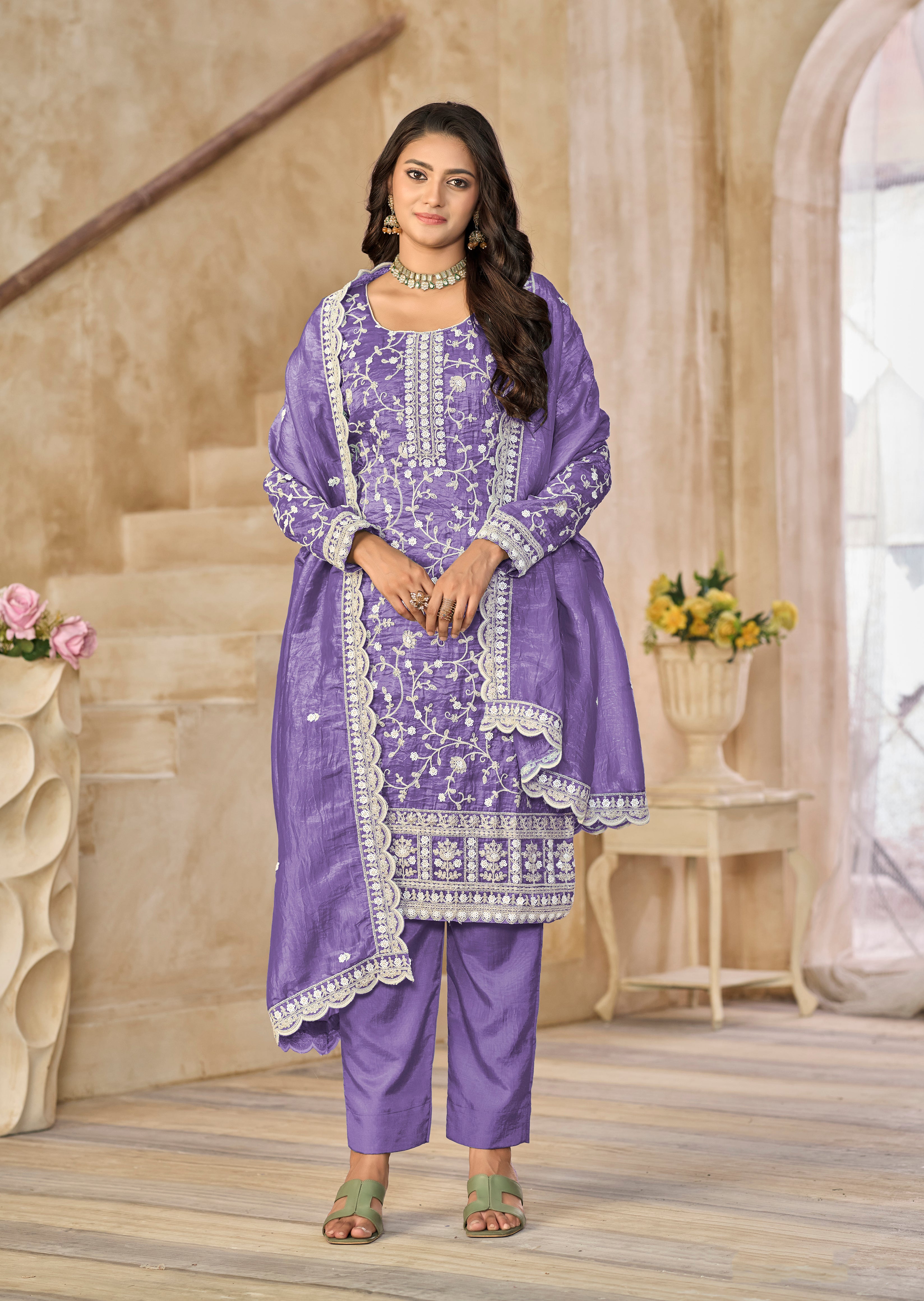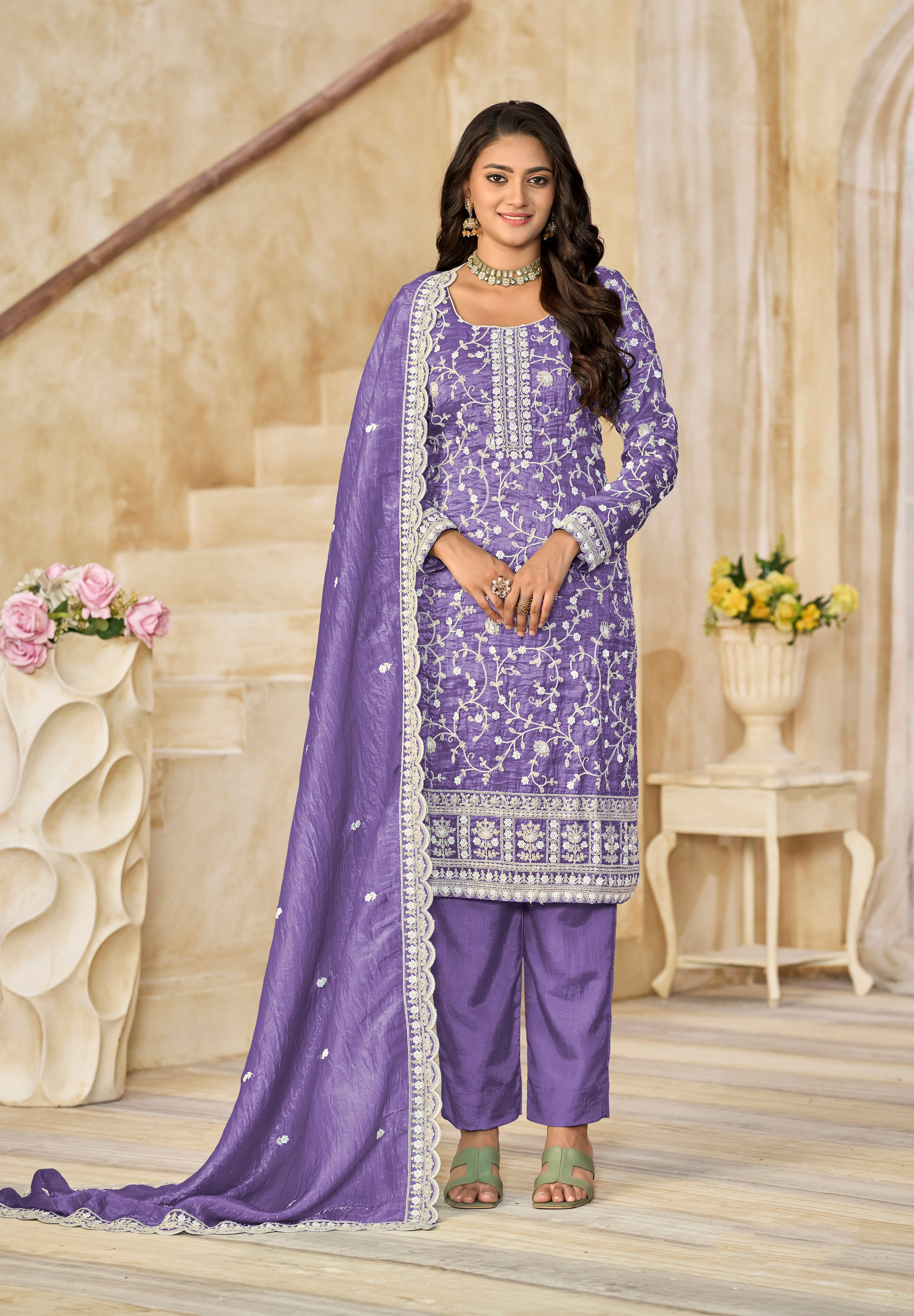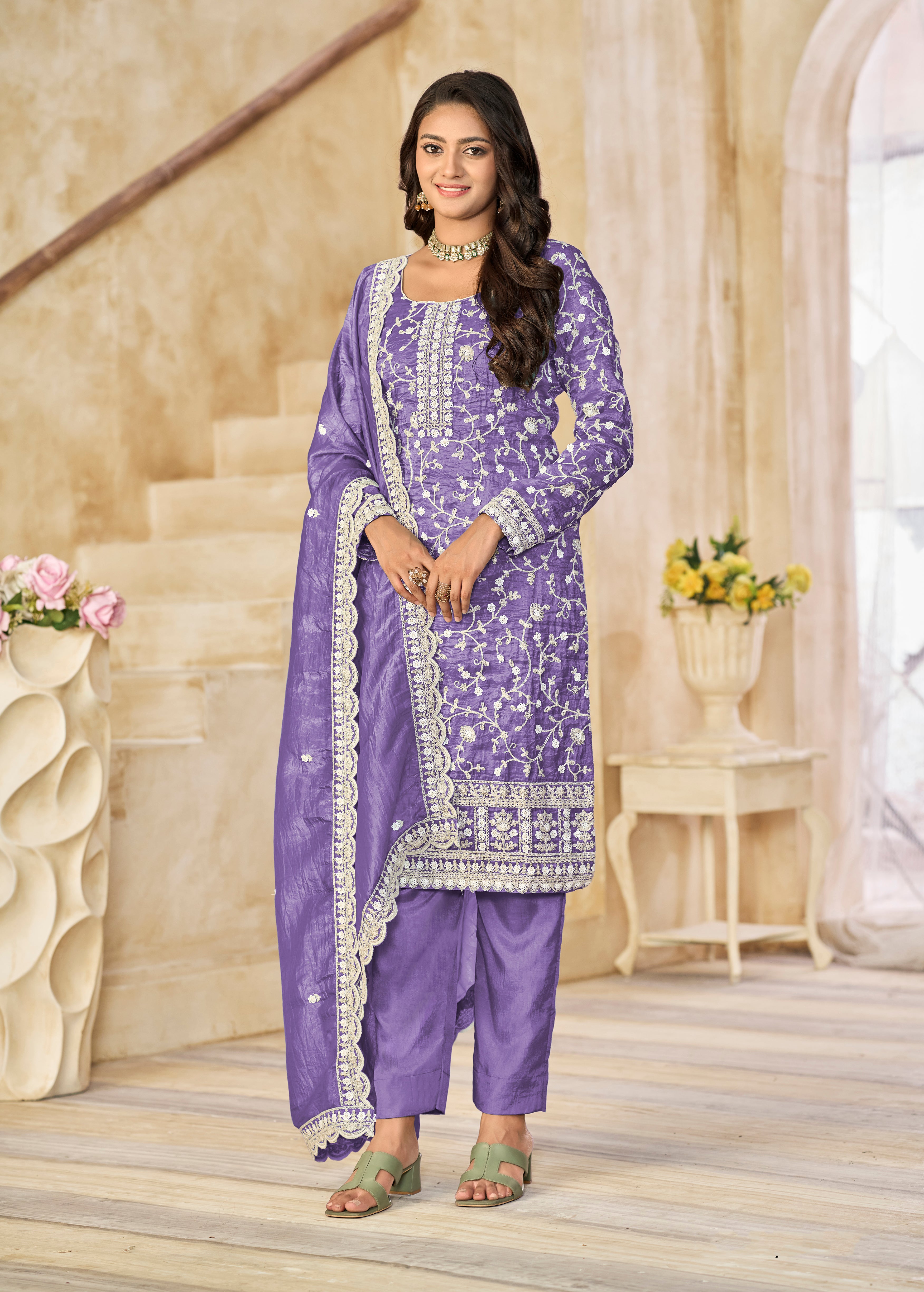 Genuine magnificence will come out through the dressing style and design with this Lavender Purple organza gold crush designer salwar kameez. The embroidered and sequins work looks chic and great for ceremonial, festival and party. Comes with matching bottom and dupatta. (Slight variation in color, fabric & work is possible. Model images are only representative.)