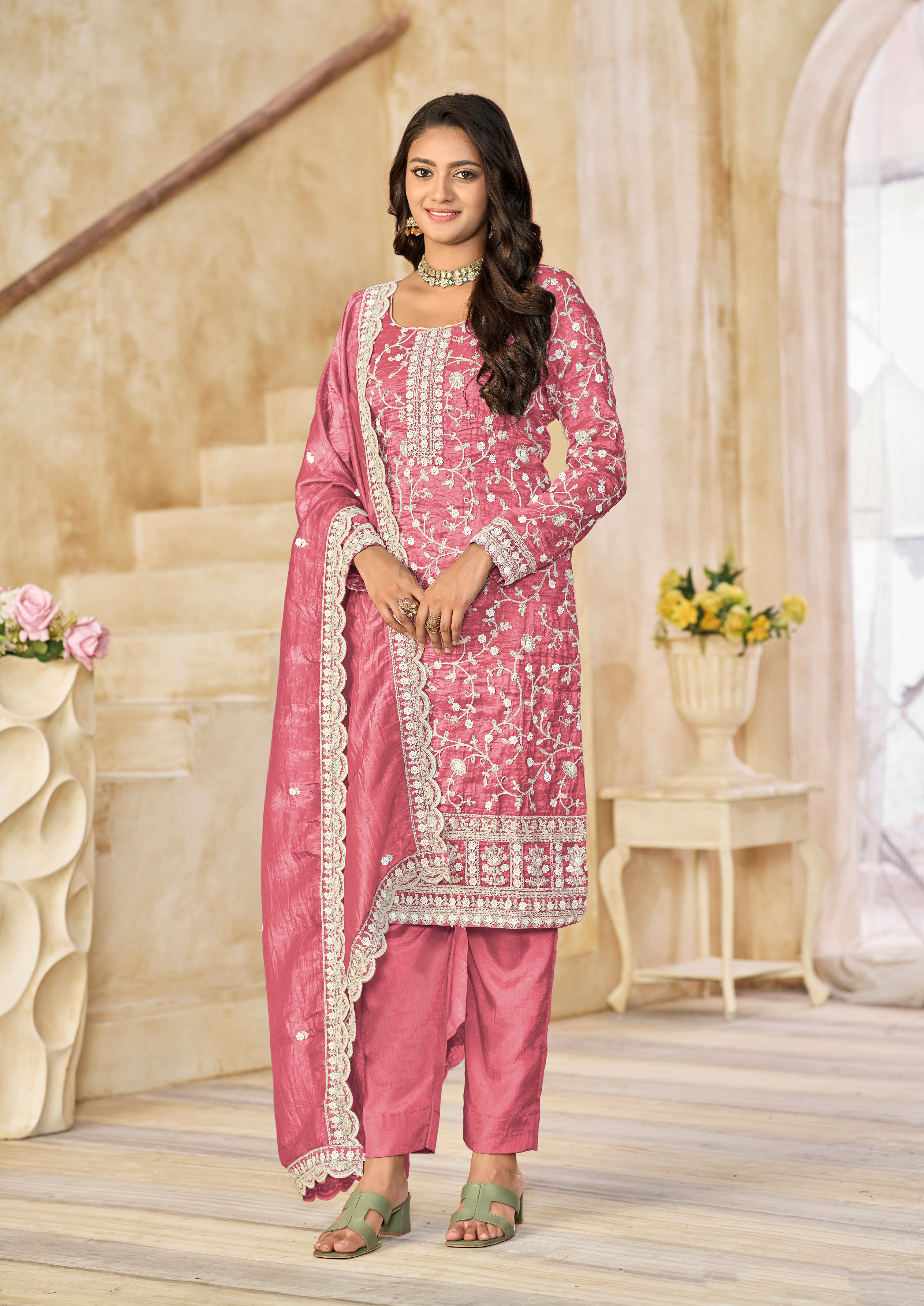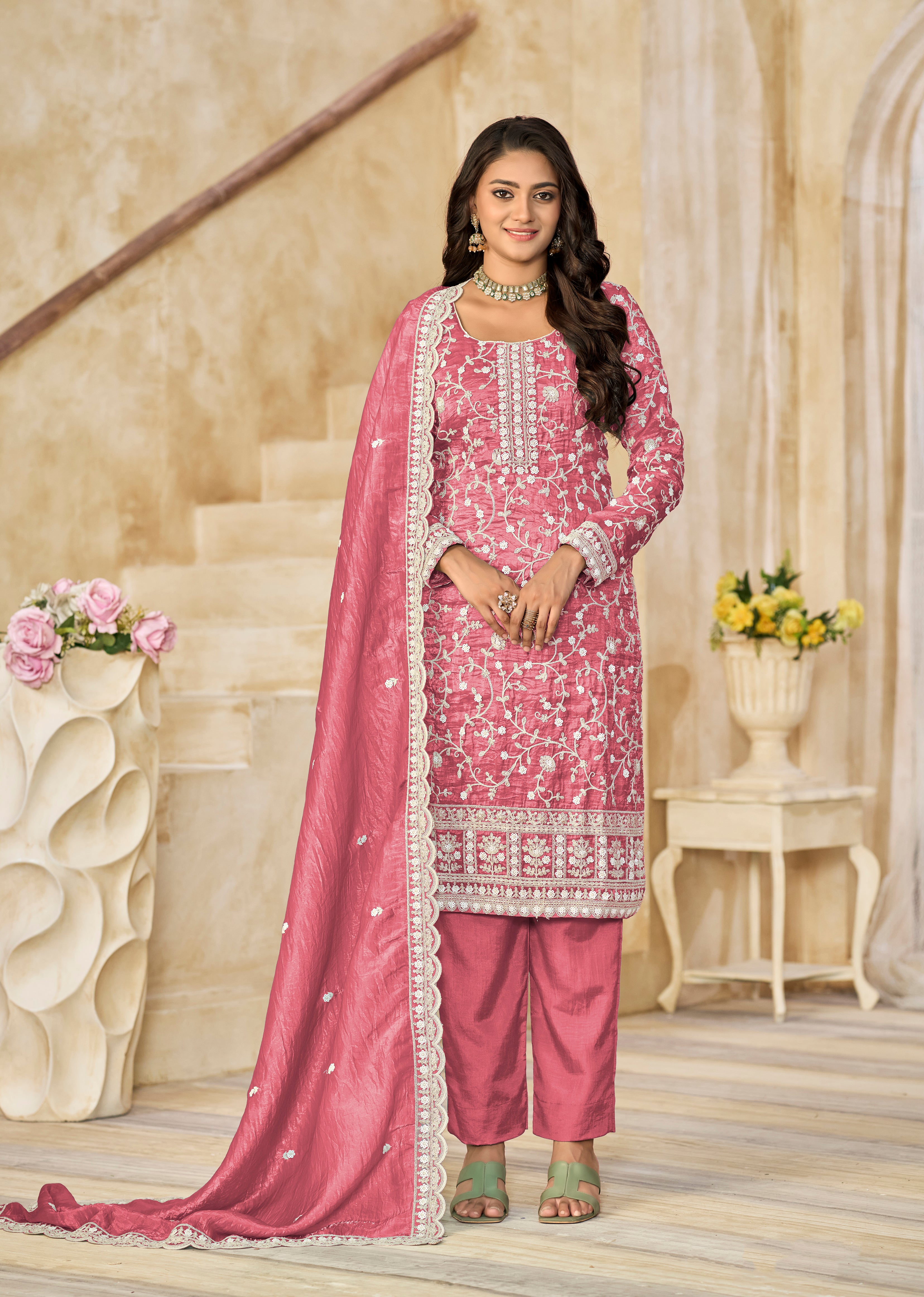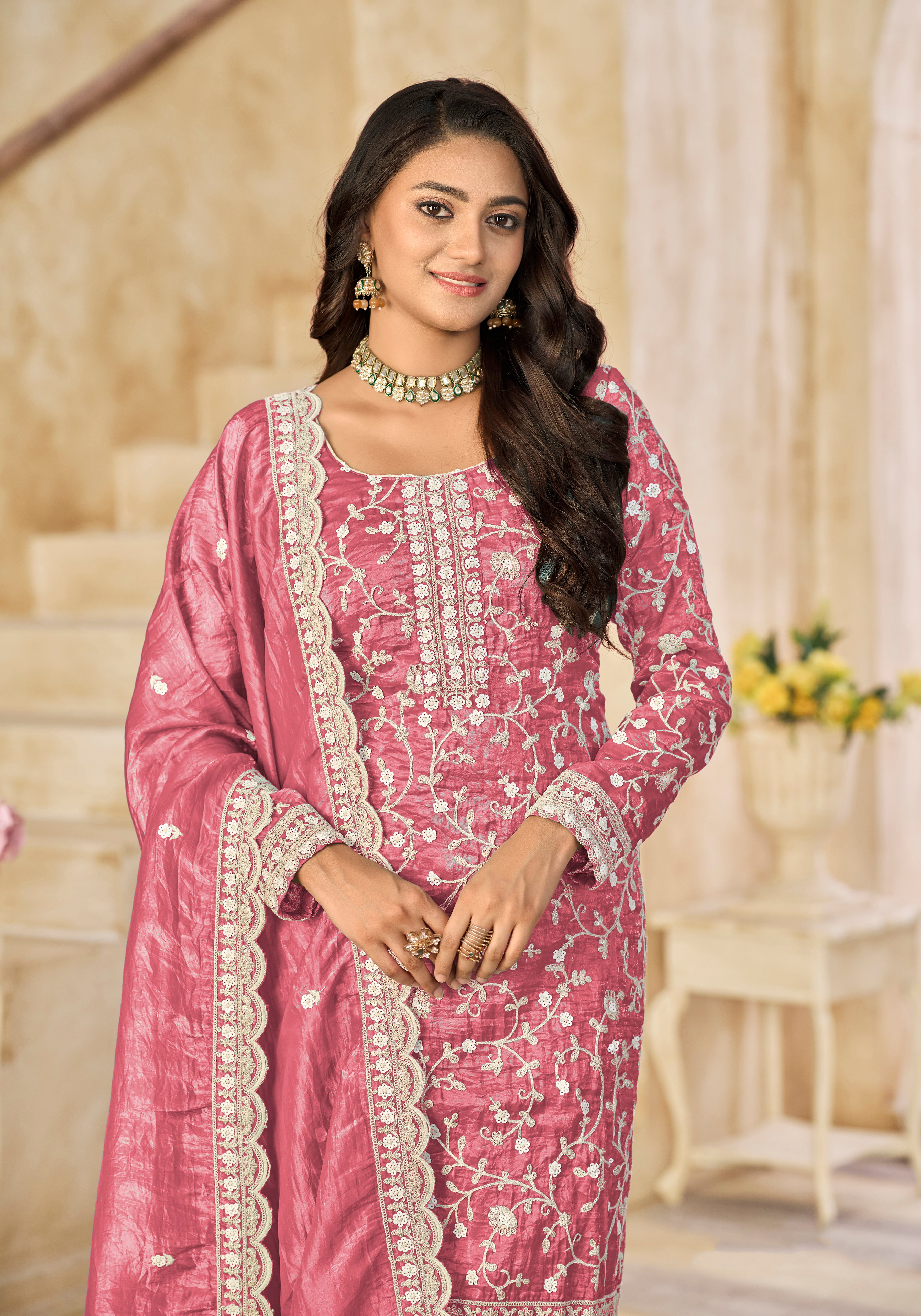 Genuine magnificence will come out through the dressing style and design with this Rose Pink organza gold crush designer salwar kameez. The embroidered and sequins work looks chic and great for ceremonial, festival and party. Comes with matching bottom and dupatta. (Slight variation in color, fabric & work is possible. Model images are only representative.)