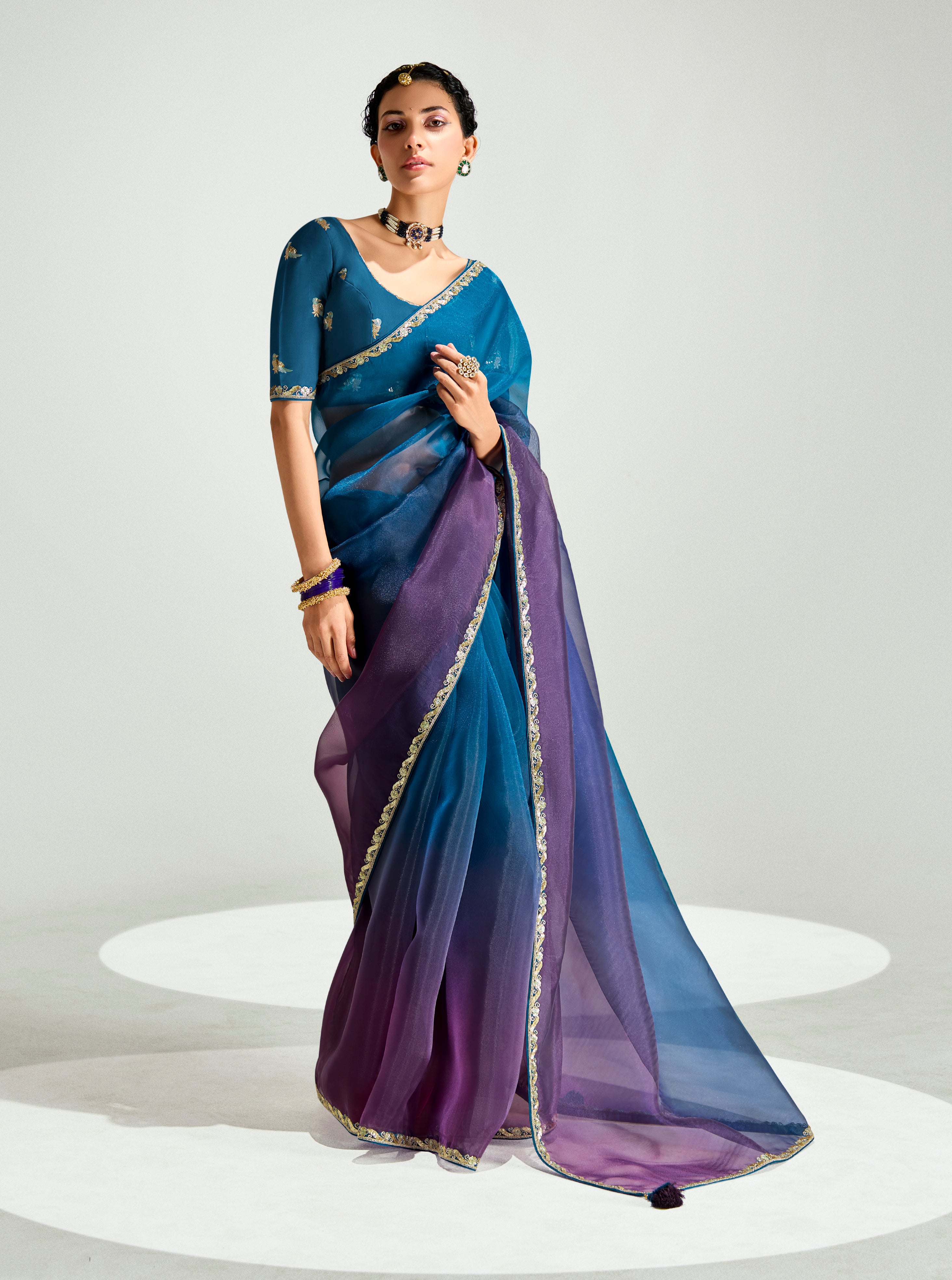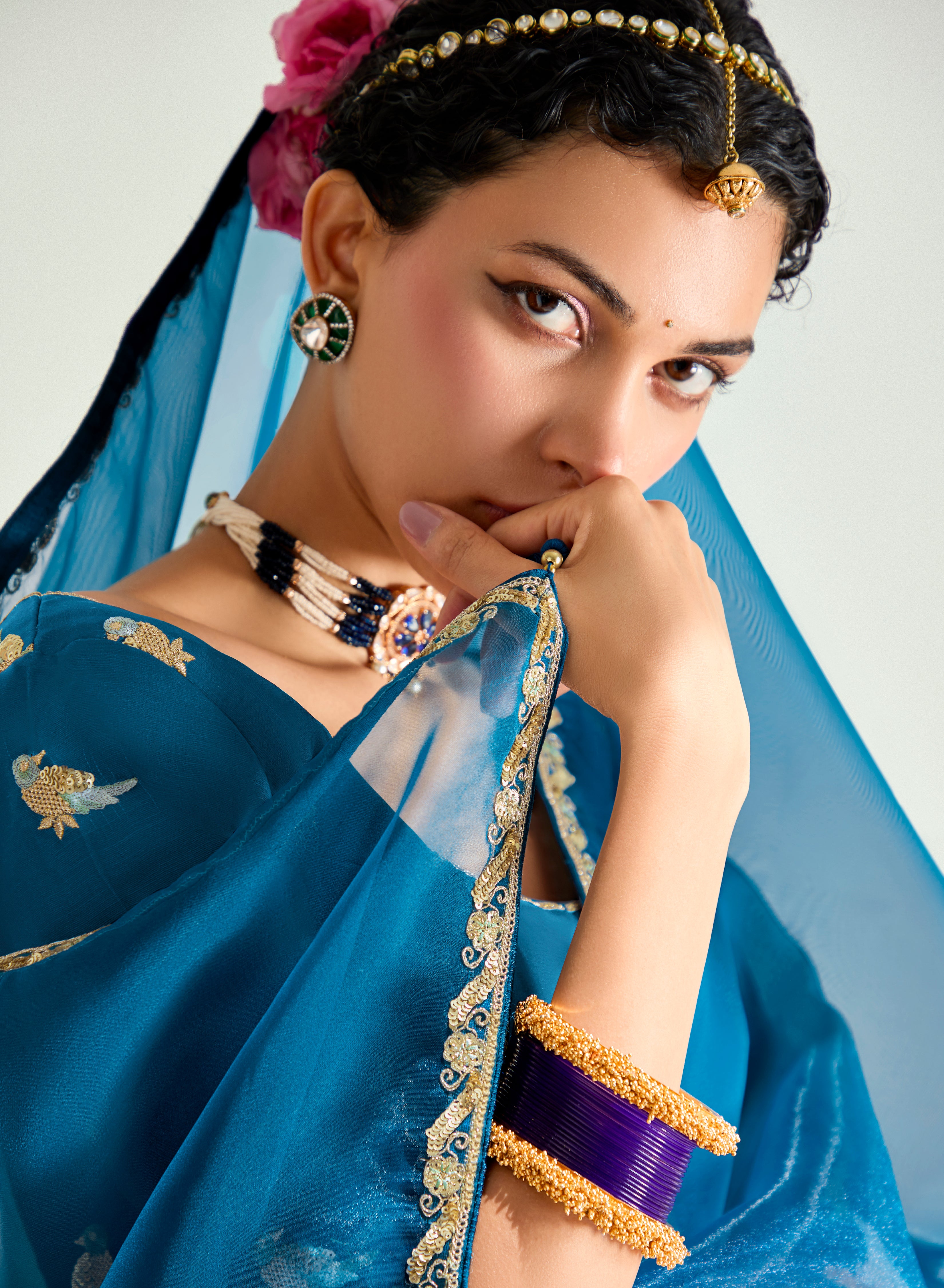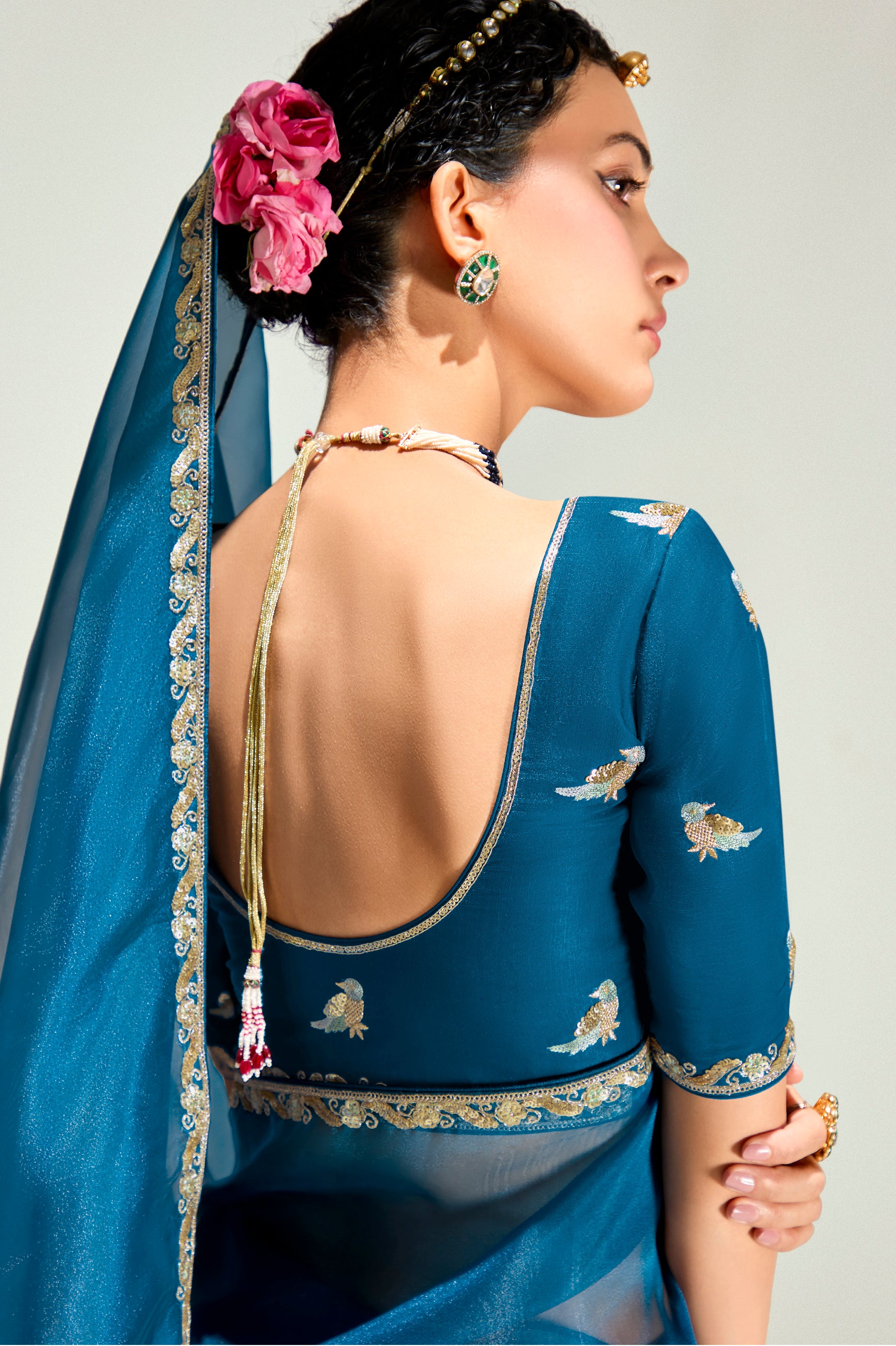 This Teal Shaded Tissue Organza Saree is a delightful mix of soft charm and intricate craft, perfect for your festive and traditional moments. Made from lightweight tissue silk, it dazzles with hand-embroidered resham thread, sparkling sequins, and playful tassels along the border and pallu. The matching satin silk blouse is a showstopper too, featuring handwork embroidery with beads and sequins on the neckline, sleeves, and back.