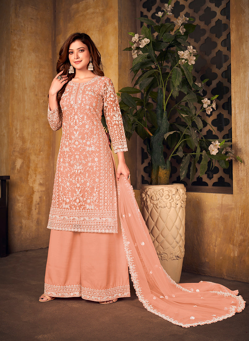 We unfurl our the intricacy and exclusivity of our creations highlighted in this enticing Peach Color Net Palazzo designer suit. The zari work seems chic and excellent for ceremonial. Comes with matching santoon bottom and Net dupatta.