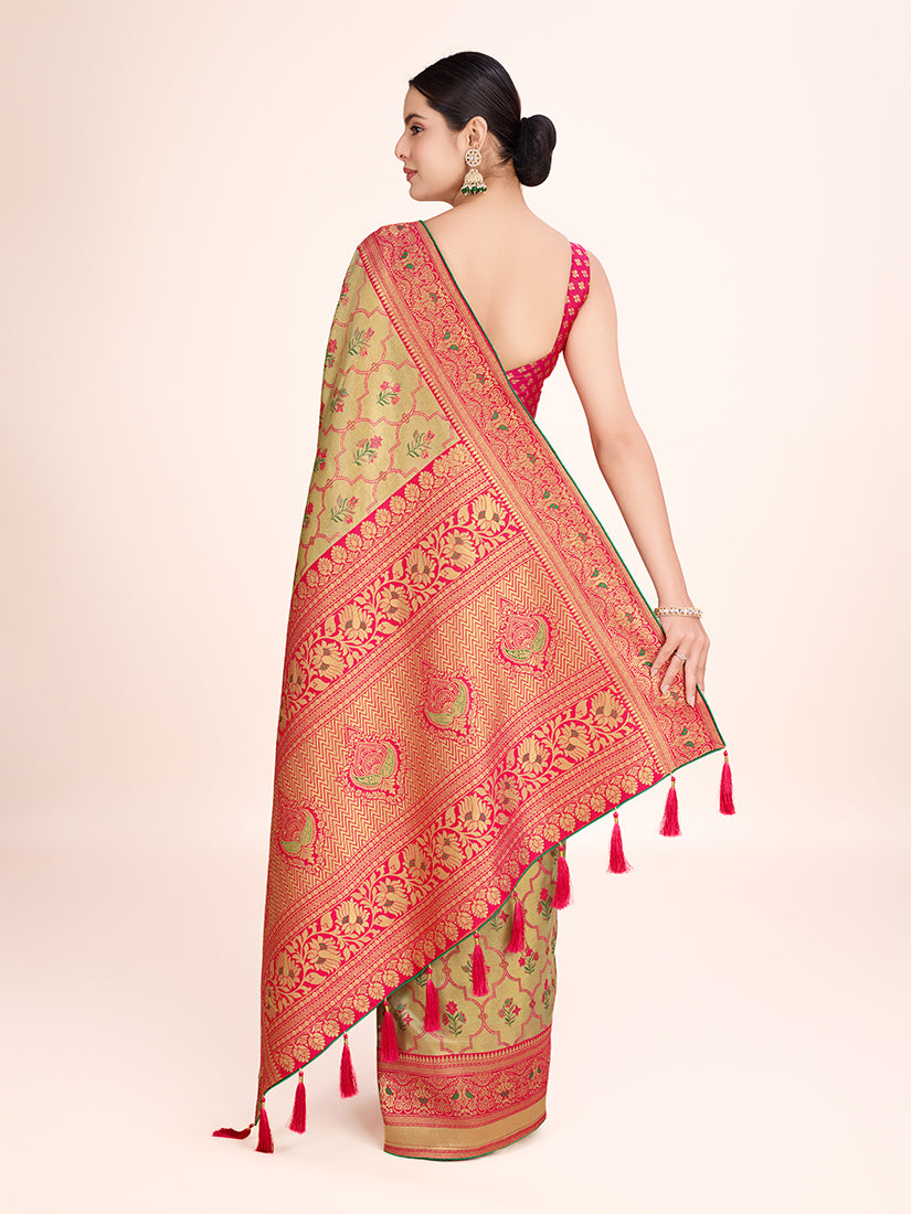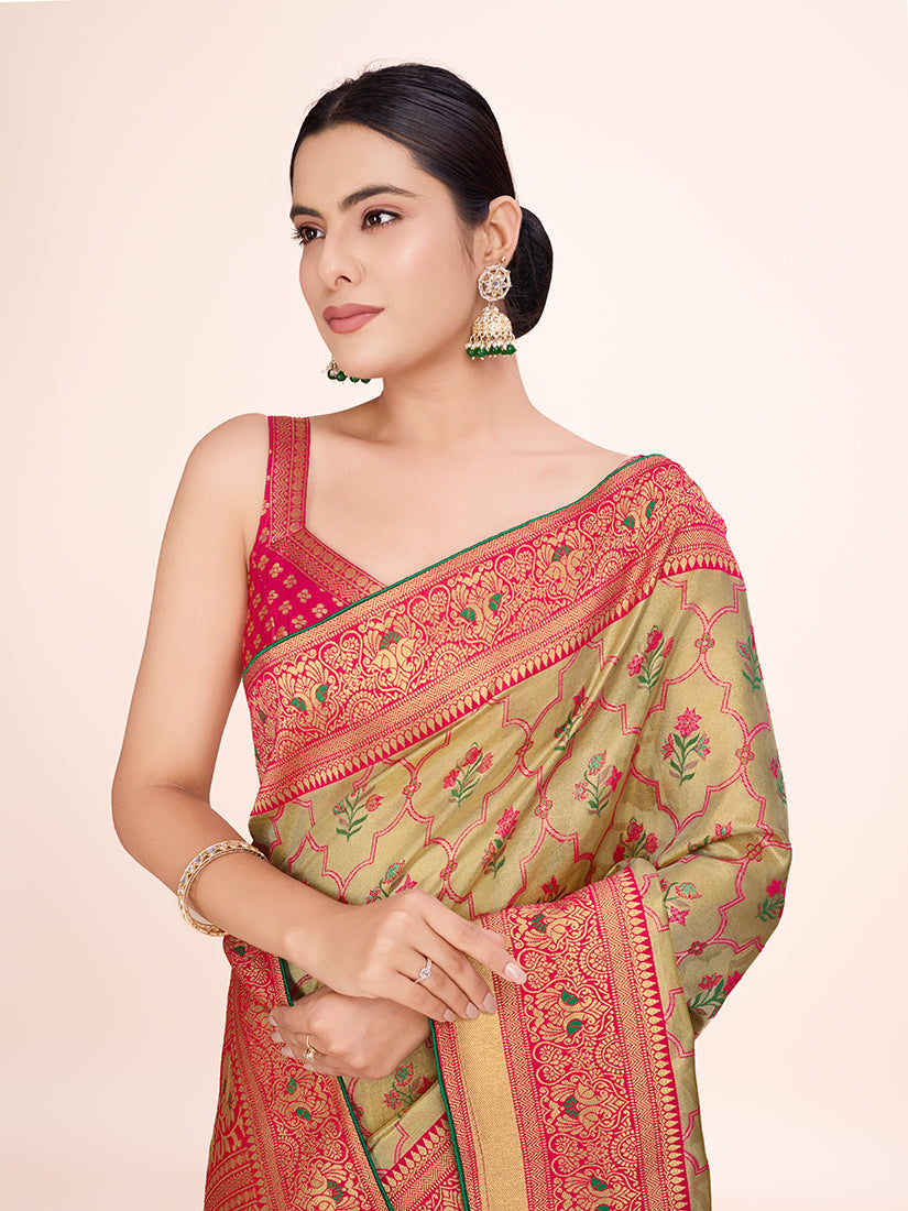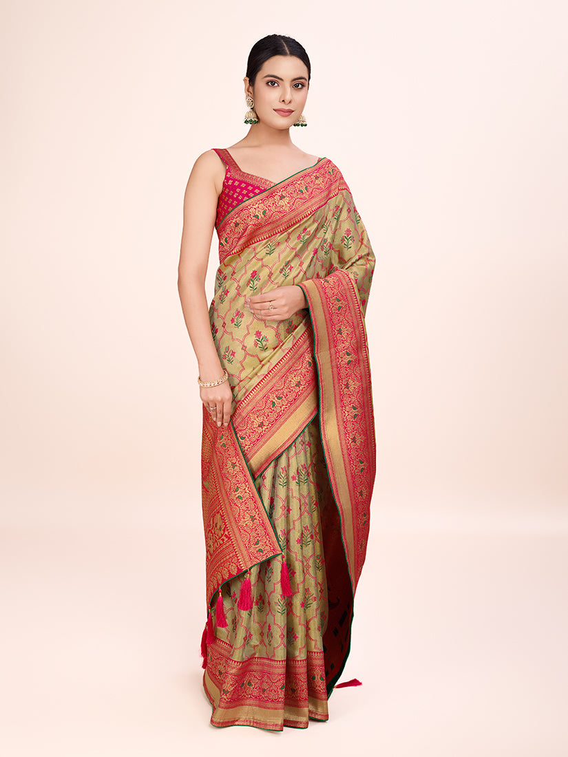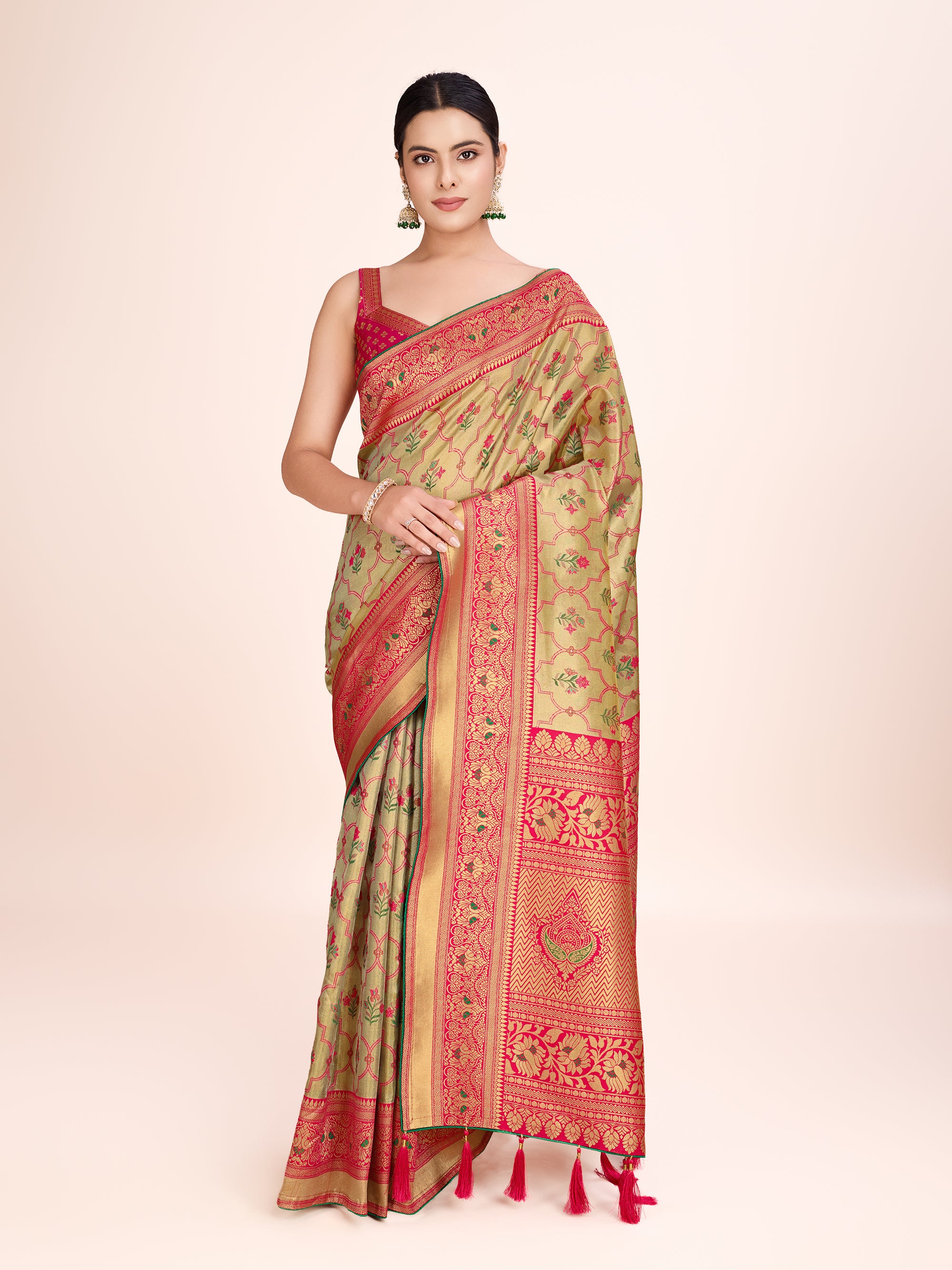 Monjolika Fashion Presents Drape Yourself In This Beautiful Pink Banarasi Tissue Silk Saree With Zari Woven Work. This Saree Is Woven By Master Weavers Of Banaras. Be It Your Sangeet Ceremony Or Haldi Or Any Auspicious Occasion, This Saree Will Be The Best Companion, With The Rich Style And Color Coordination This Saree Is A Must In Wardrobe! Style It With A Potli Bag And High Heels For A Flawless Look. Comes With Unstiched Blouse.