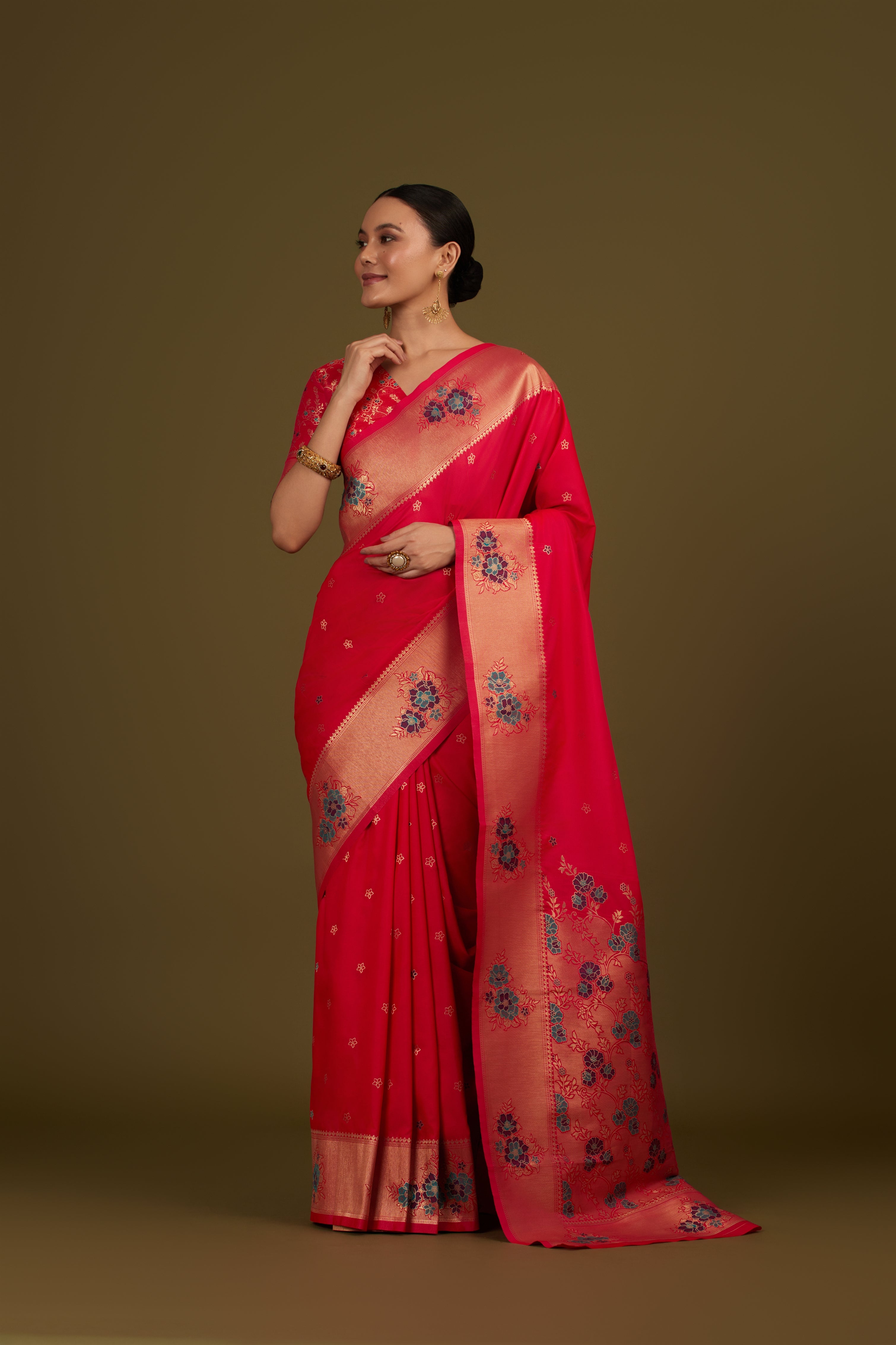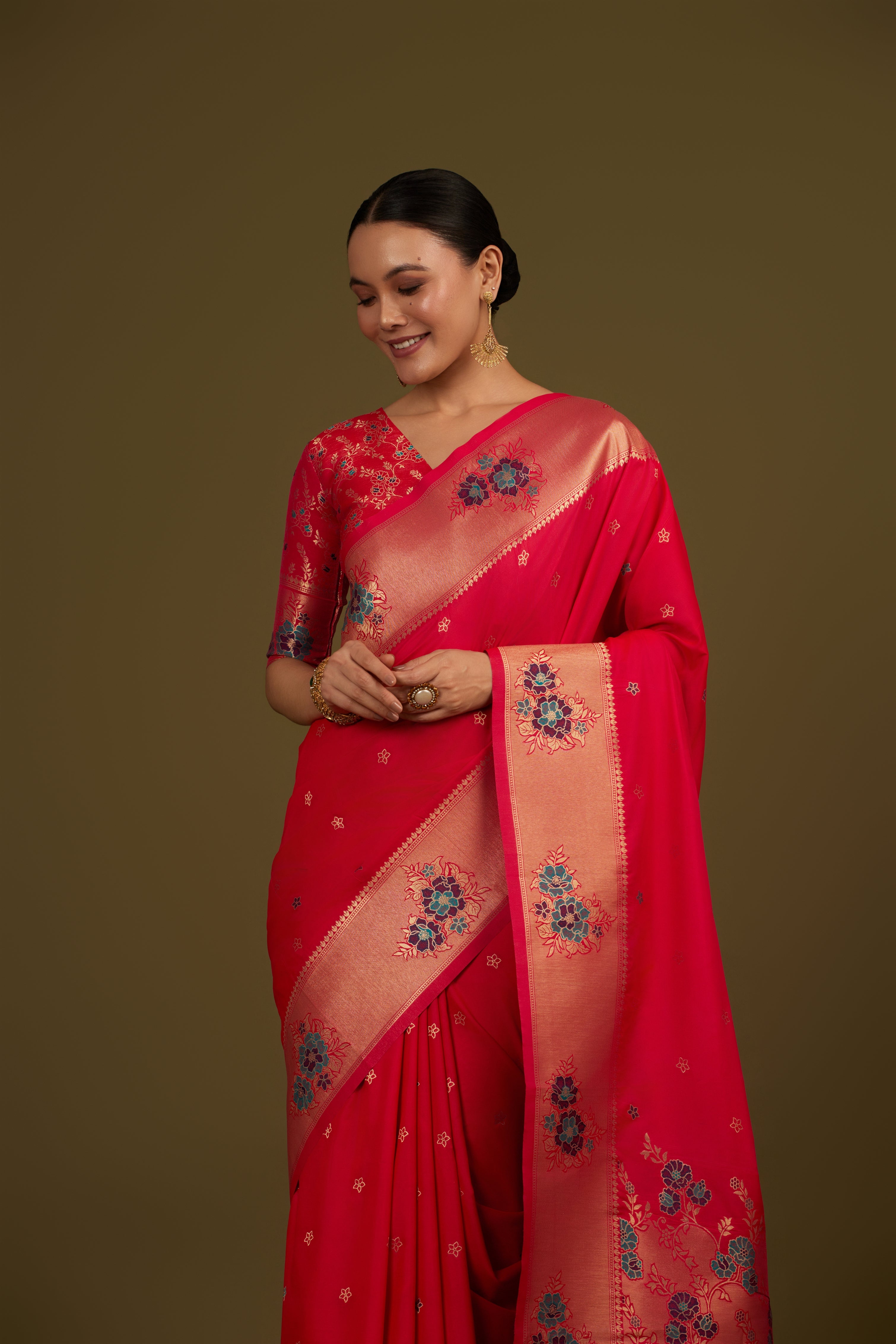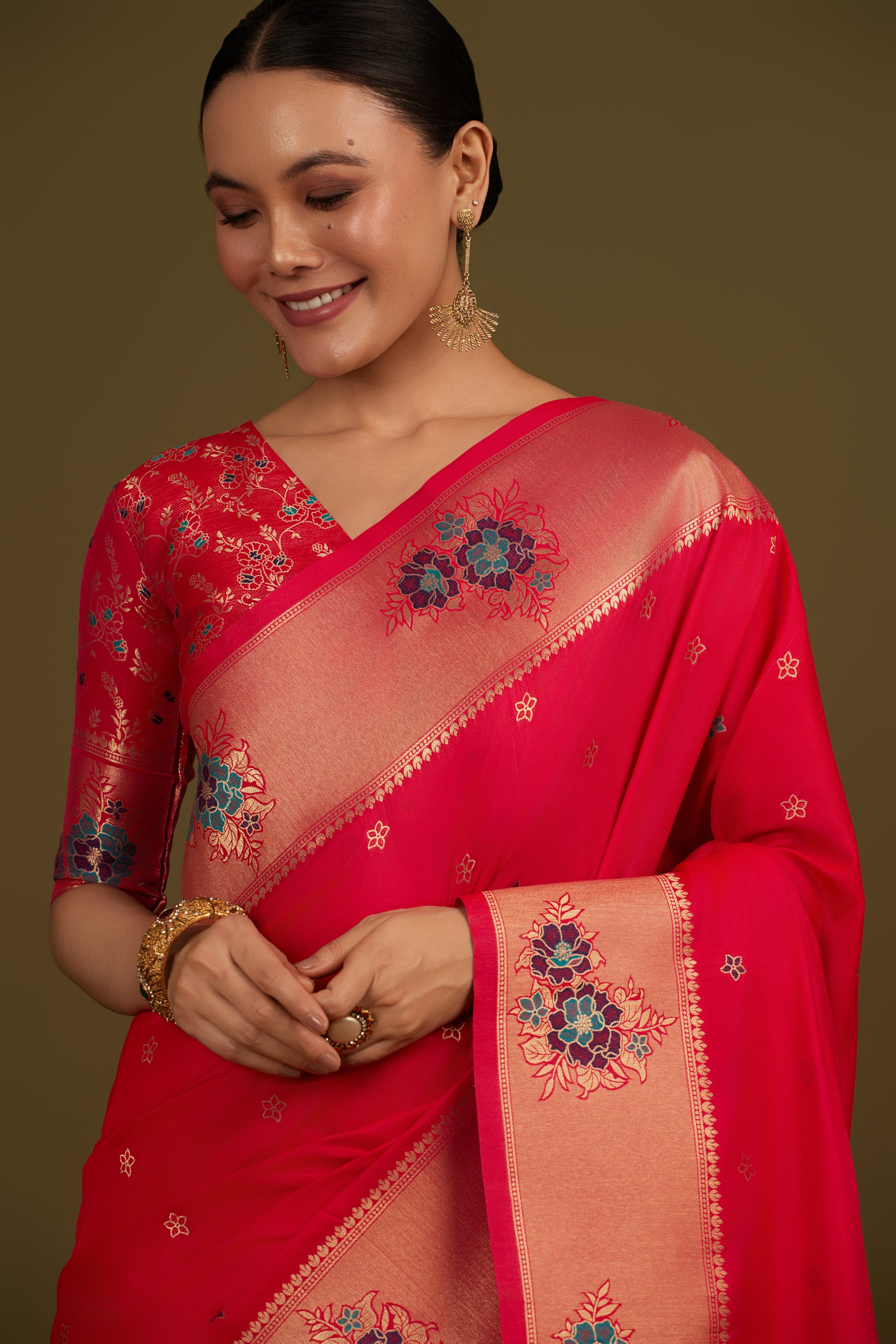 This Pink Classic Woven Silk Blend Saree, Featuring An Intricate Floral Pattern Created With Shimmering Zari Work. The Zari Enhances The Texture And Vibrancy Of The Floral Motifs, The Pallu And Zari Borders Add Richness To The Overall Look.