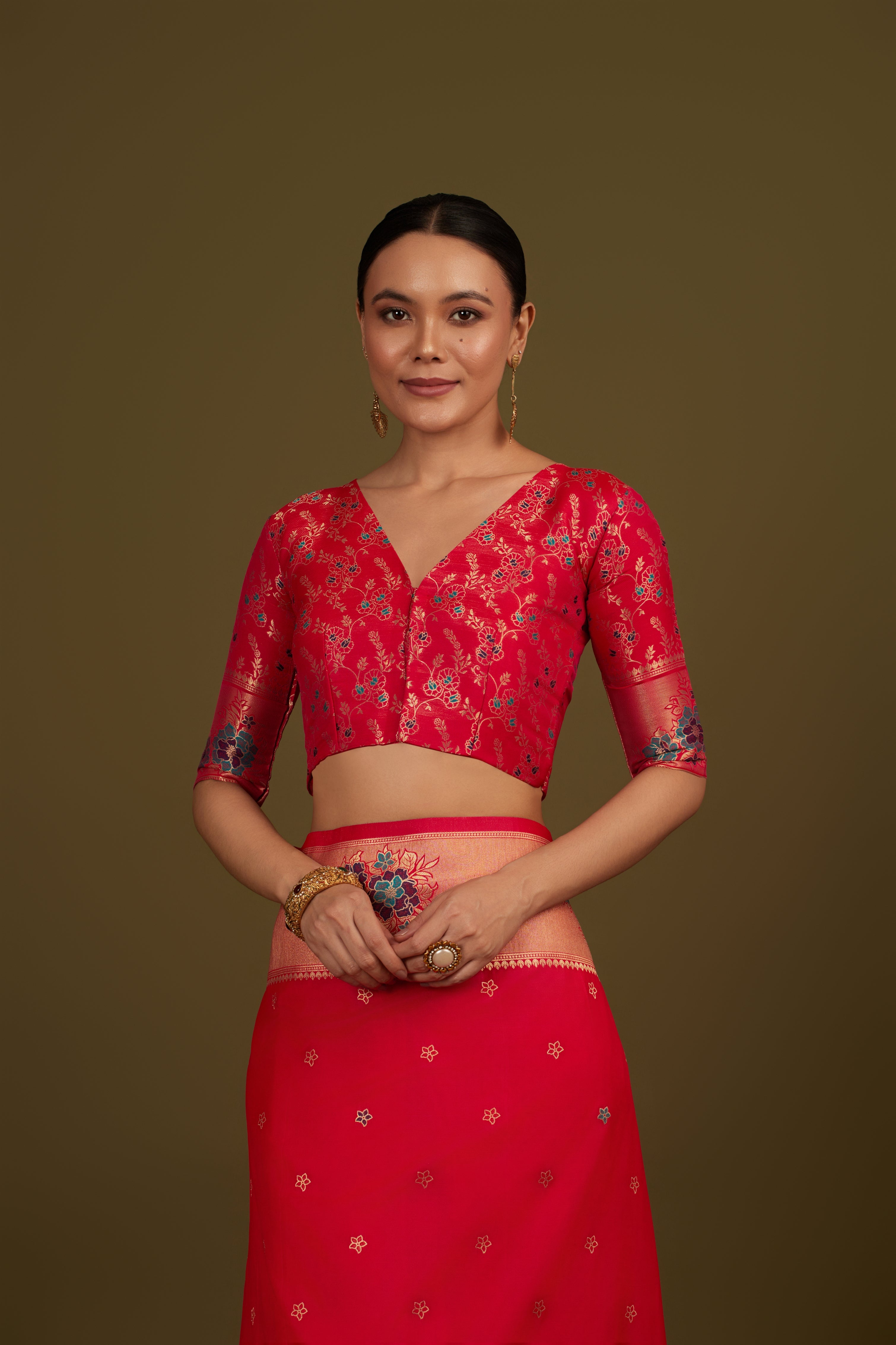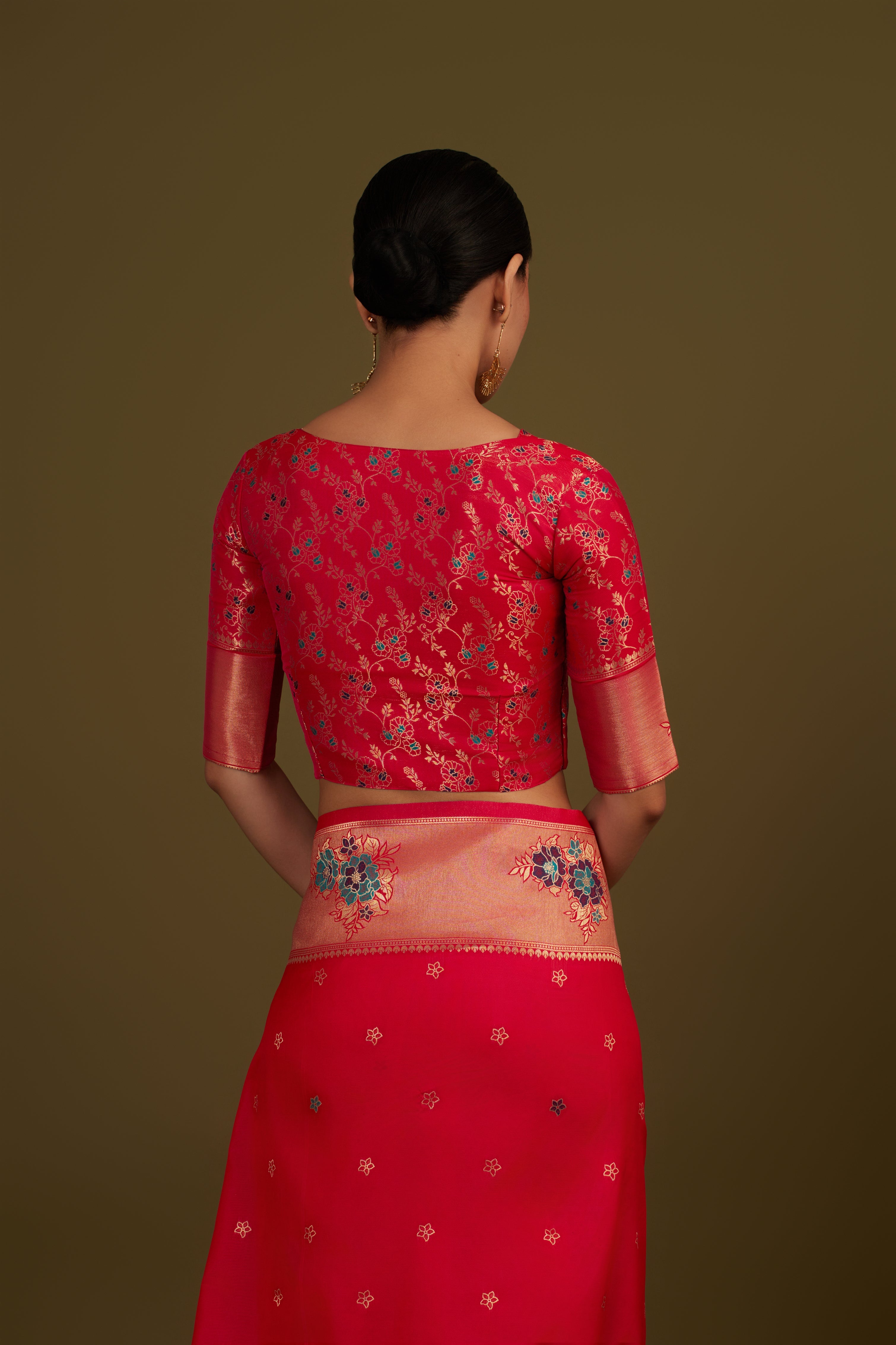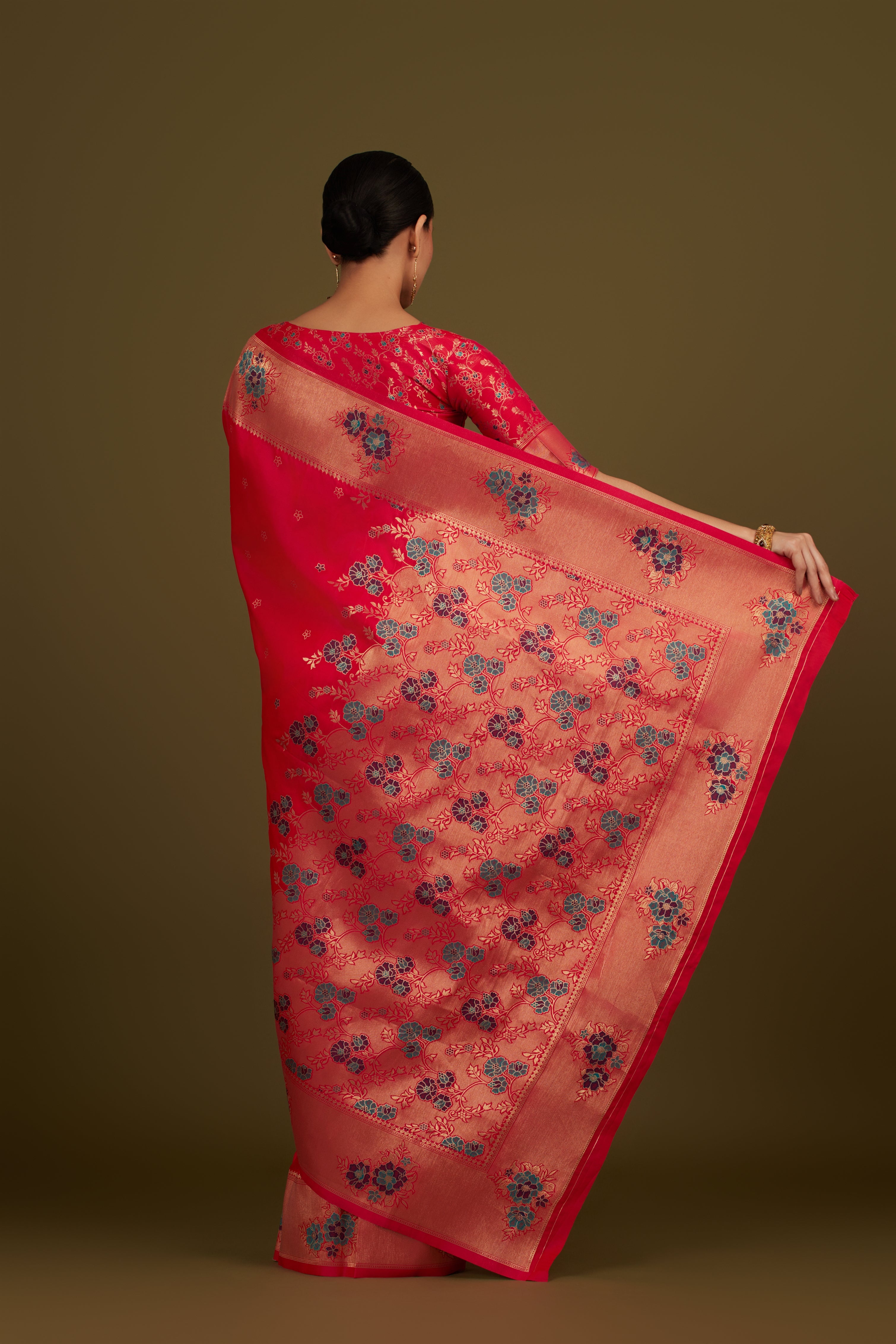This Pink Classic Woven Silk Blend Saree, Featuring An Intricate Floral Pattern Created With Shimmering Zari Work. The Zari Enhances The Texture And Vibrancy Of The Floral Motifs, The Pallu And Zari Borders Add Richness To The Overall Look.