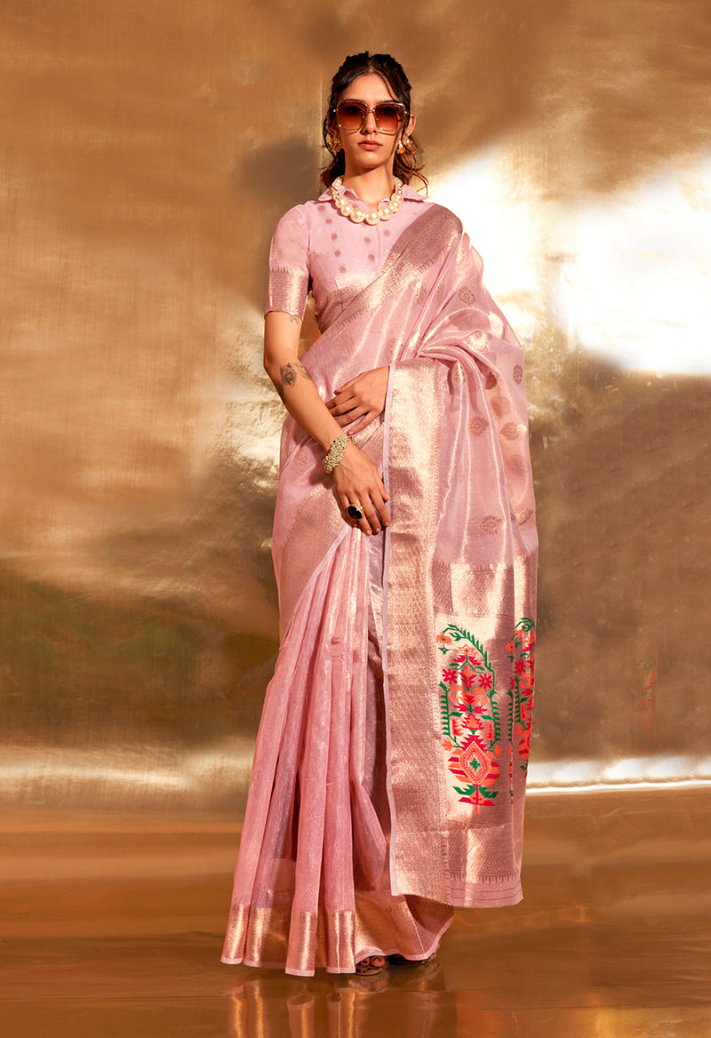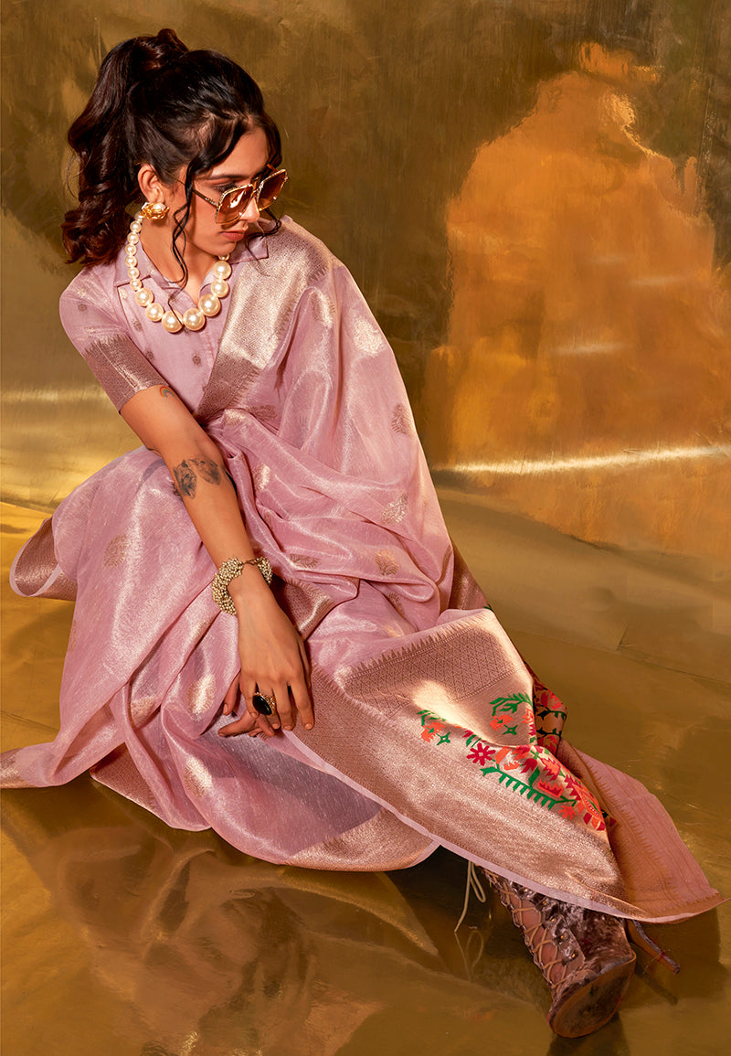 Experience the grandeur of Maharashtra's weaving legacy with this Tissue Silk Zari Woven Paithani Style Saree. Crafted from lightweight glossy tissue silk, this saree features a mesmerizing Paithani pallu & zari-woven motifs all over the saree. It's an ideal choice for weddings, receptions, and festive.