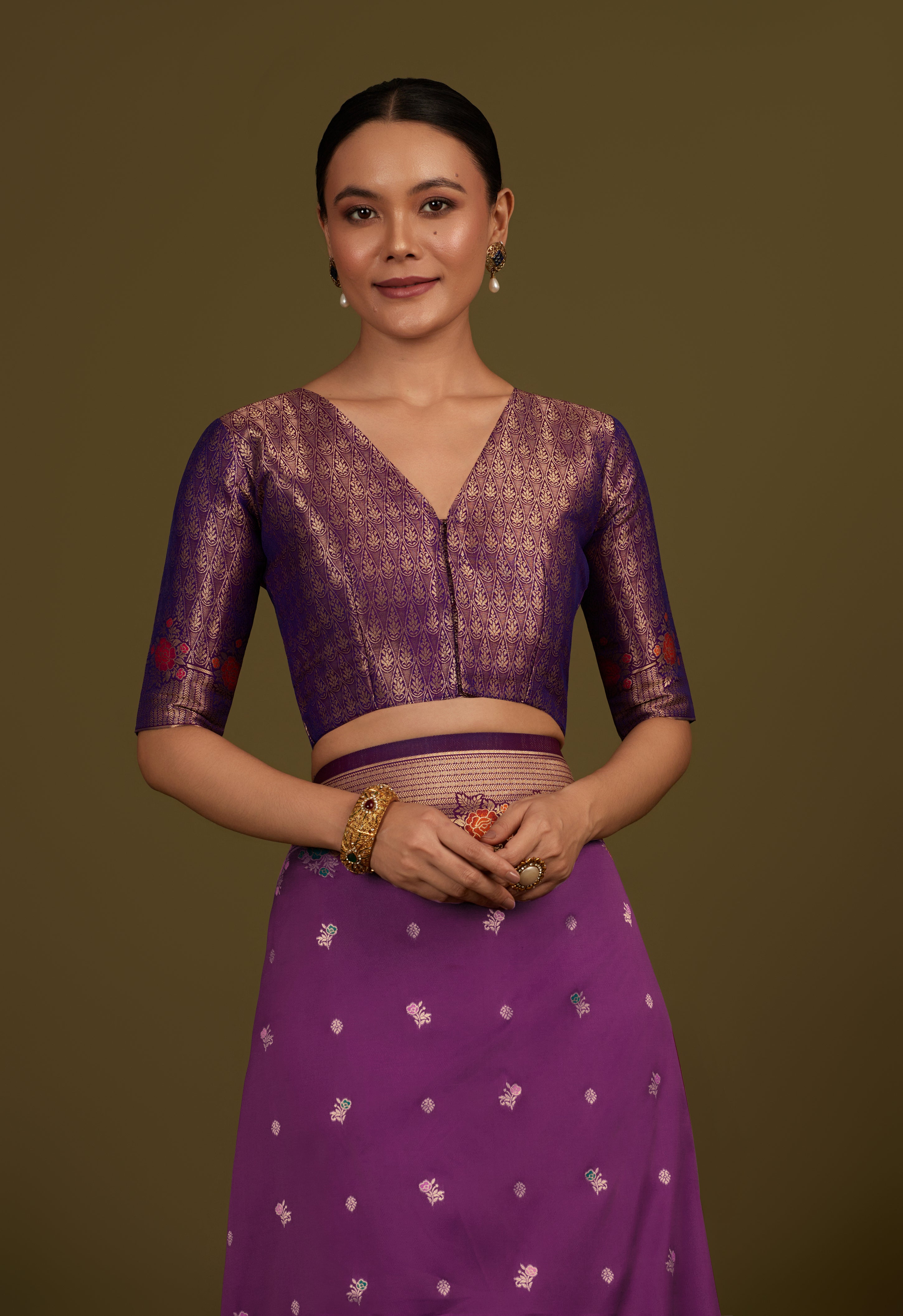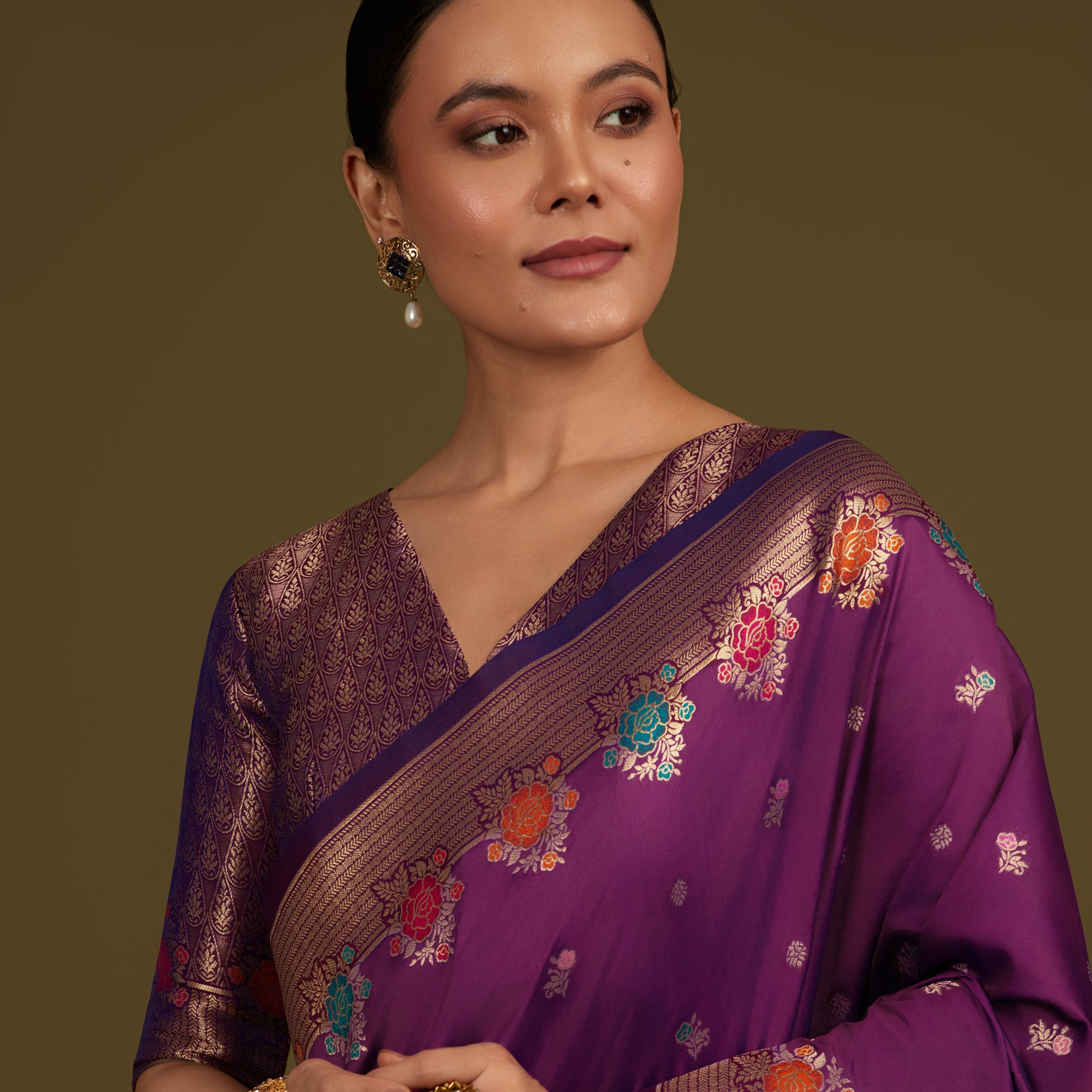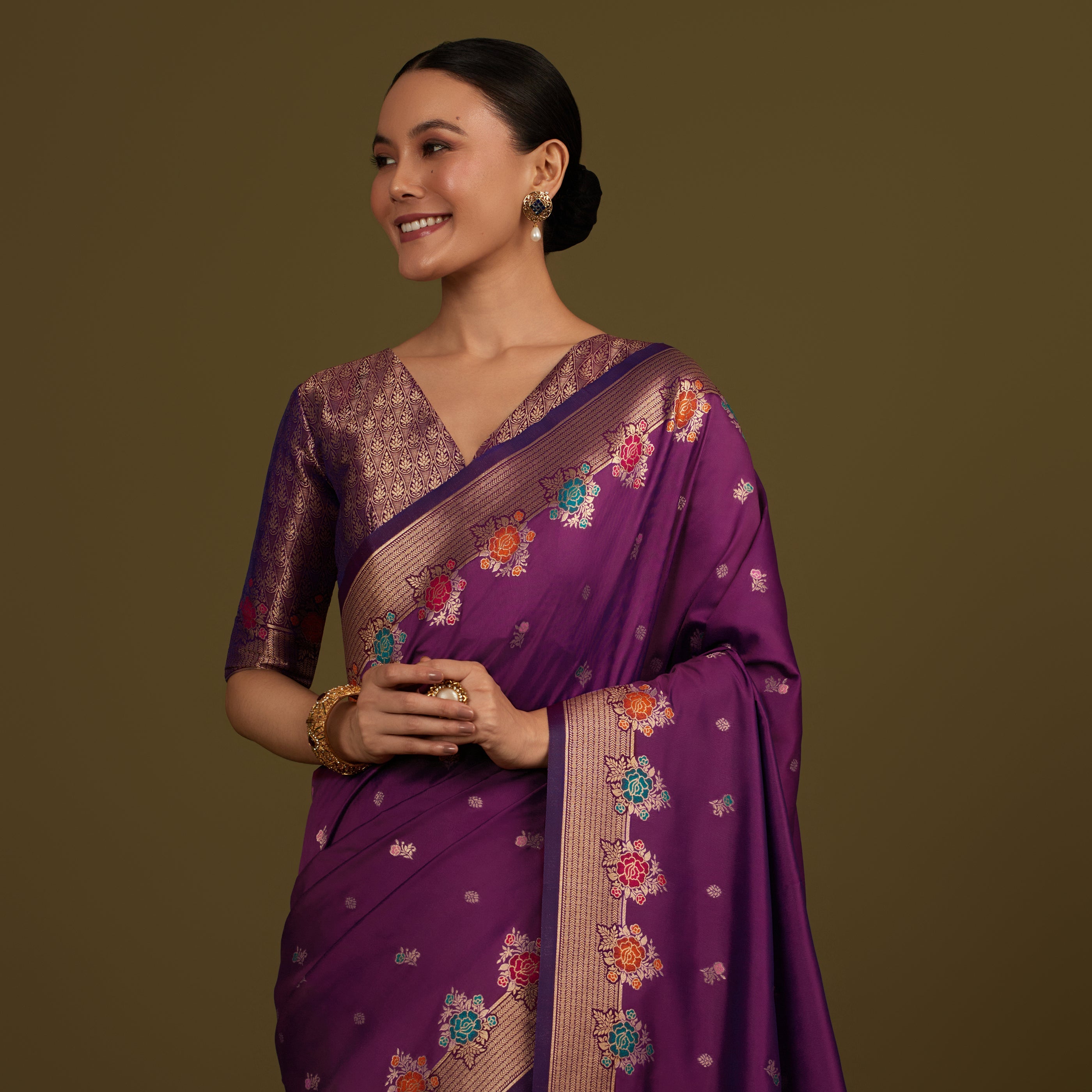 Be an angel and create and ascertain a smashing effect on anybody by carrying this Purple Color silk contemporary saree. The fancy, weaving and zari work seems chic and fantastic for any occasion. Comes with matching blouse. (Slight variation in color, fabric & work is possible. Model images are only representative.)