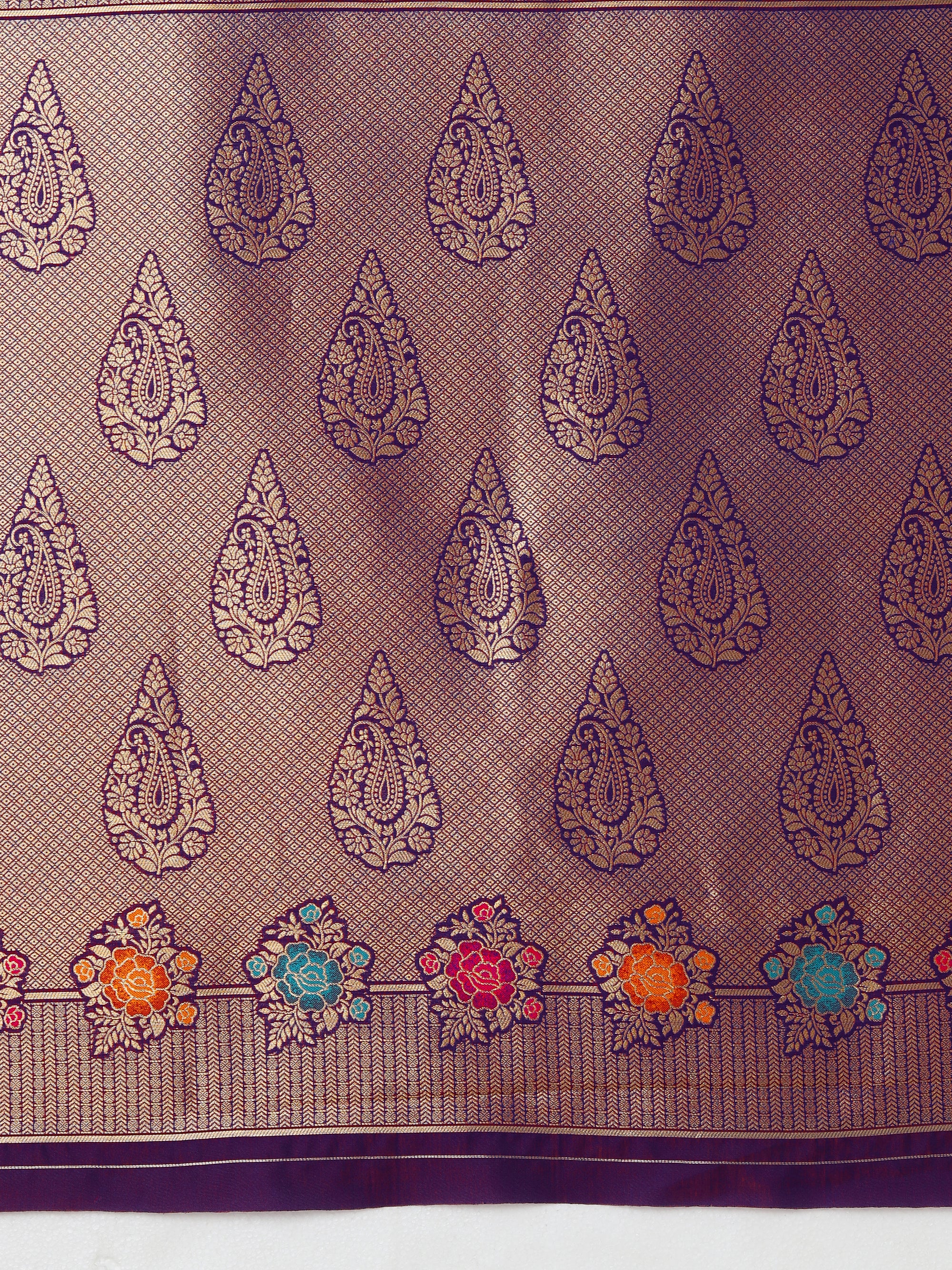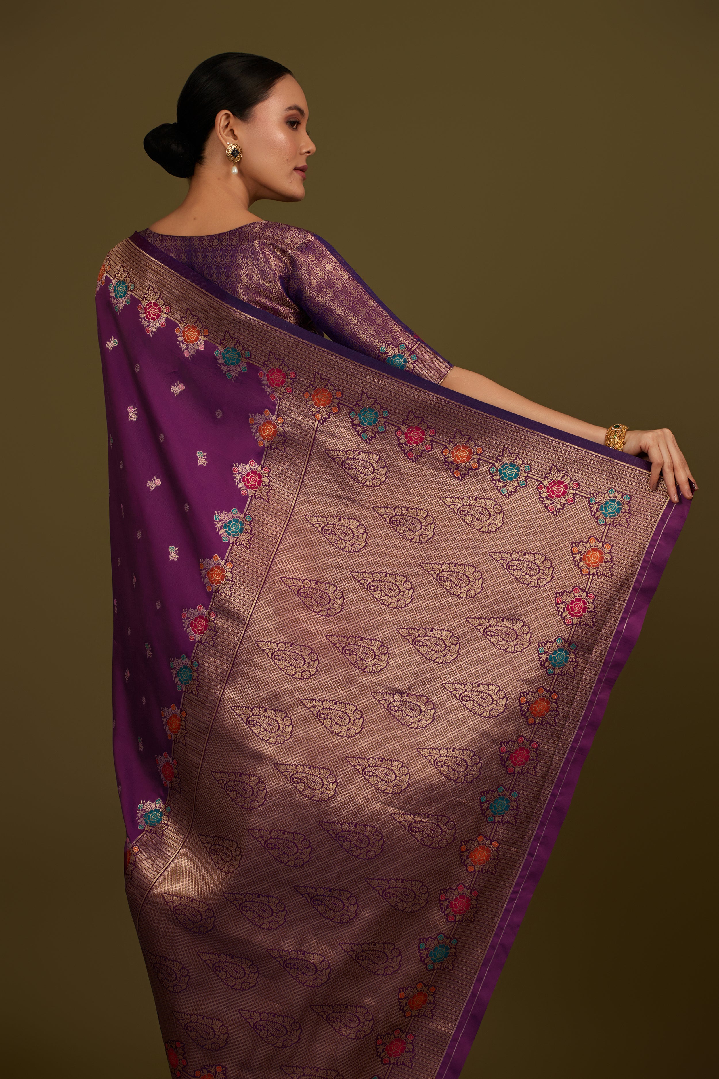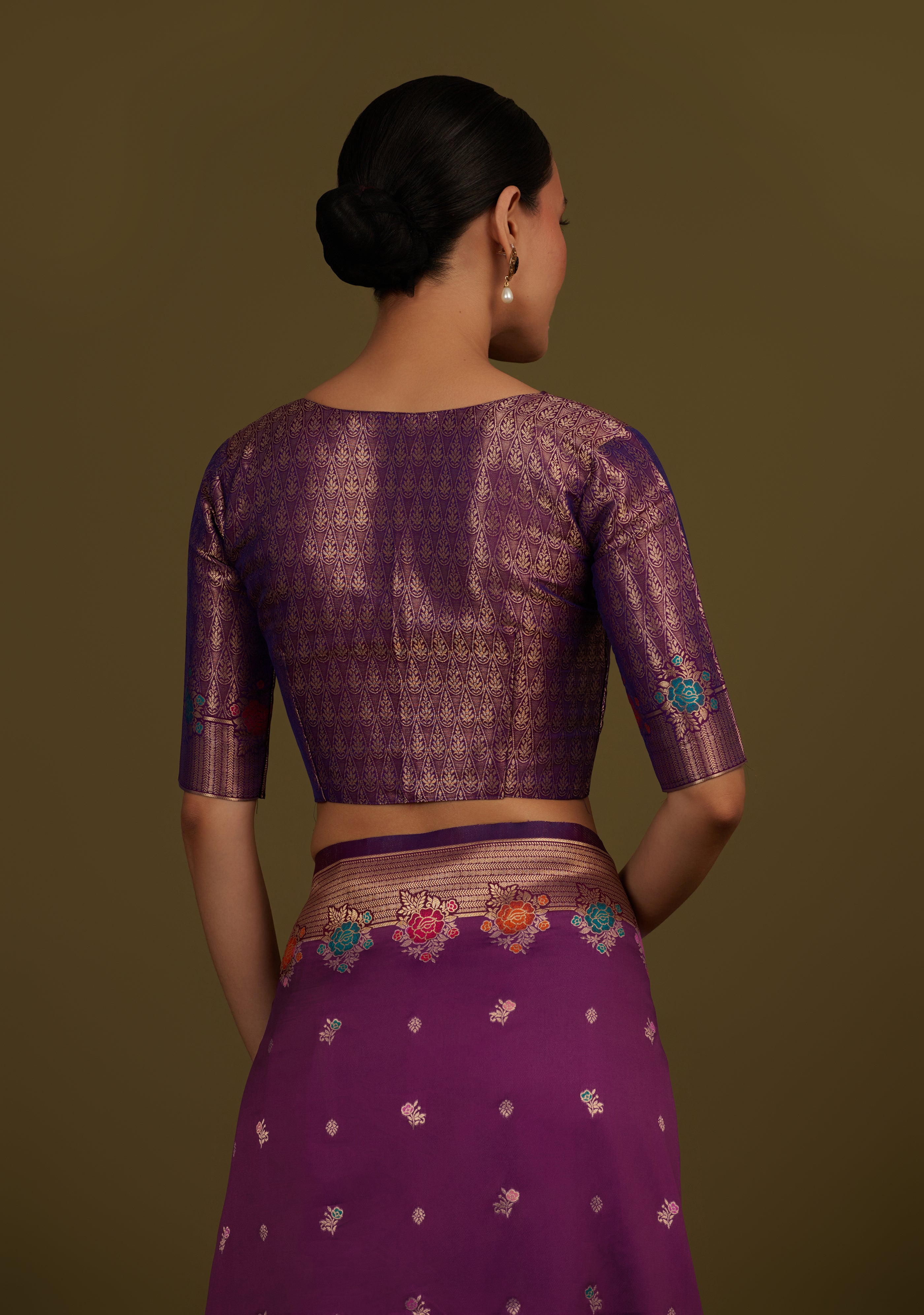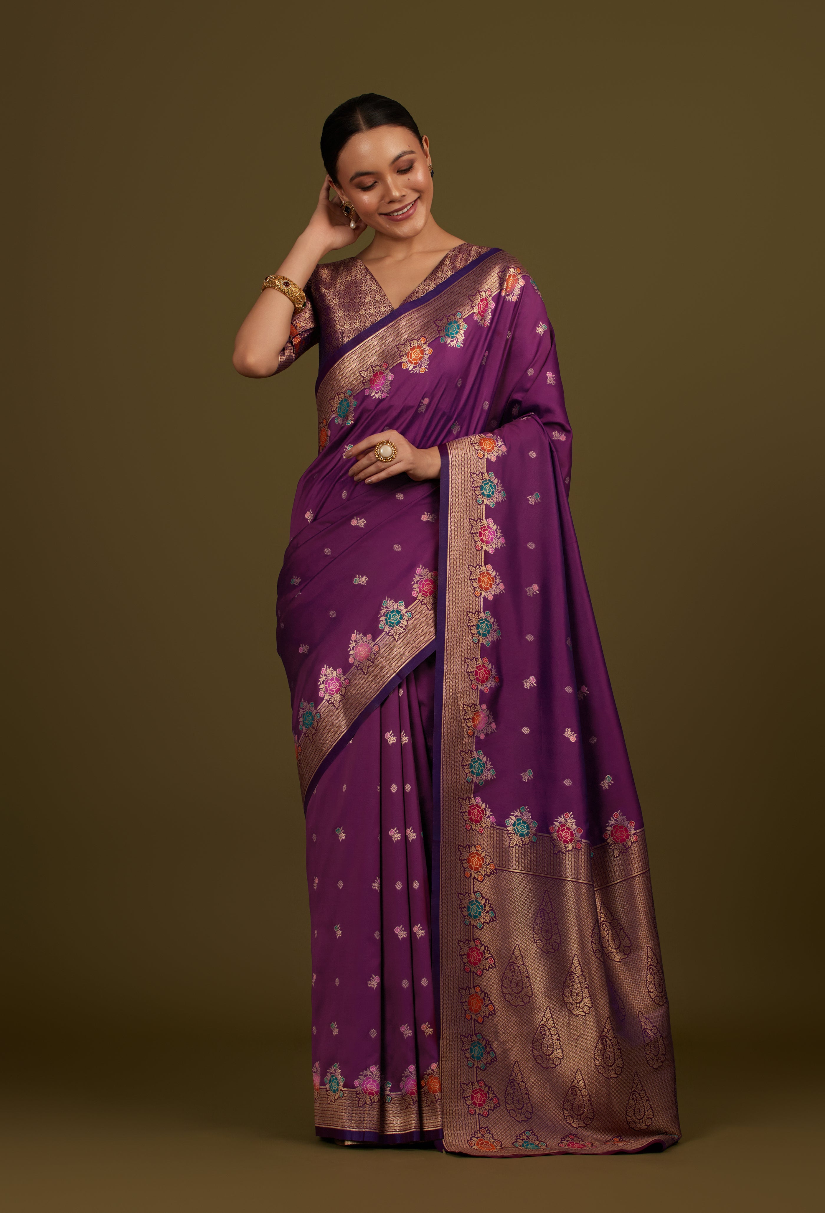 Be an angel and create and ascertain a smashing effect on anybody by carrying this Purple Color silk contemporary saree. The fancy, weaving and zari work seems chic and fantastic for any occasion. Comes with matching blouse. (Slight variation in color, fabric & work is possible. Model images are only representative.)