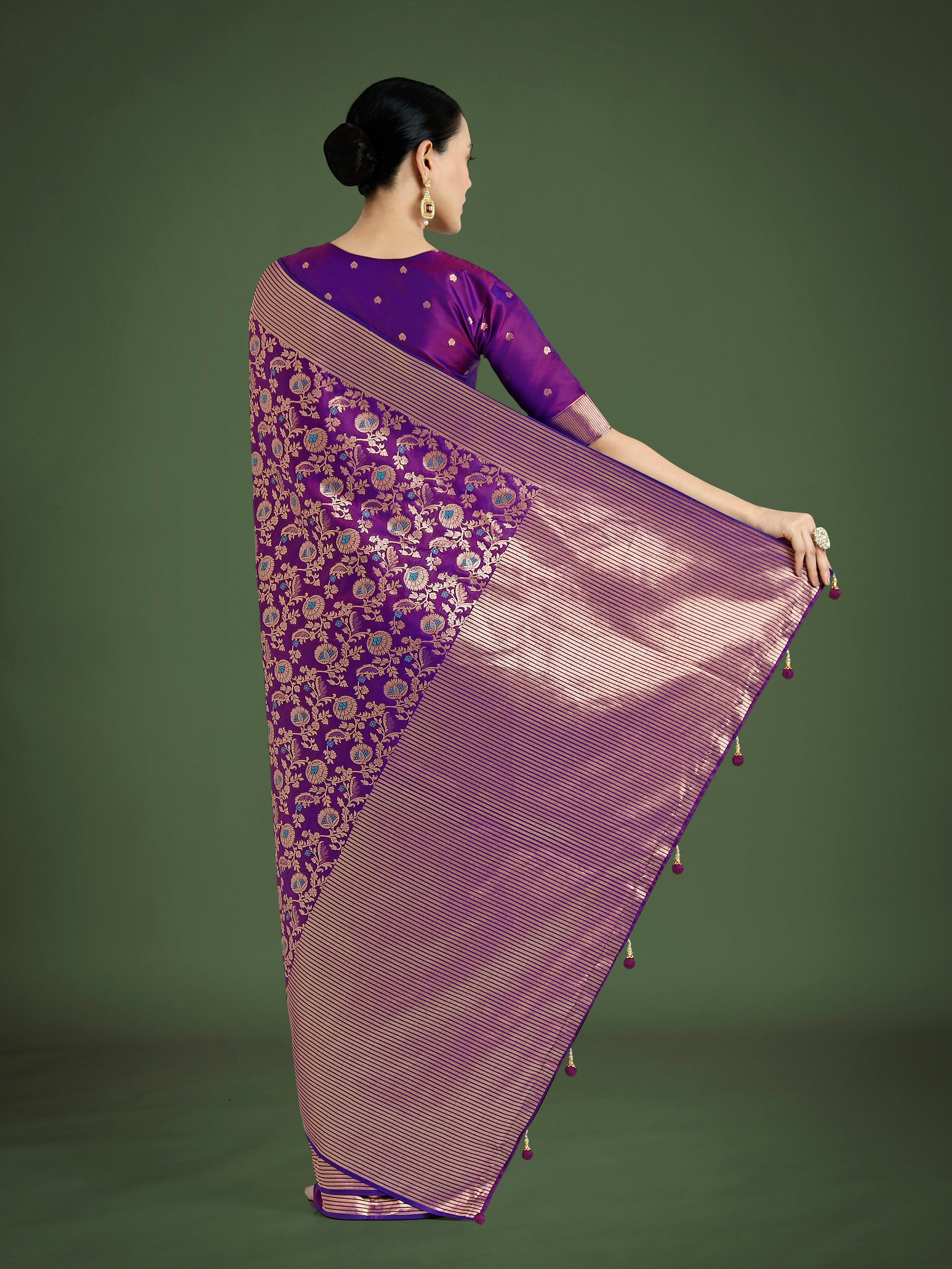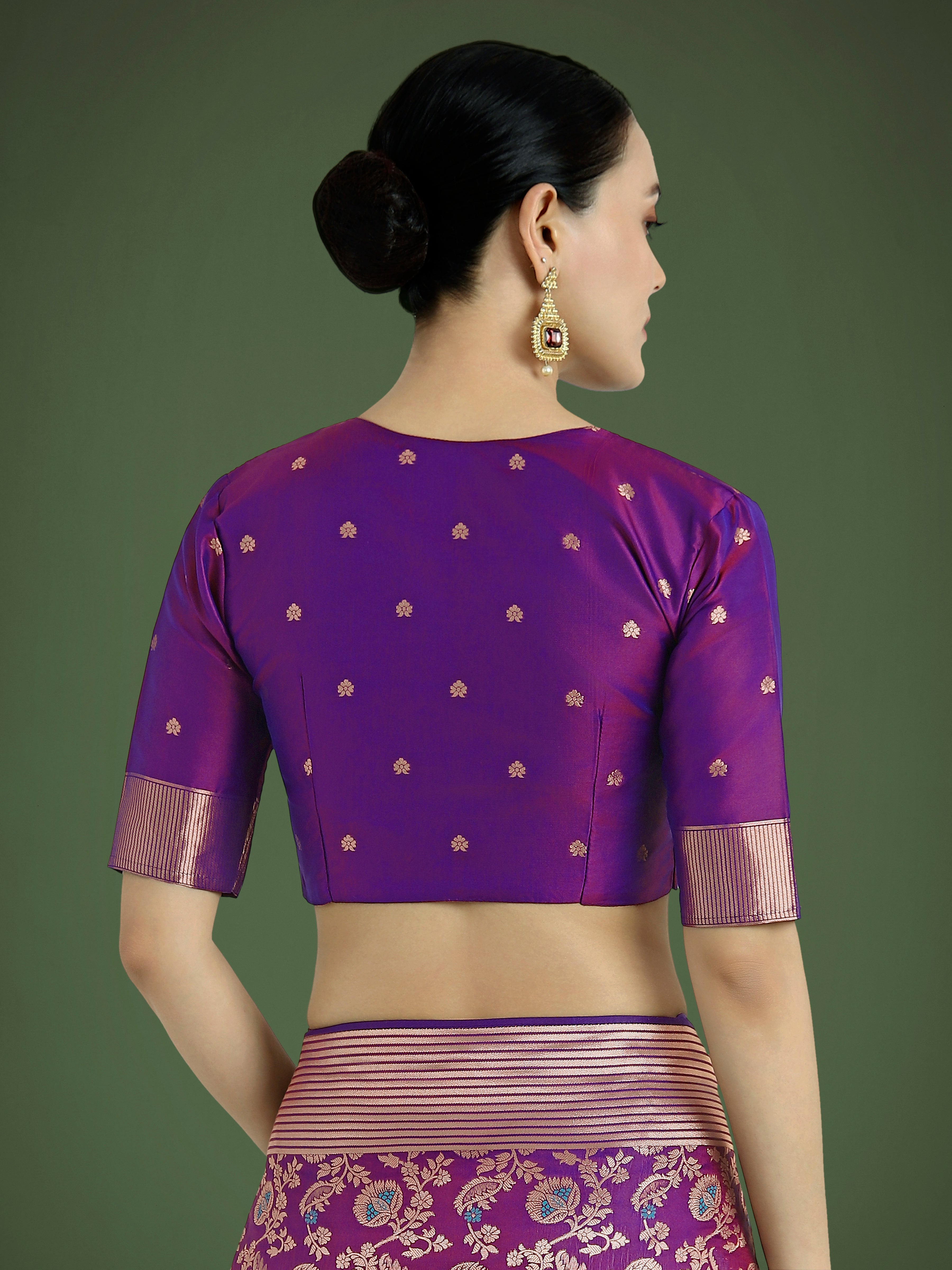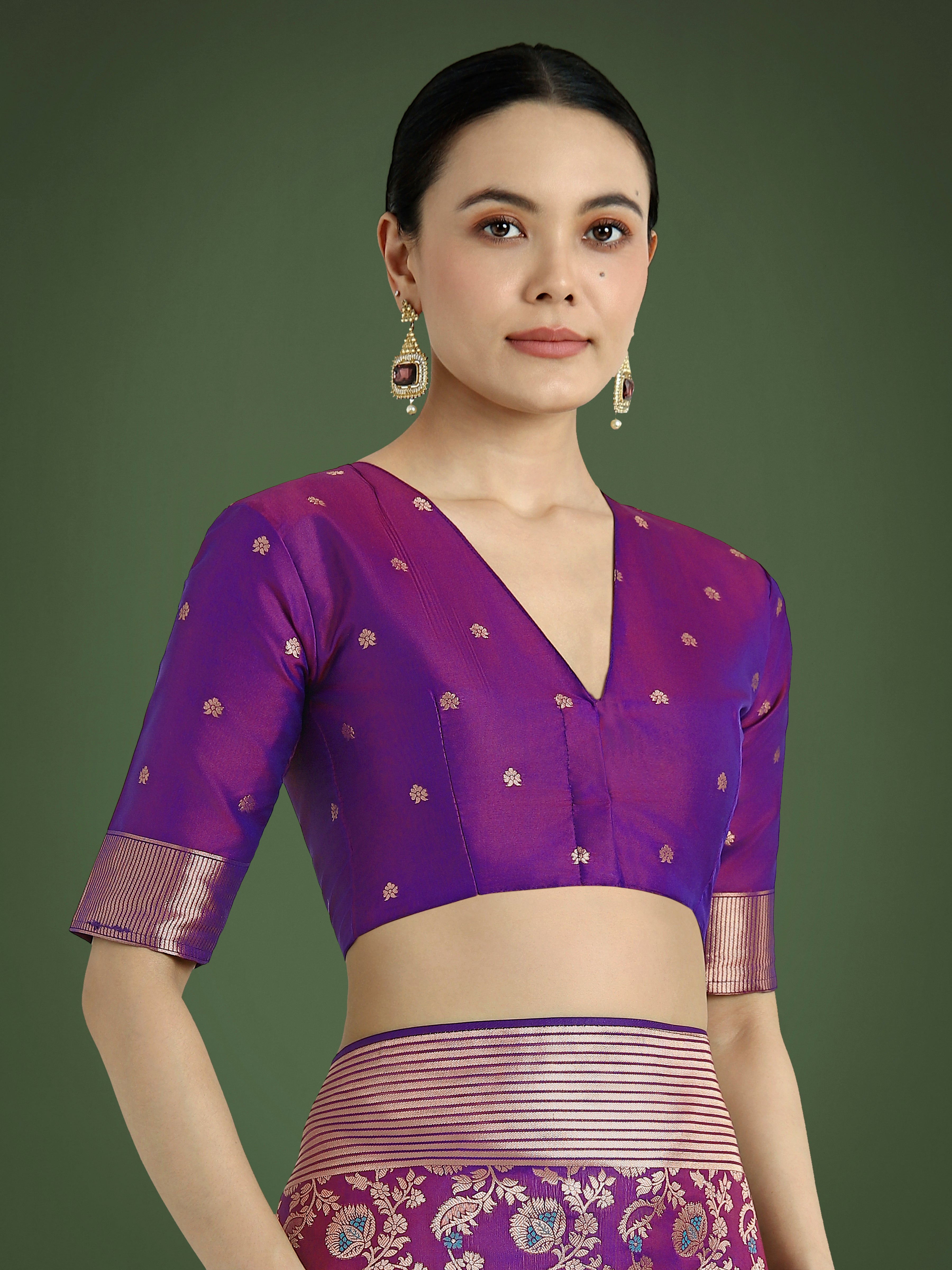 Style and pattern would be on the peak of your elegance after you dresses this Purple Banarasi silk trendy saree. The stunning weaving work in the course of the attire is awe inspiring. Comes with matching blouse. (Slight variation in color, fabric & work is possible. Model images are only representative.)