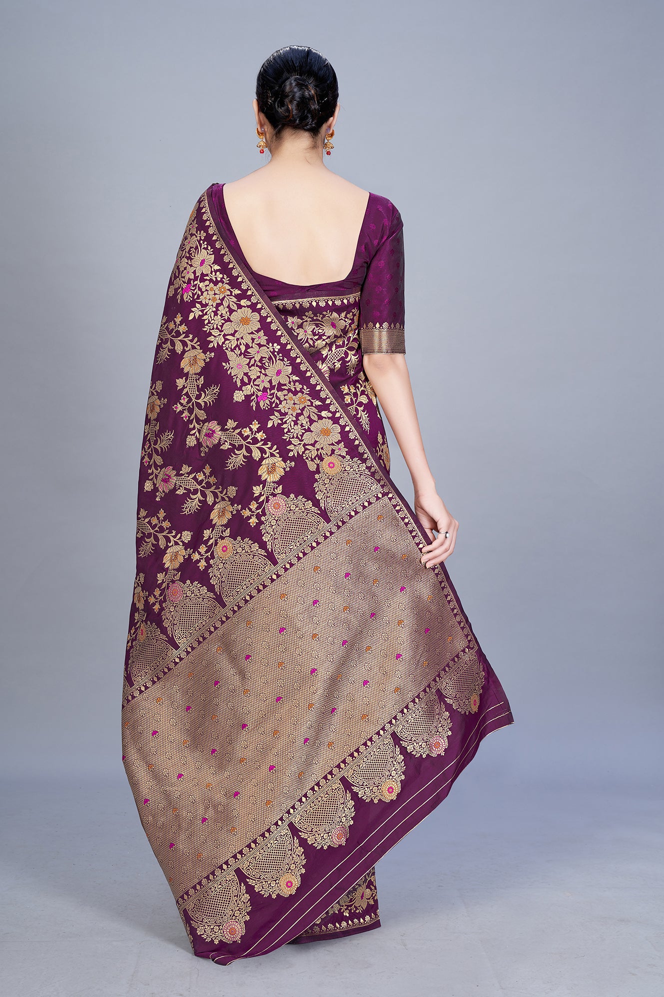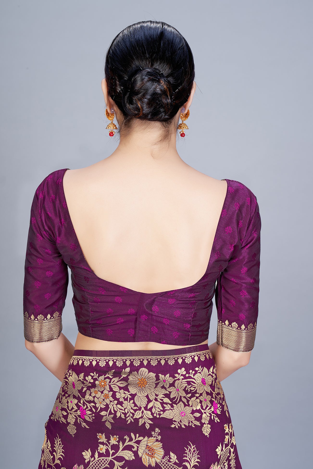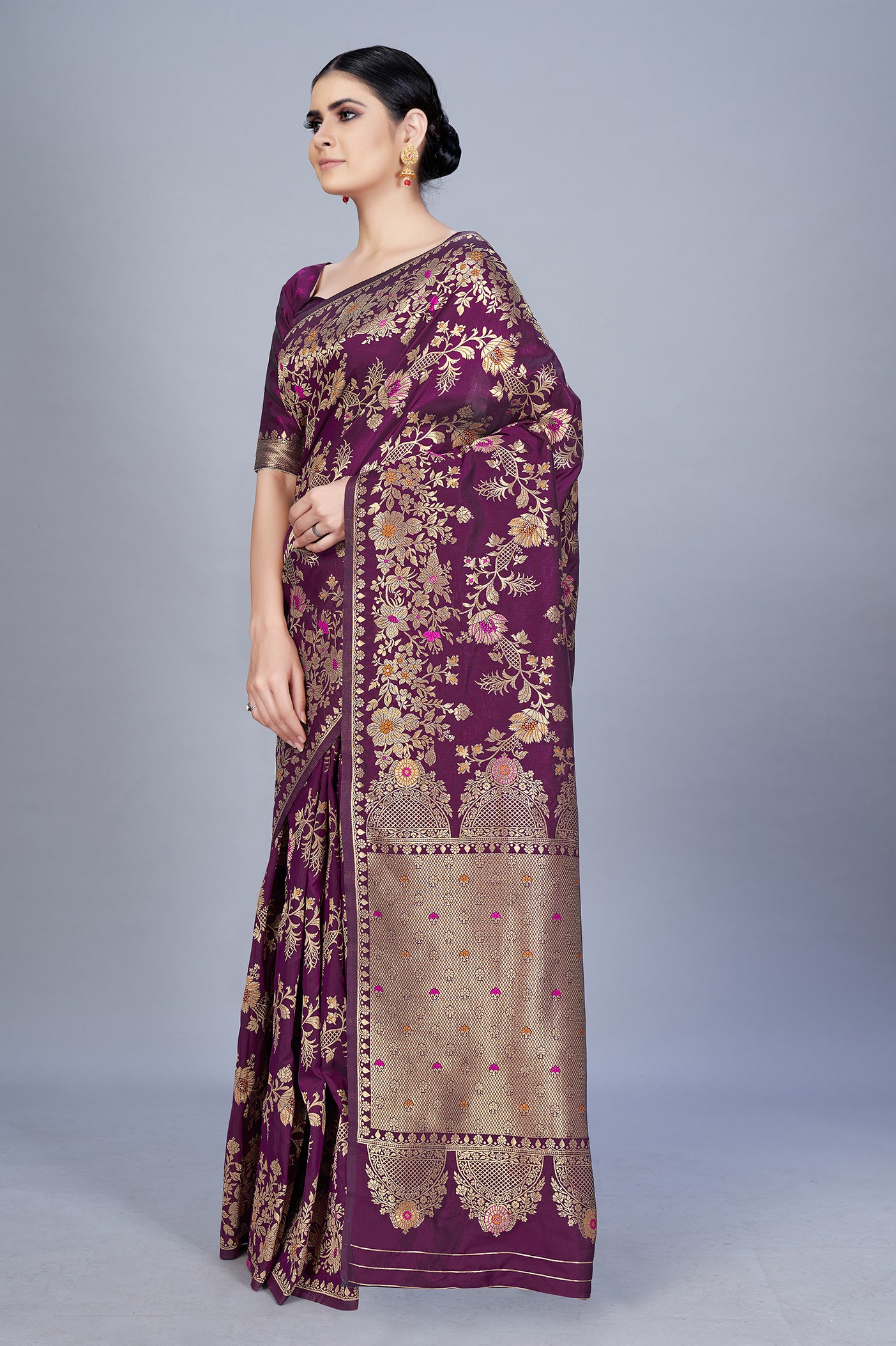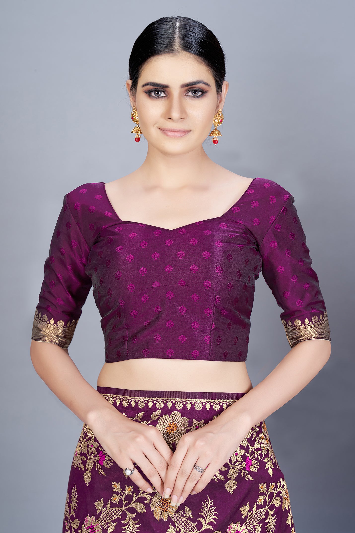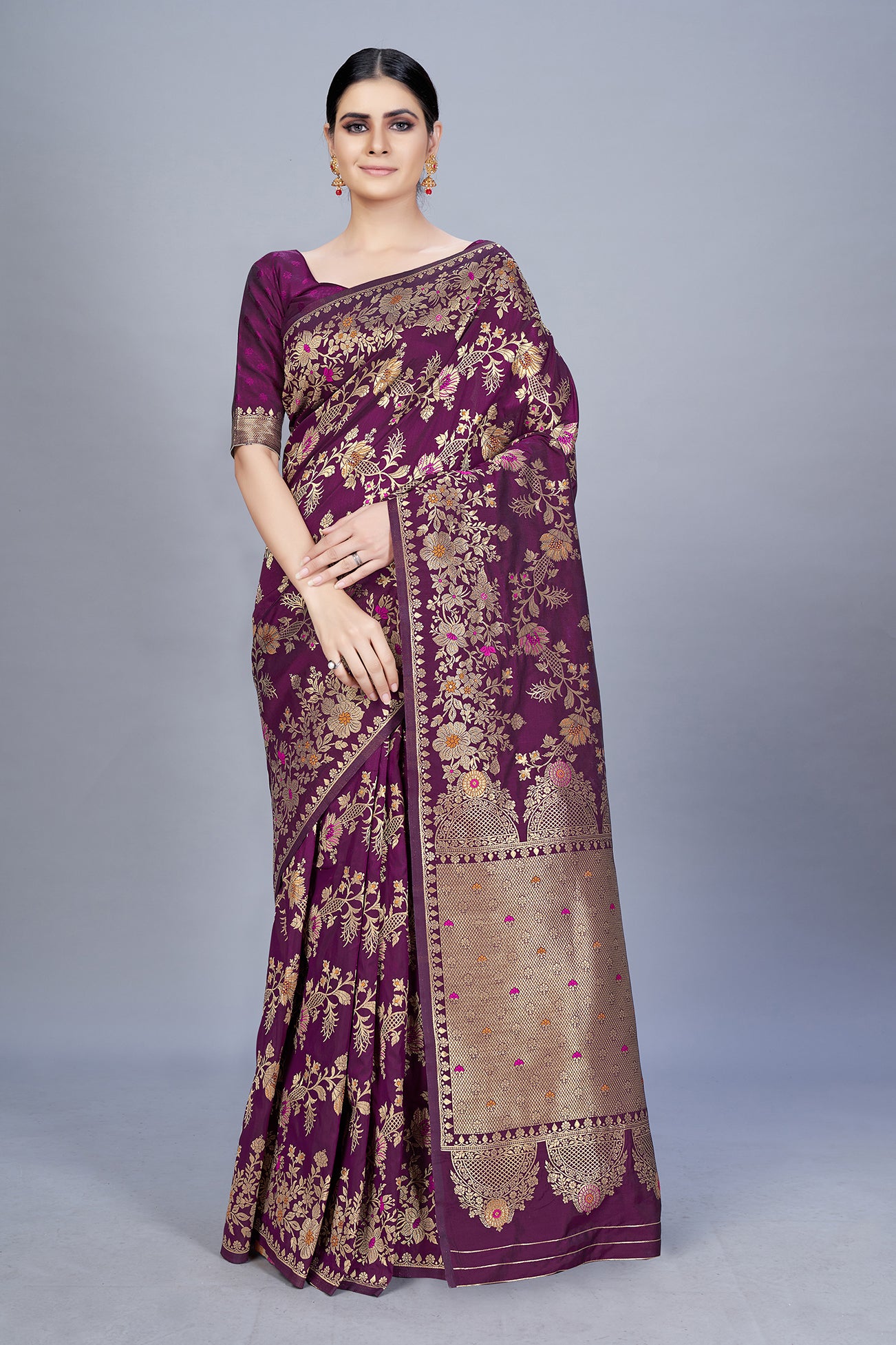 This brilliant array will make you the ultimate classic beauty at the next event you attend. Create a smoldering impact by this Purple silk trendy saree. This ravishing attire is amazingly Zari with weaving work. Comes with matching blouse. (Slight variation in color, fabric & work is possible. Model images are only representative.)