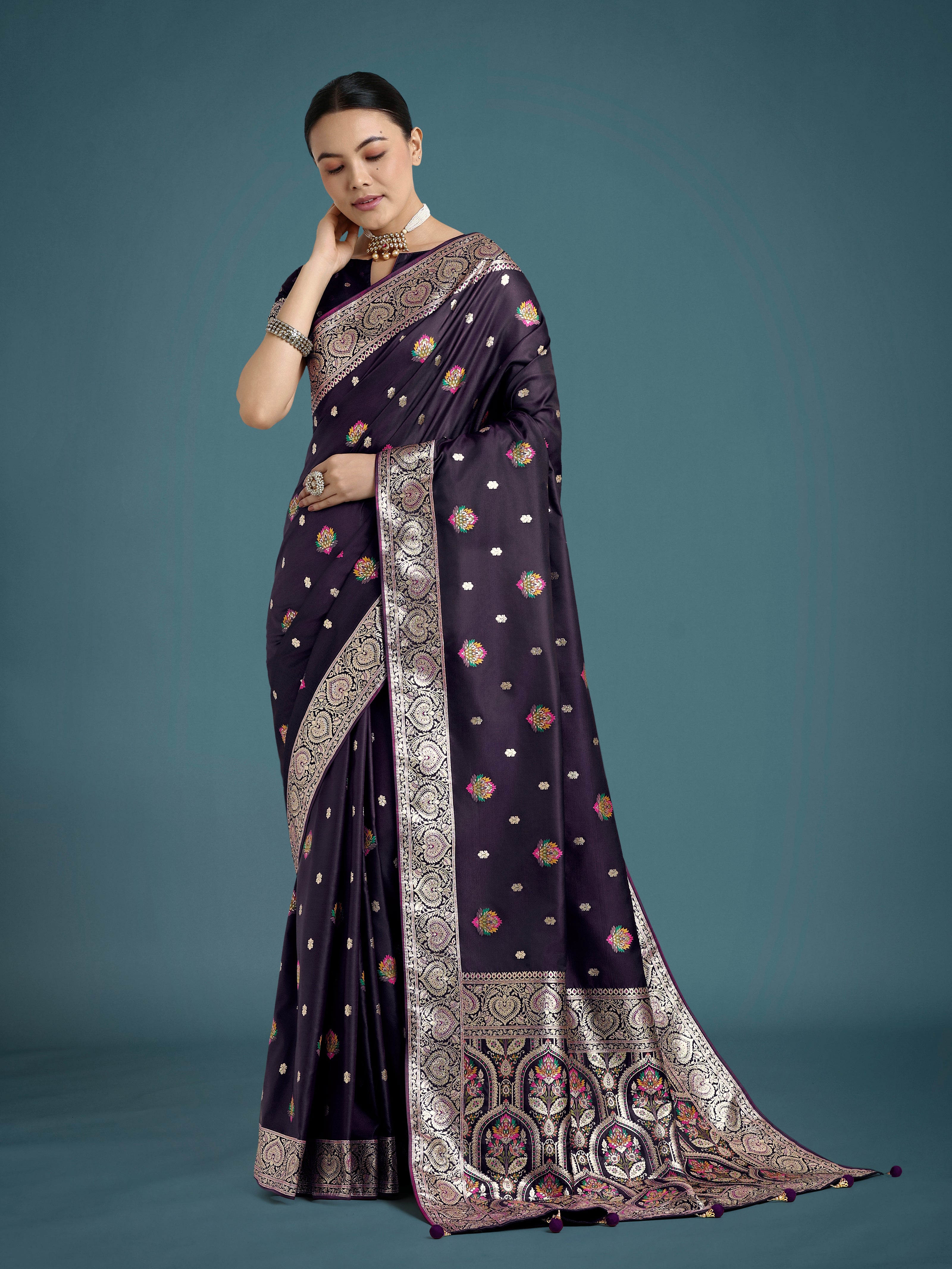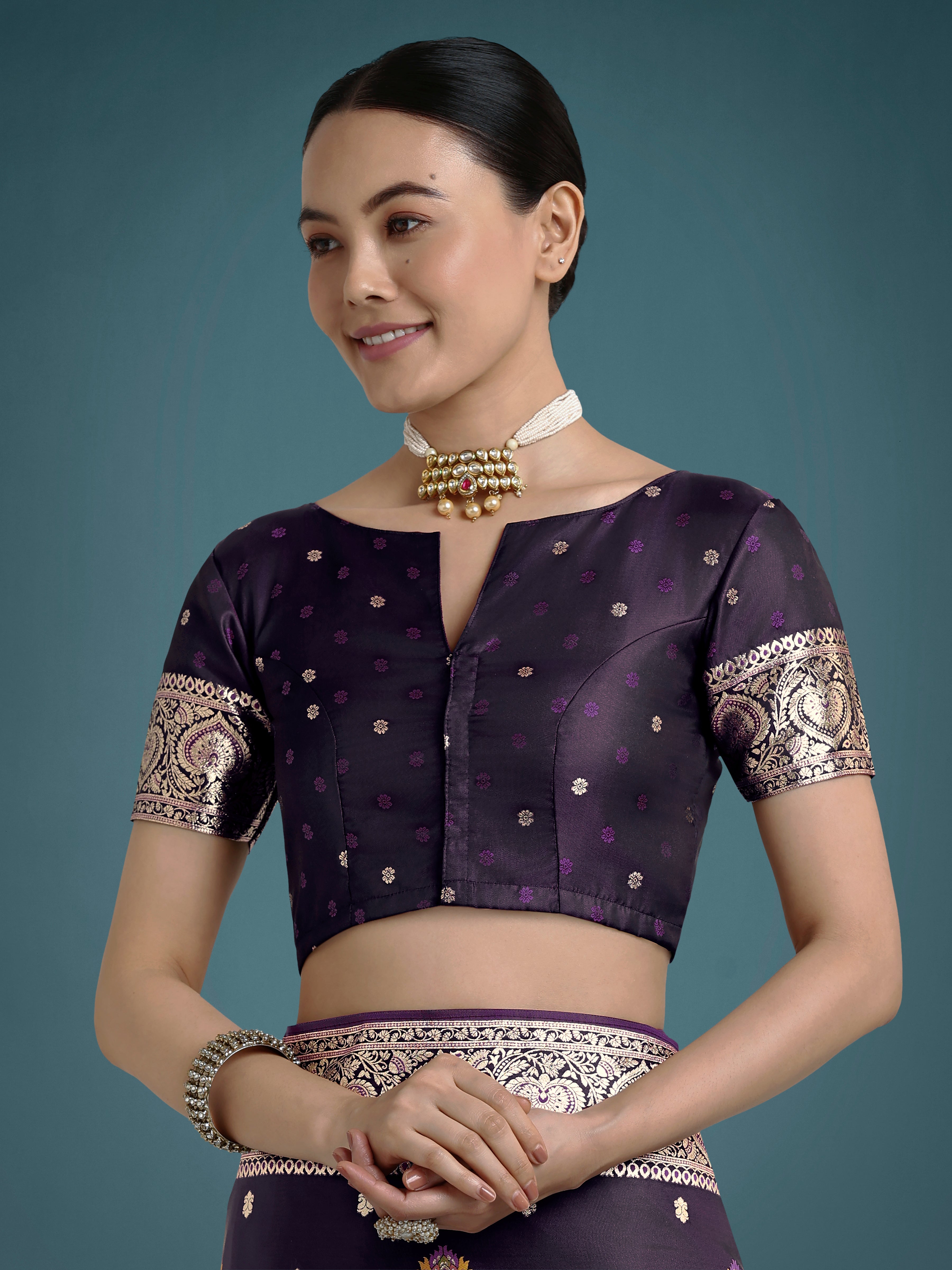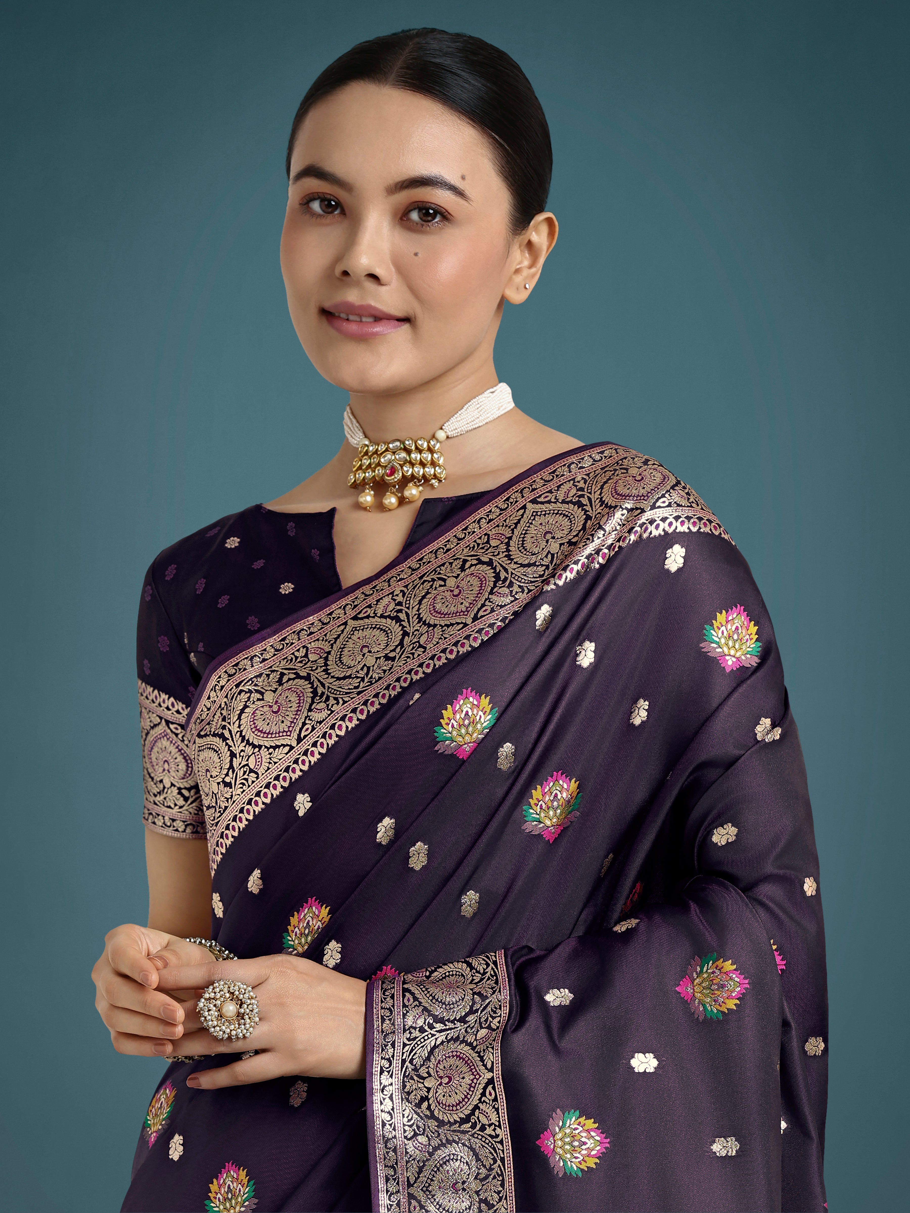 This pretty piece is a fairy tale that begins to unfold as you reveal your beauty in it. We unfurl our the intricacy and exclusivity of our creations highlighted in this lovely Purple banarasi satin silk contemporary saree. The brilliant attire creates a dramatic canvas with amazing zari woven work. Comes with matching blouse. (Slight variation in color, fabric & work is possible. Model images are only representative.)