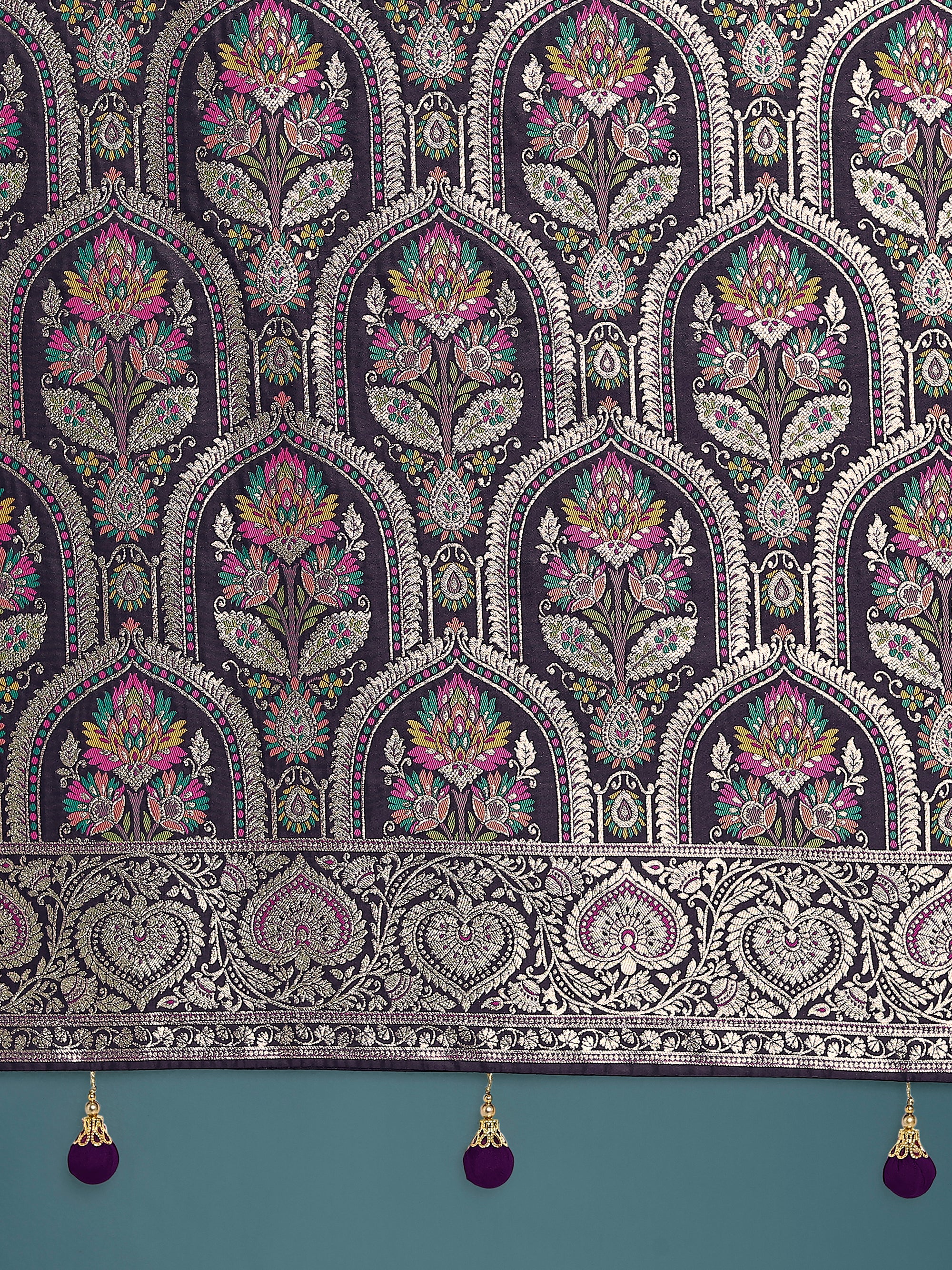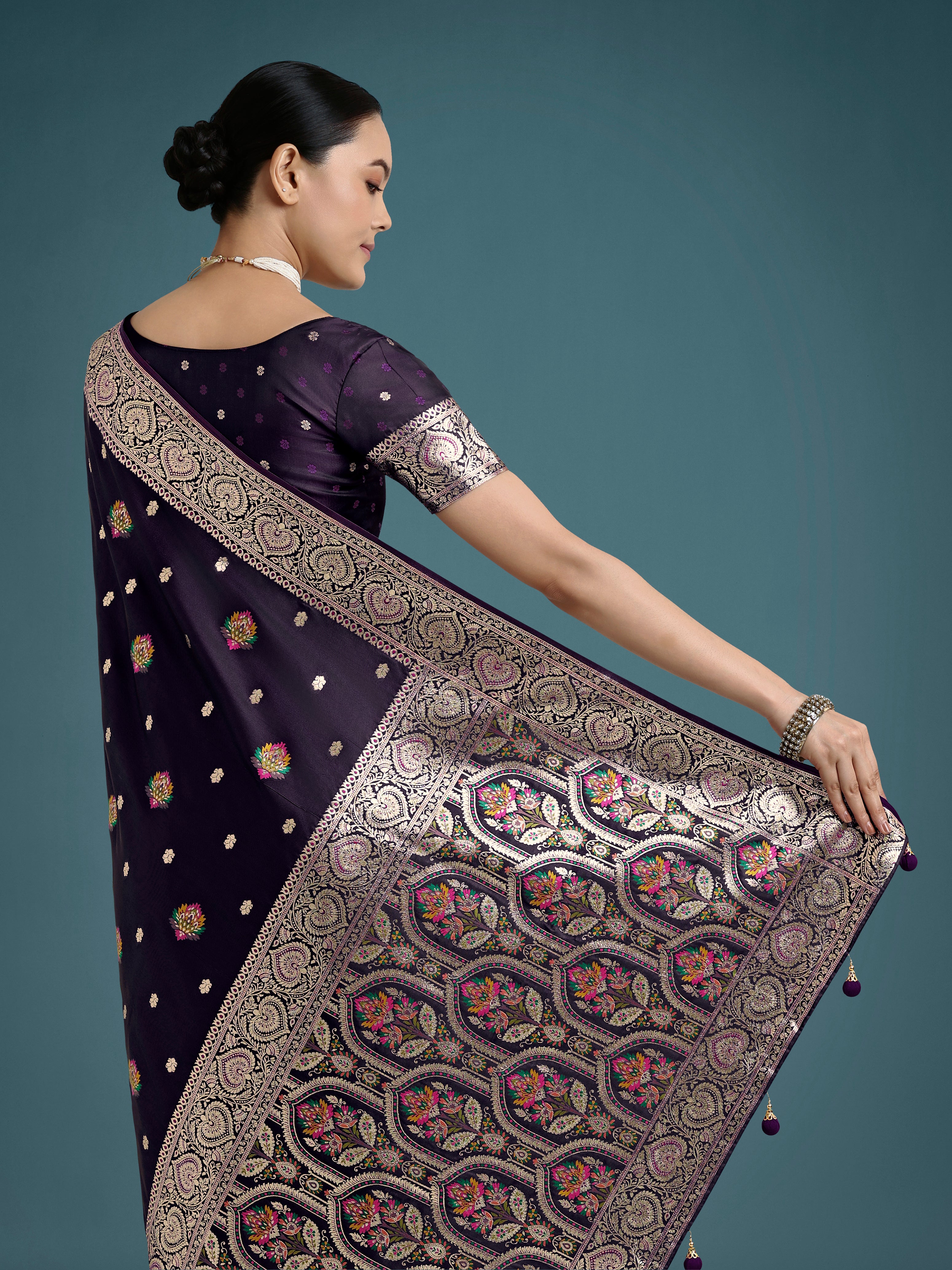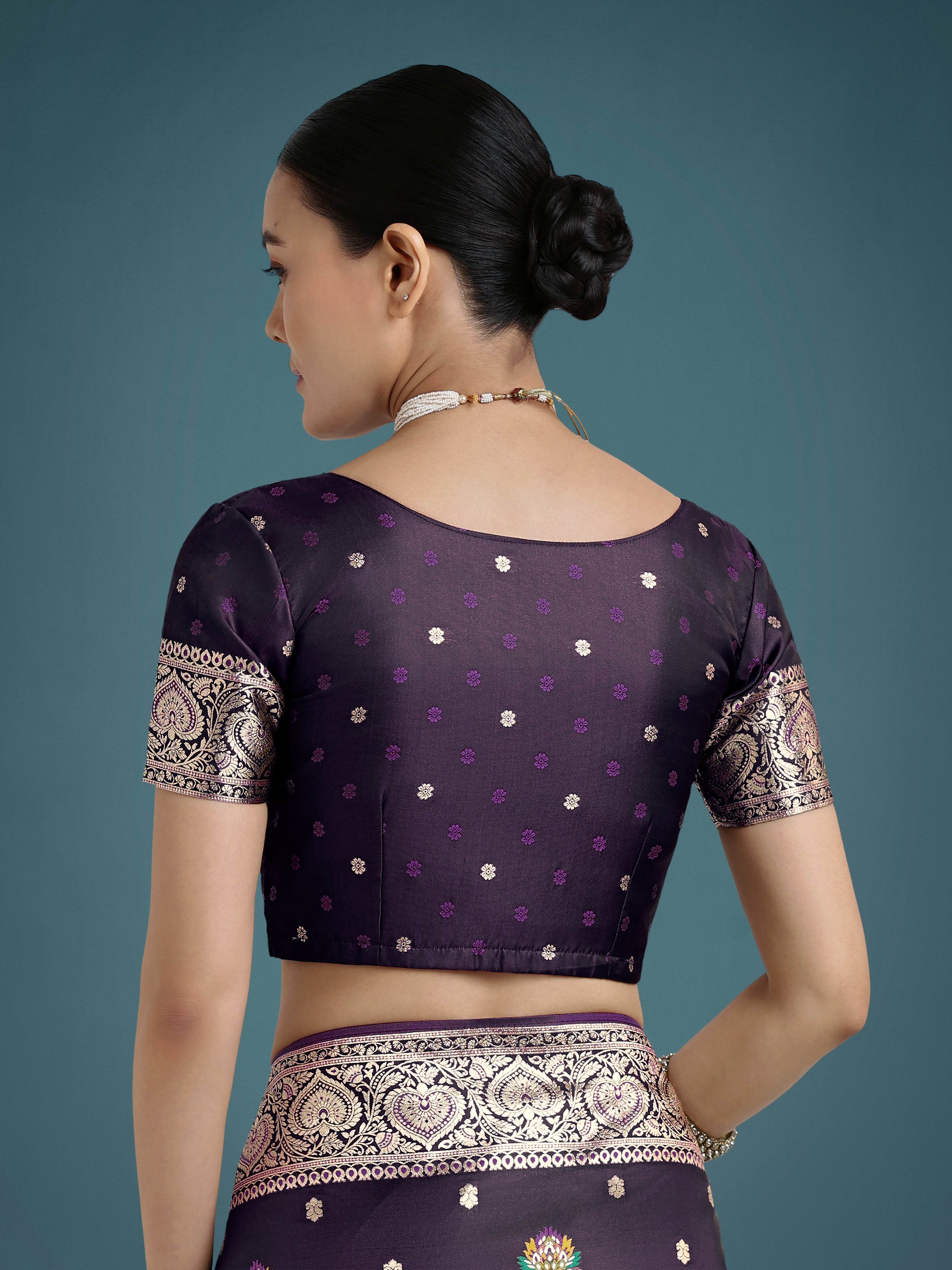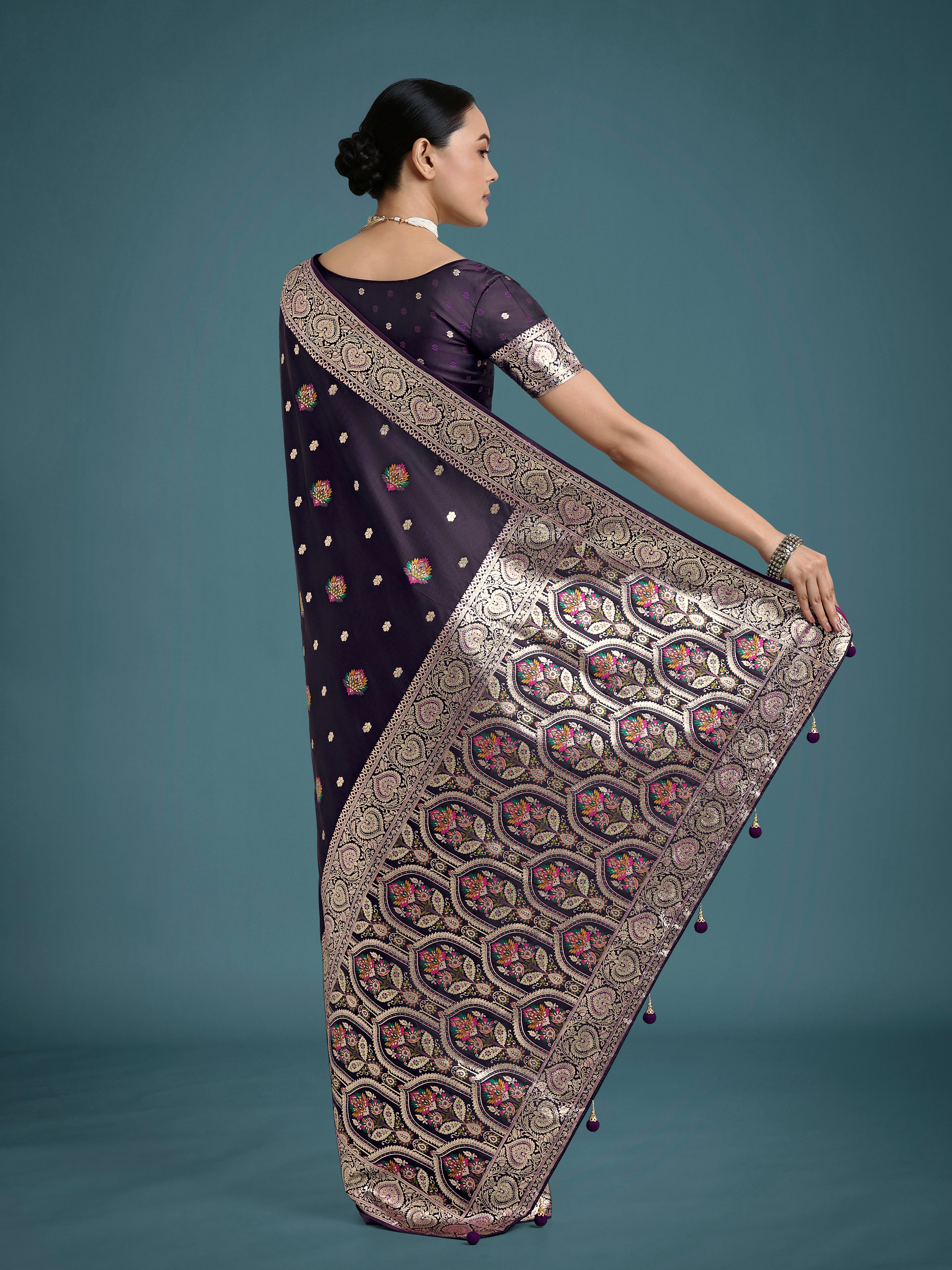 This pretty piece is a fairy tale that begins to unfold as you reveal your beauty in it. We unfurl our the intricacy and exclusivity of our creations highlighted in this lovely Purple banarasi satin silk contemporary saree. The brilliant attire creates a dramatic canvas with amazing zari woven work. Comes with matching blouse. (Slight variation in color, fabric & work is possible. Model images are only representative.)