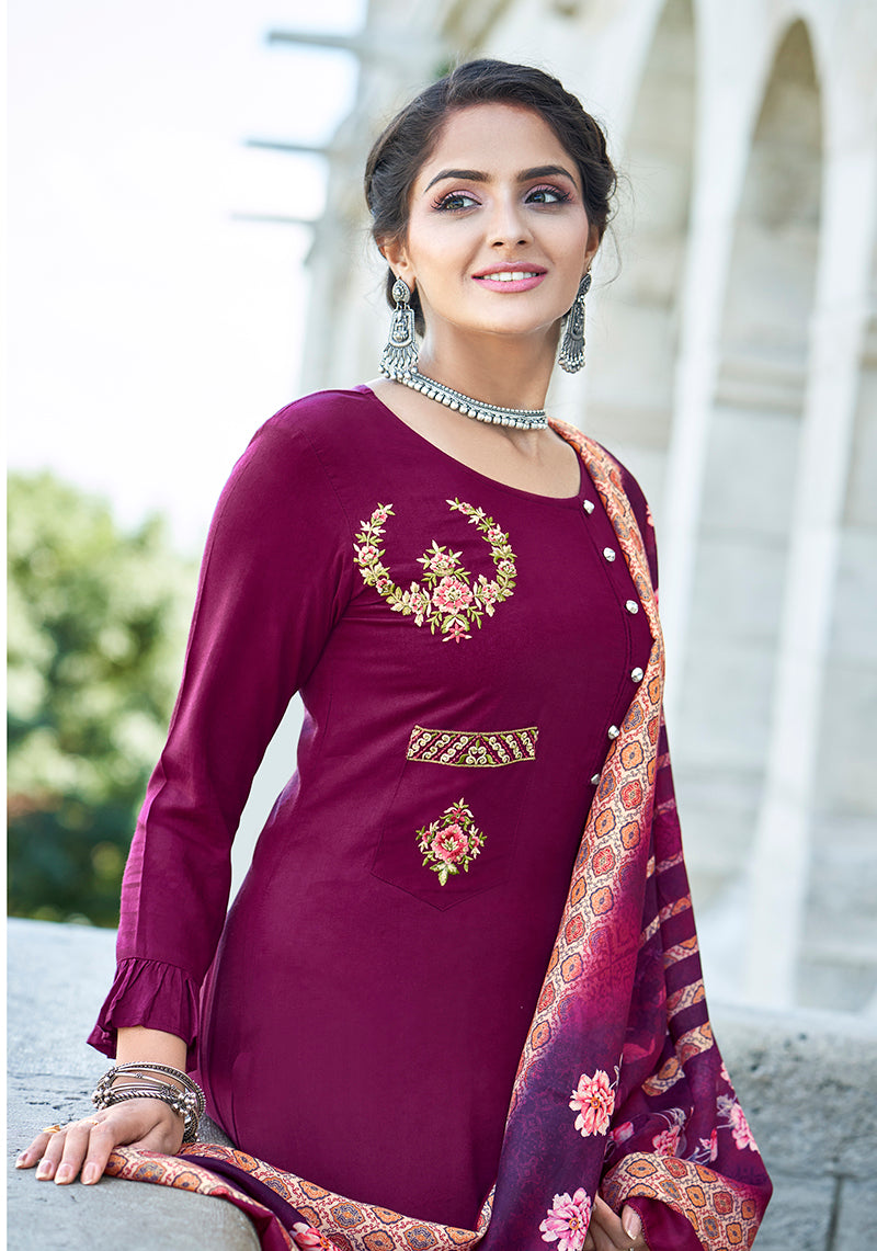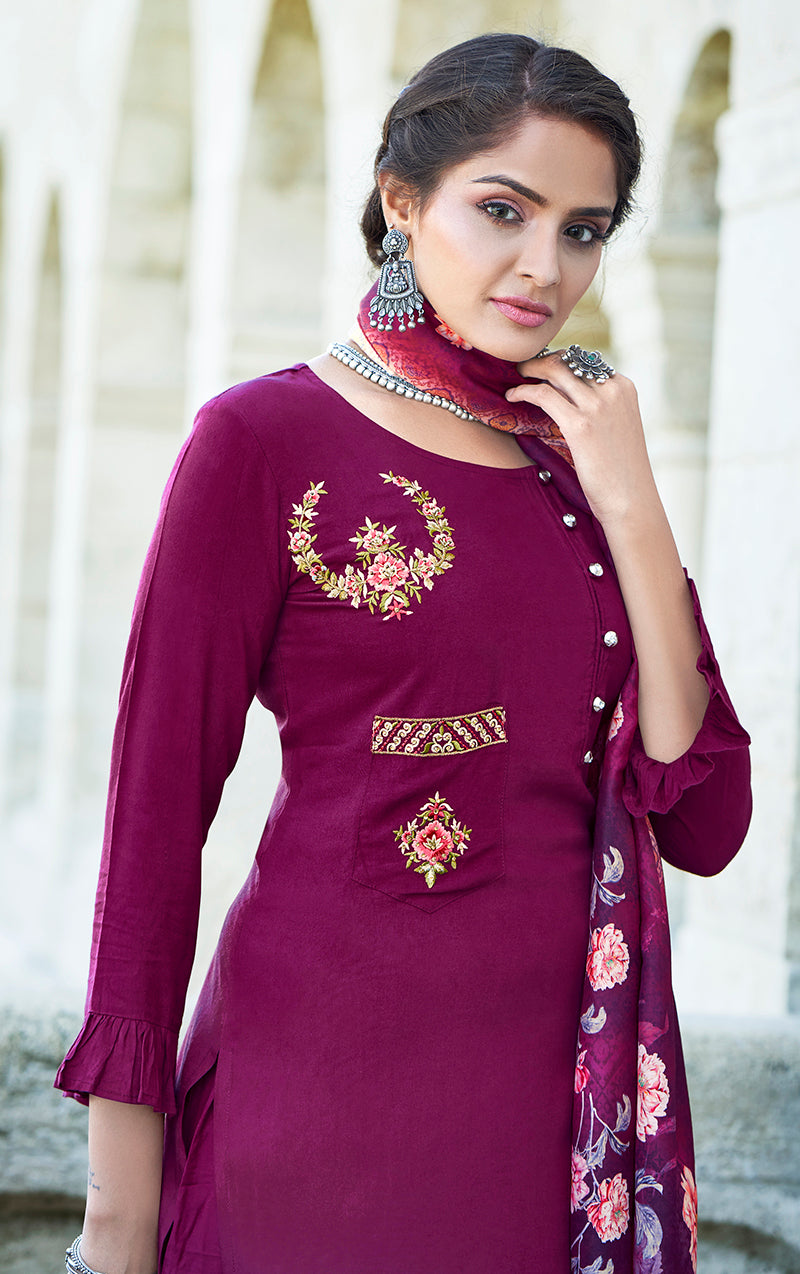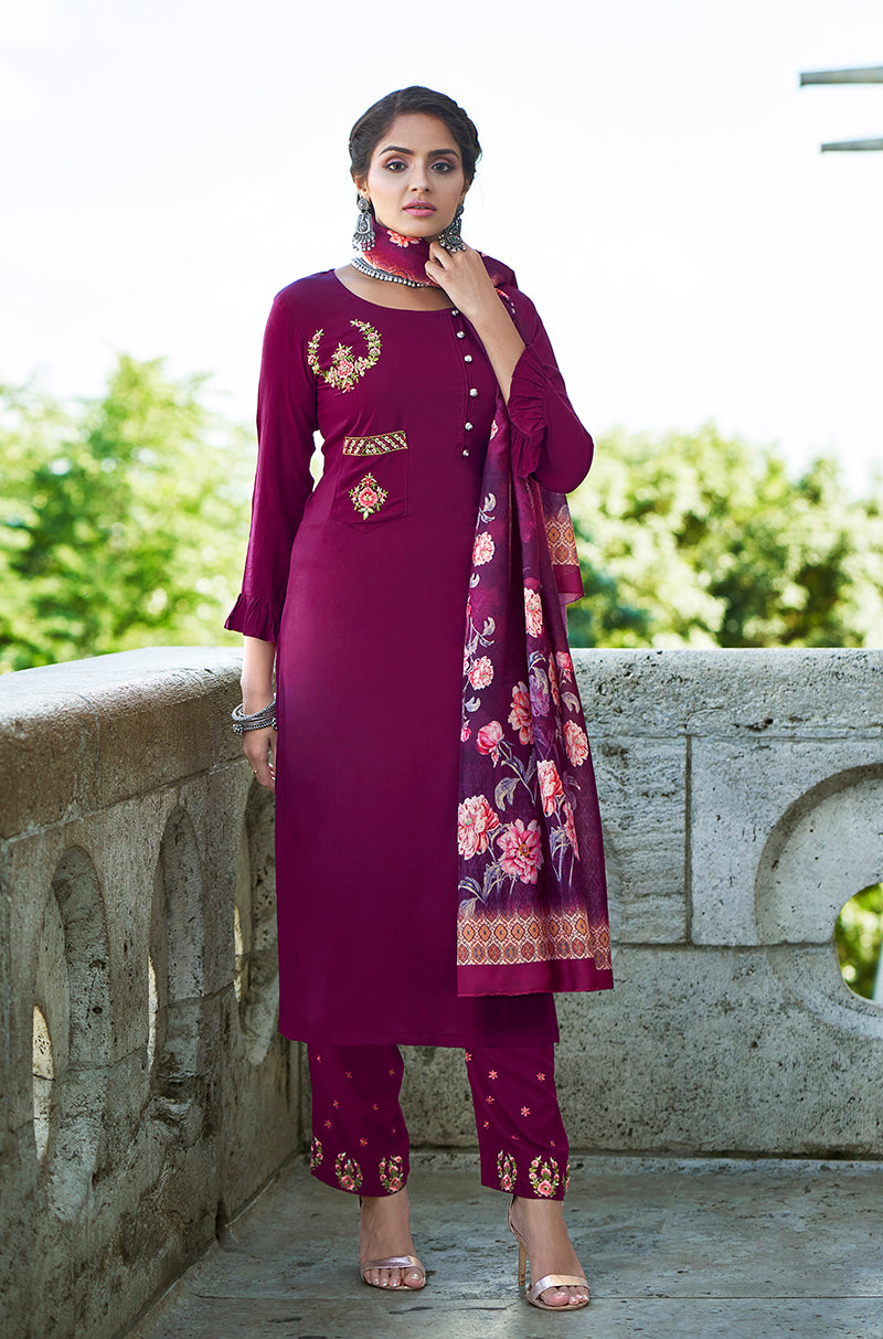 Make the heads turn whenever you costume up in this Purple Rayon designer salwar kameez. The floral sequence work appears chic and fantastic for festival and party. Comes with matching bottom and dupatta.