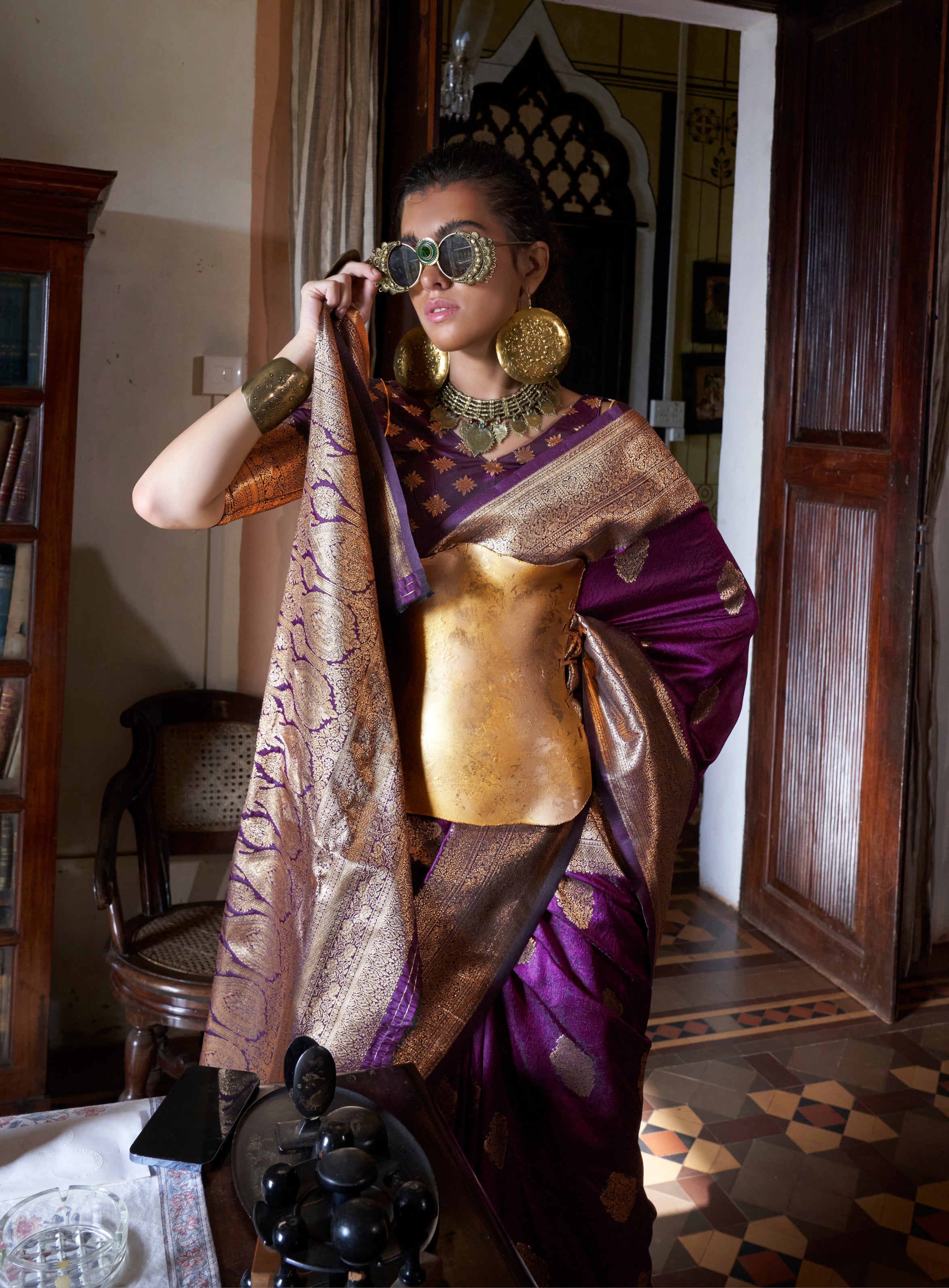 If you are a diva who loves to turn heads wherever you go and this delightful drape is a must have item for your closet. Fashion and trend will be at the peak of your magnificence the moment you dresses this Purple twotone weaving silk classic saree. This engaging attire is displaying some amazing done with weaving zari work. Comes with matching brocade blouse. (Slight variation in color, fabric & work is possible. Model images are only representative.)