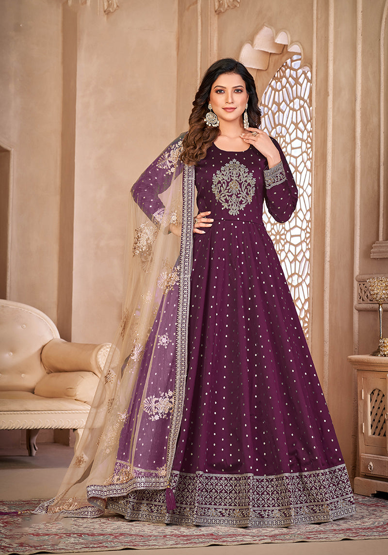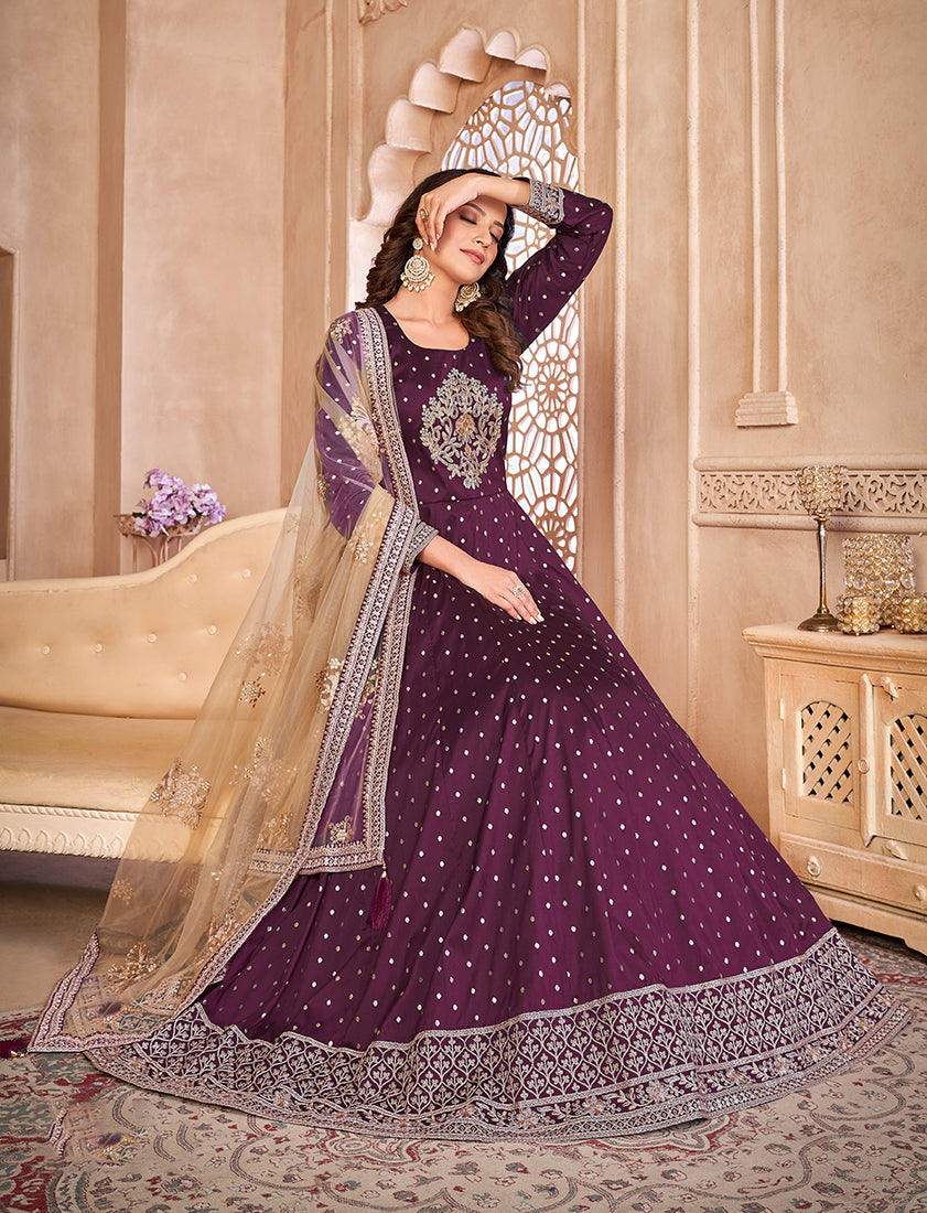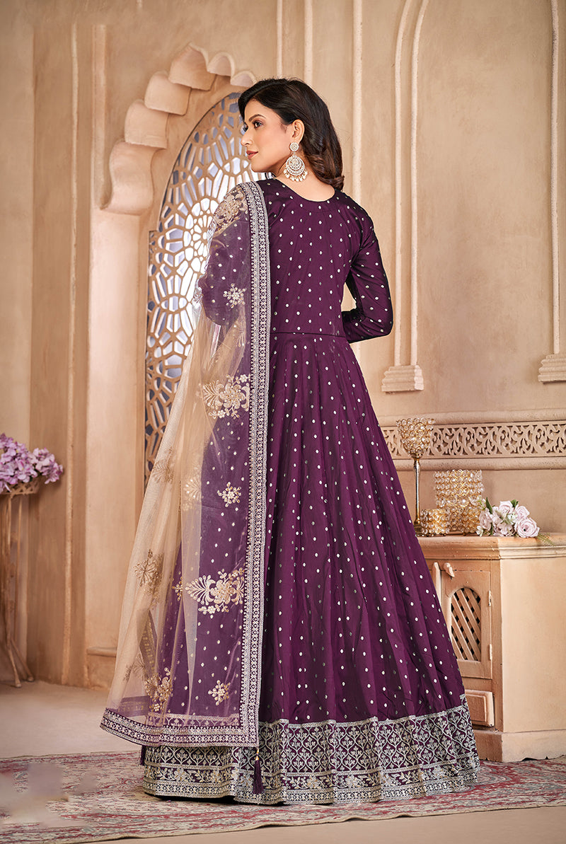 Look sensationally awesome with this Purple Color Taffeta Butti Anarkali salwar suit. The fantastic attire creates a dramatic canvas with wonderful embroidered and resham work. Comes with matching santoon bottom and net dupatta.